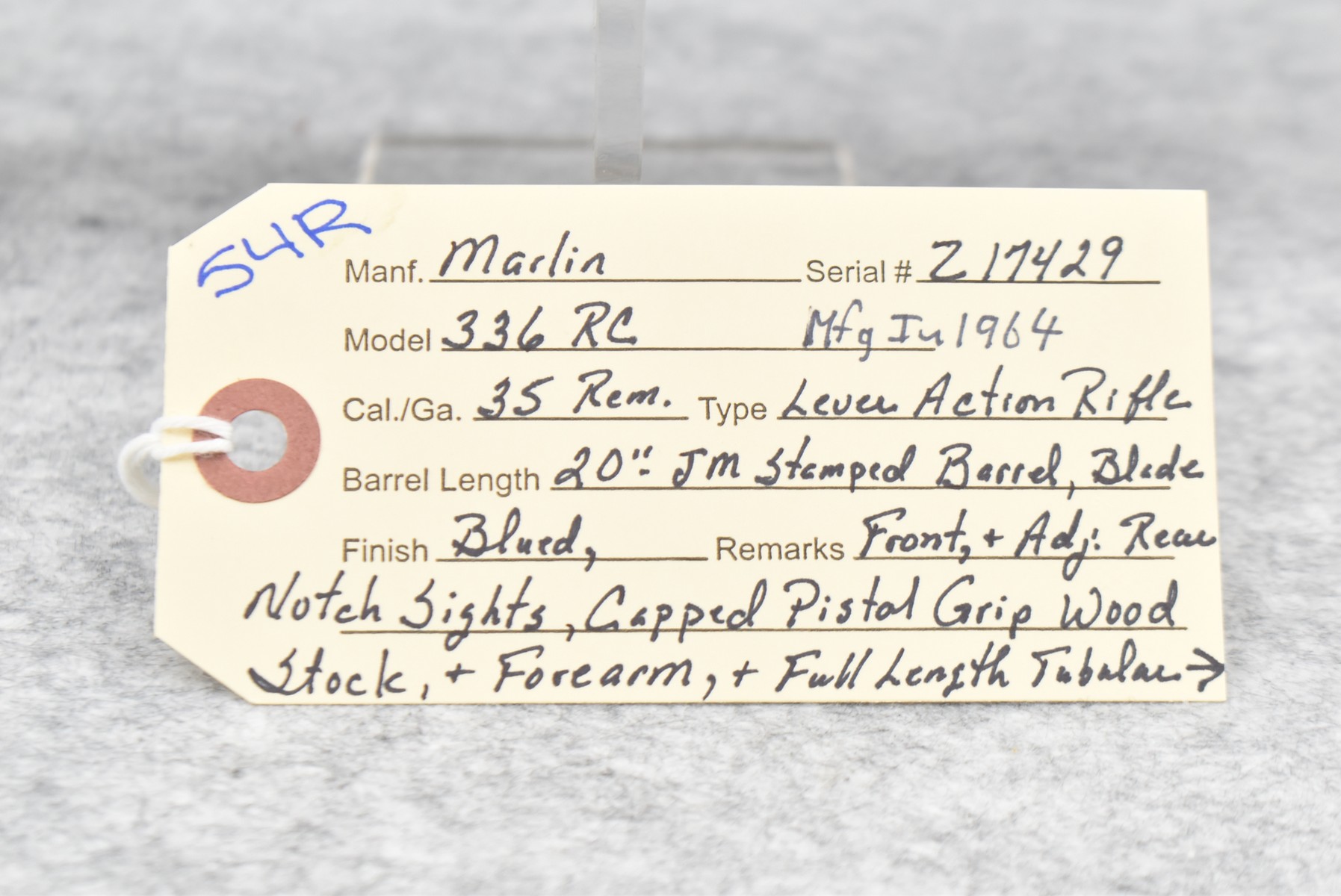 54R. Marlin – Mod. 336 RC – 35 Rem. Cal. Lever Action Rifle – w/20” JM Stamped Barrel w/Blade Front & Adj. Rear Notch Sights w/Full Length Tubular Magazine – Blued Finish – w/Capped Pistol Grip Wood Stocks w/Factory Butt Plate – w/Sling Swivels – Mfg. in 1964