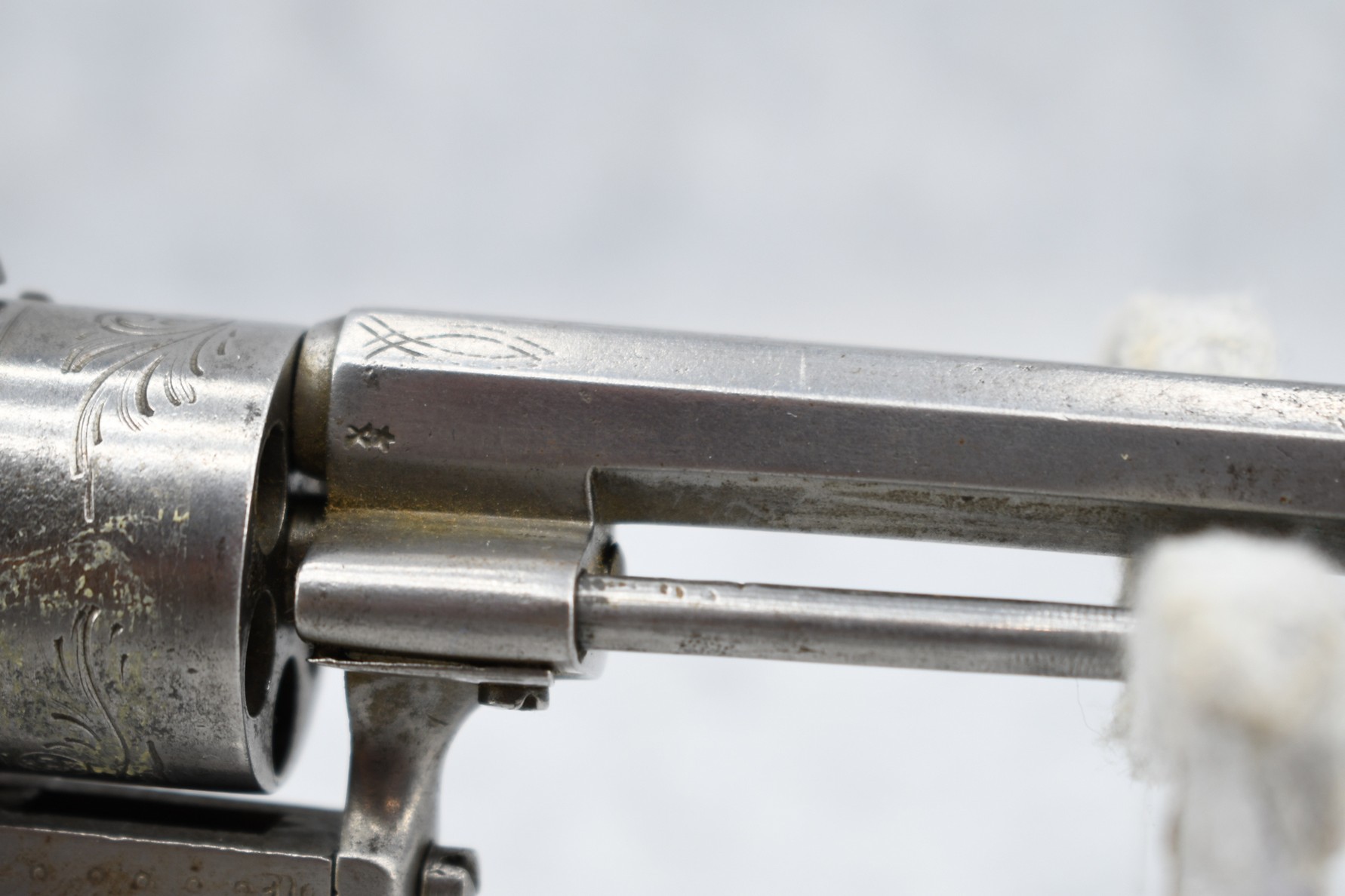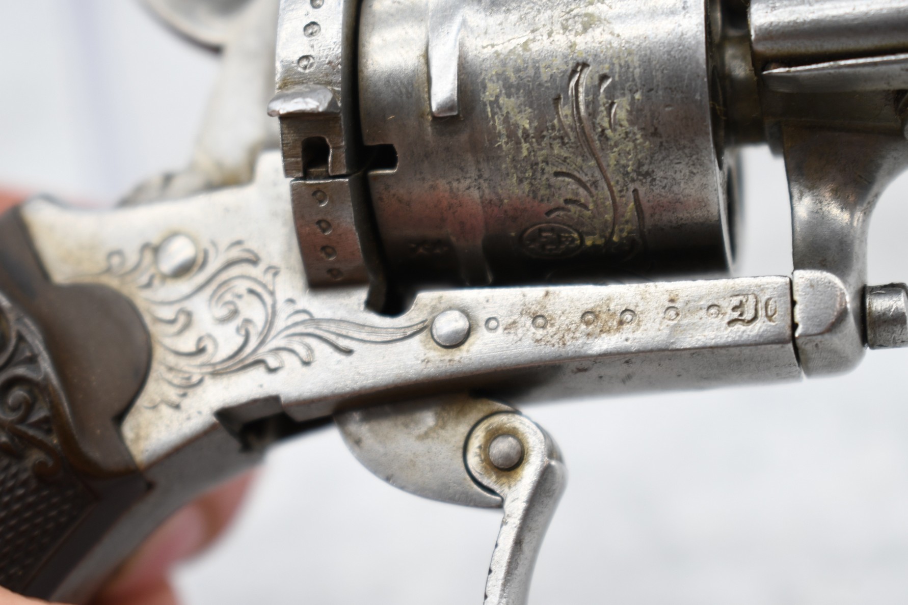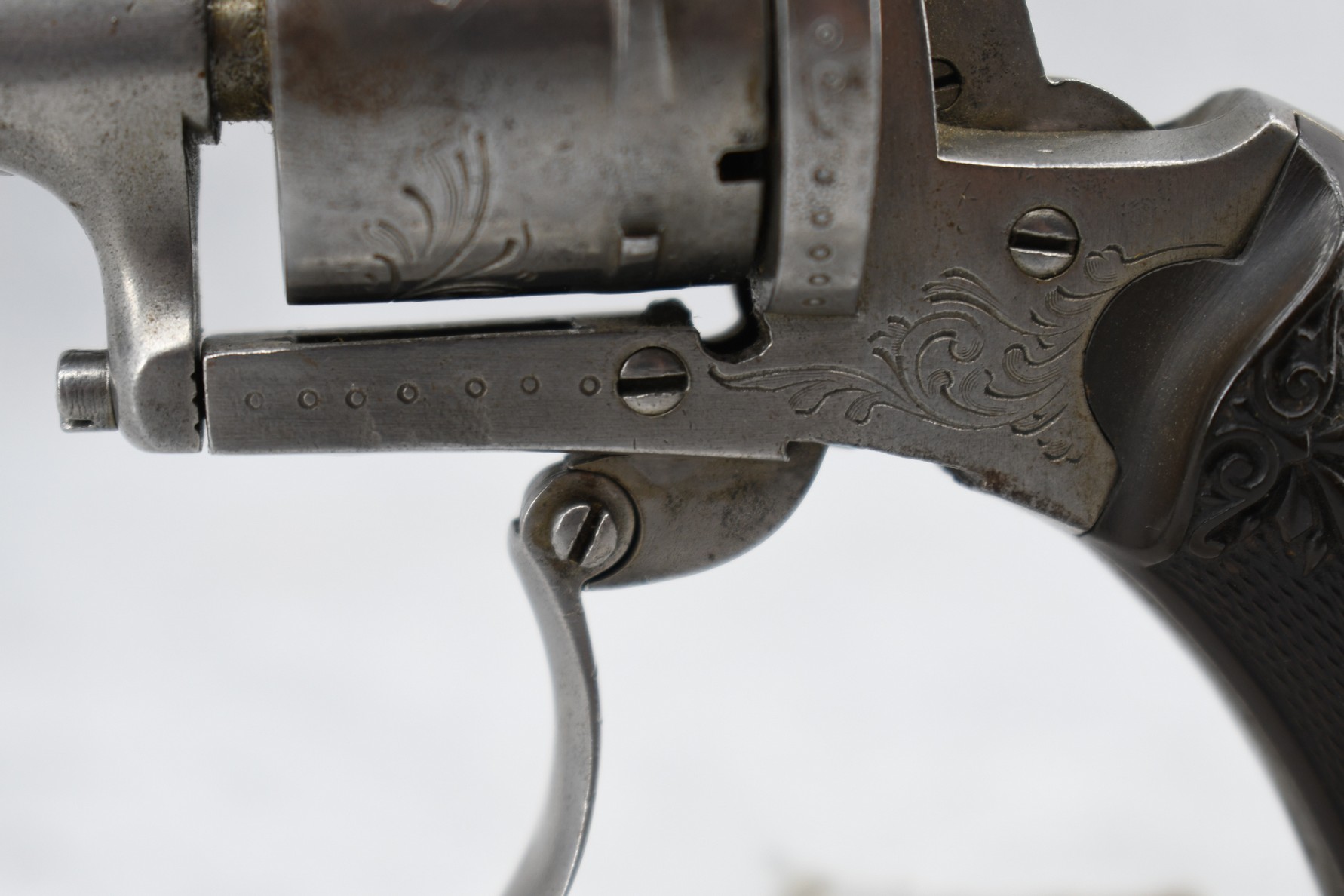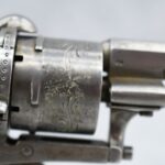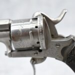558. Belgin/French – Mod. 7.65mm/30 Cal. Single Action Pinfire Revolver – w/3 ¼” Octagon Barrel w/Factory Sights – Gray Finish – w/Enhanced Frame – w/Checked & Decorated Brown Hard Rubber Grips