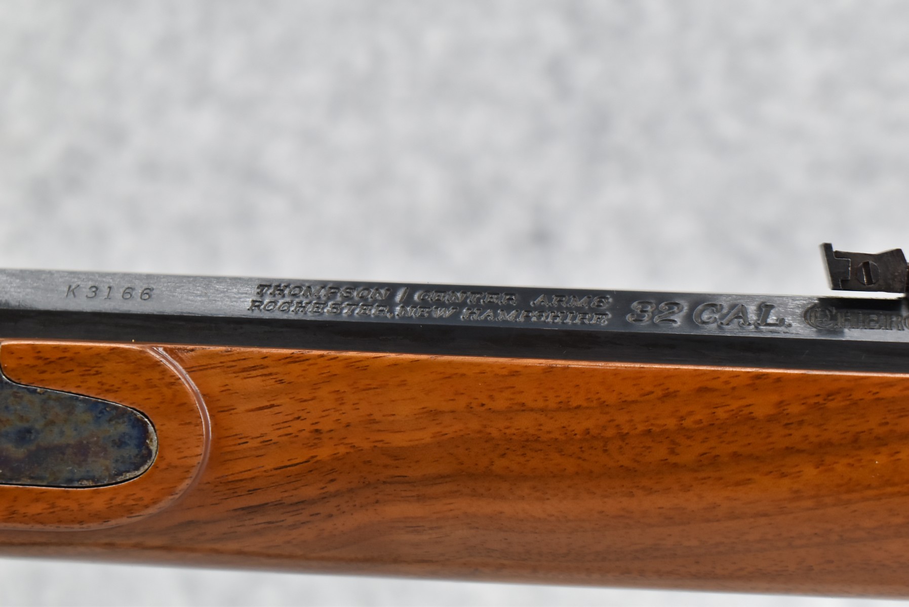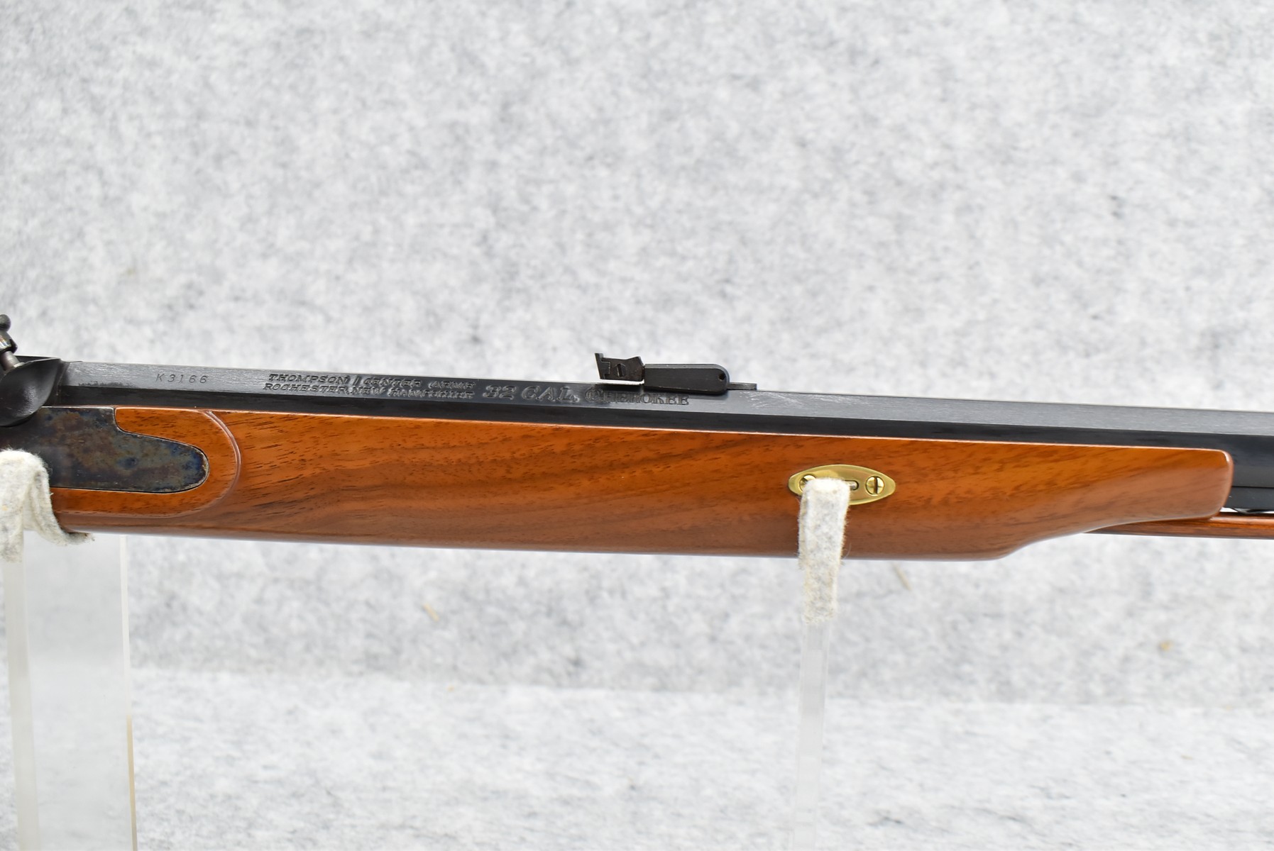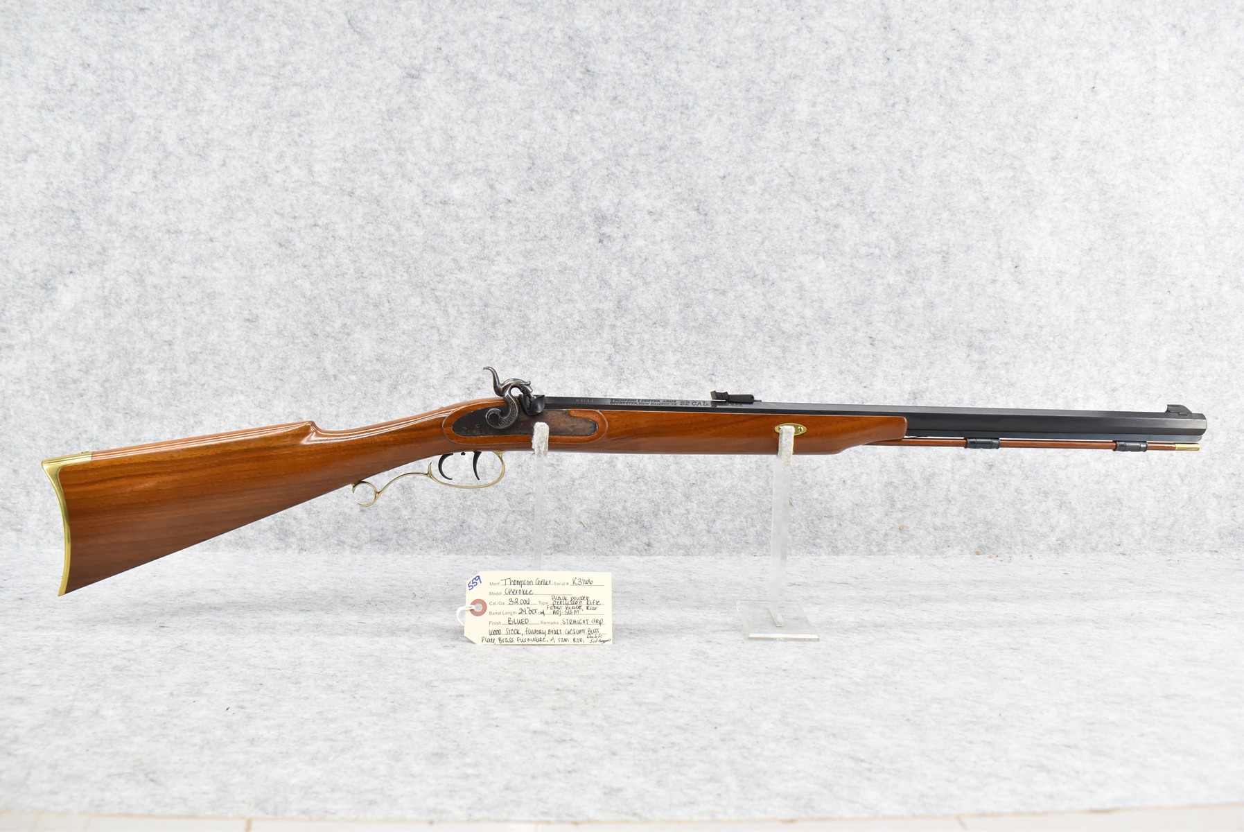 559. Thompson Center – Mod. Cherokee – 32 Cal. Percussion Black Powder Rifle – w/24” Octagon Barrel w/Front Blade & Rear Adj. Sights – Blued Finish – w/Straight Grip Wood Stock w/Factory Brass Crescent Butt Plate & Brass Furniture – w/Double Set Triggers – w/Ram Rod