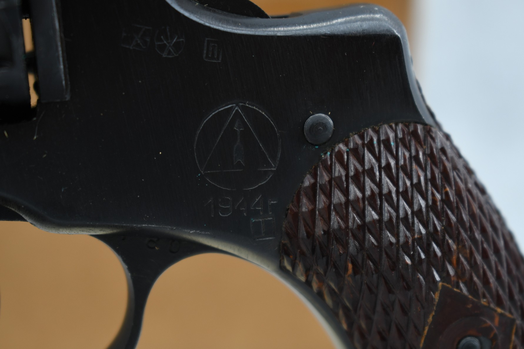 563R. Russian – Mod. 1895 – 7.62 Nagant (7.62x38mmR) Cal. Double Action Revolver – w/4.5” Barrel w/Front Blade & Grooved Rear Sights – Blued Finish – w/Checkered Brown Bakelite Grip – w/Lanyard – w/Cleaning Rod & Wooden Handle Tooled – Dated 1944 – Import Marked