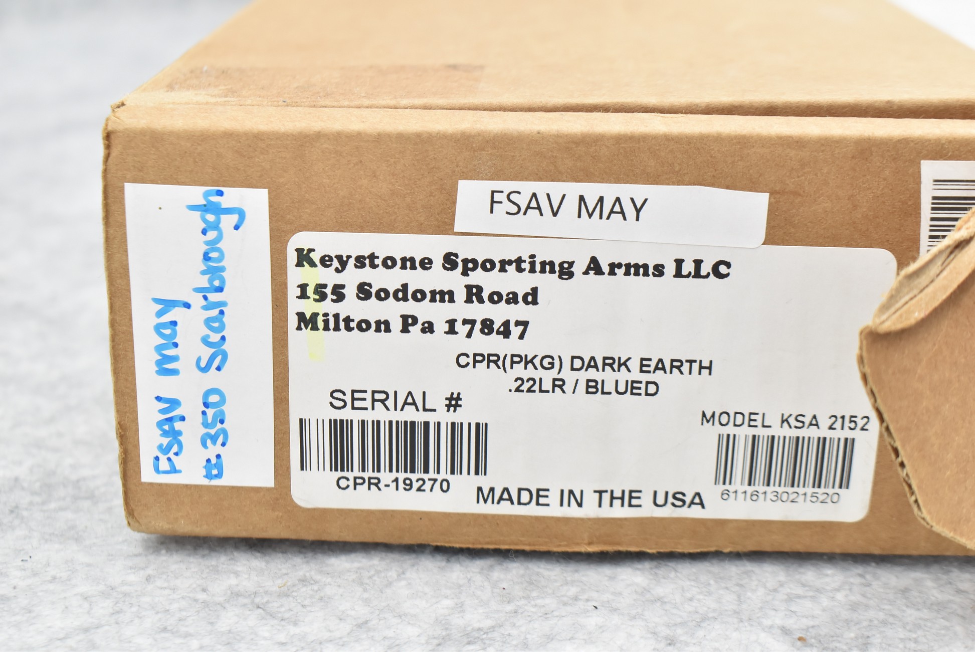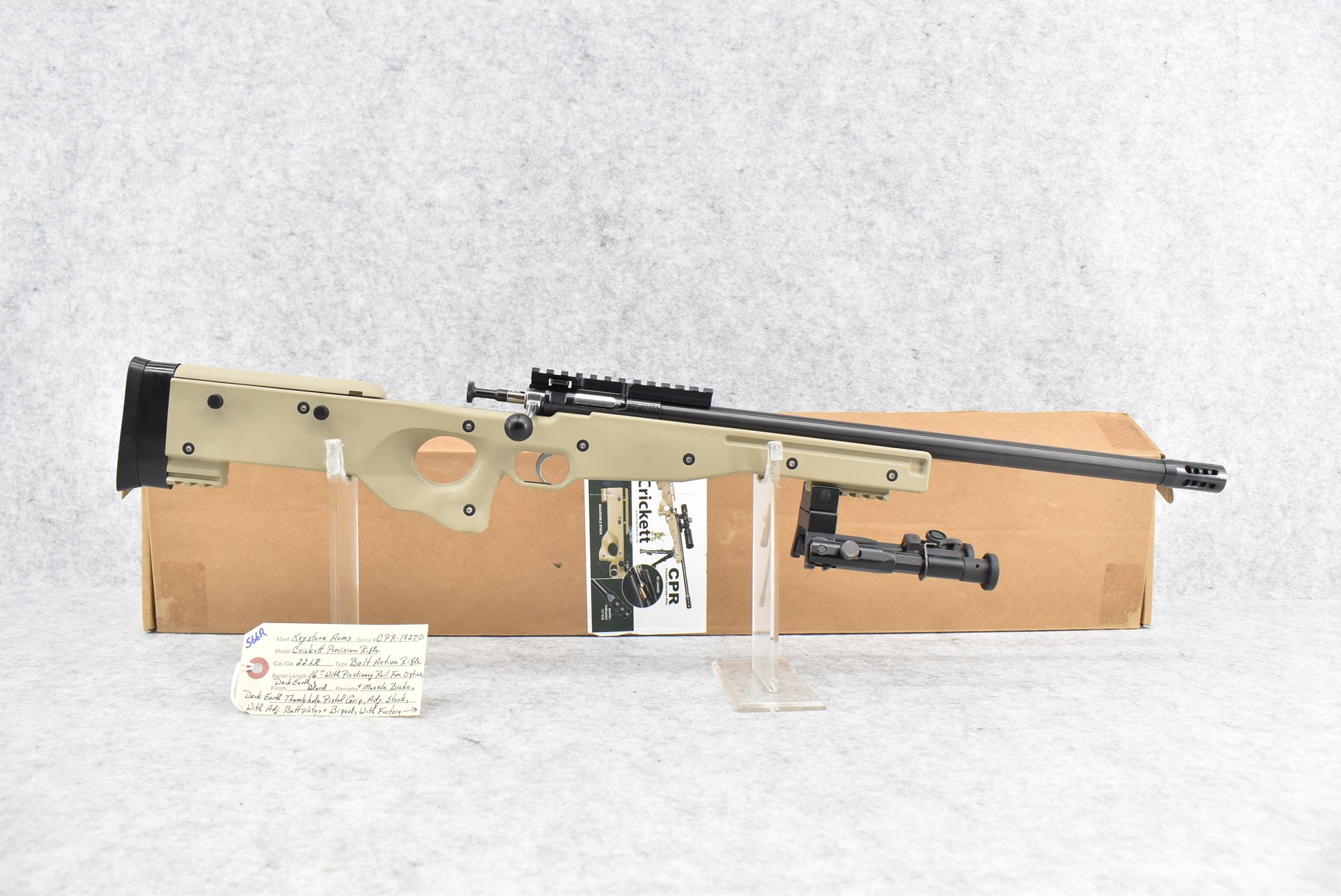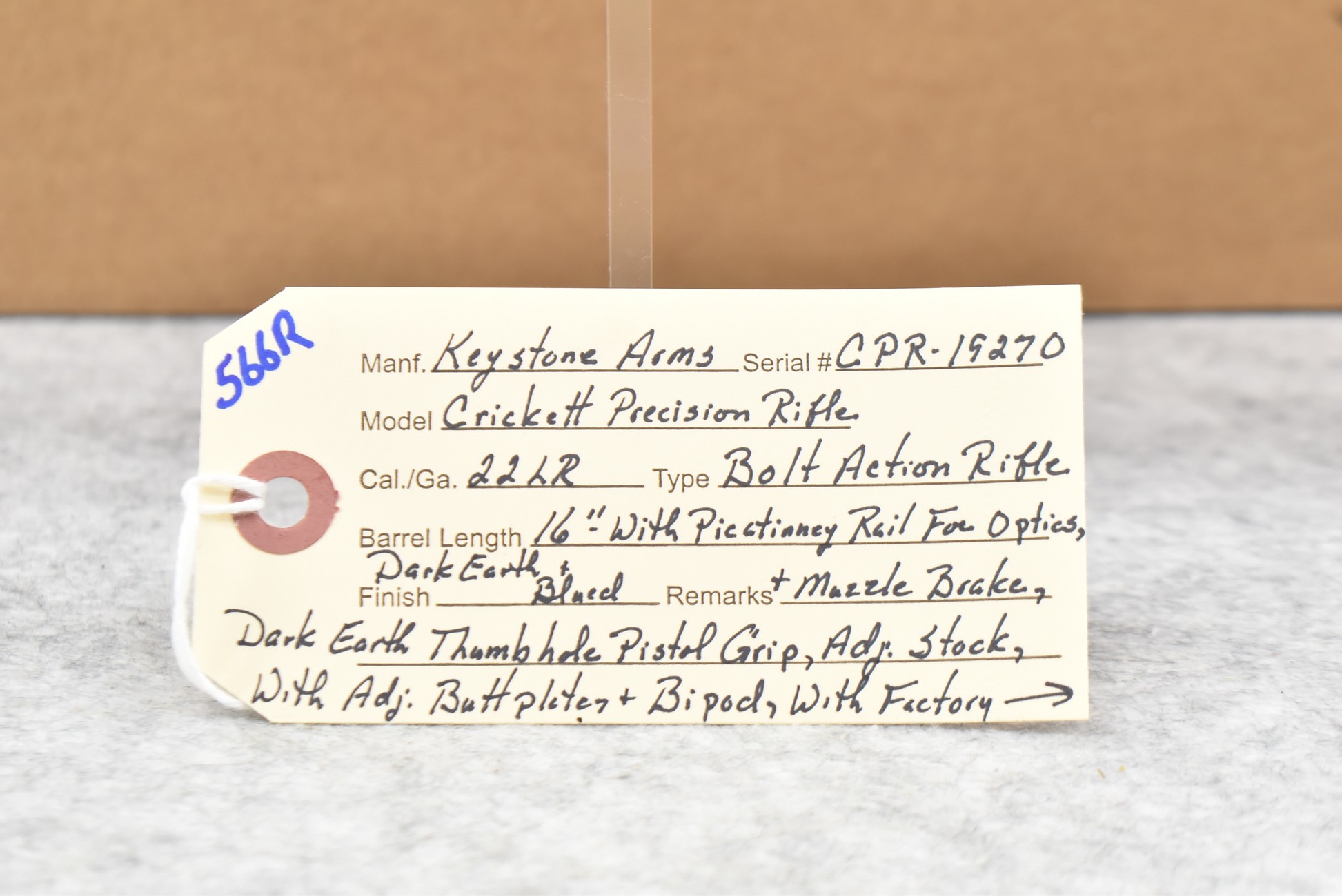 566R. Keystone Arms – Mod. Crickett Precision Rifle – 22LR Cal. Bolt Action Rifle – w/16” Barrel w/Muzzle Brake – Blued Finish – w/Dark Earth Thumb-Hole Pistol Grip Adj. Stock w/Adj. Butt Plate – w/Bipod – w/Picatinny Rail for Optics – w/Factory Box & Accessories