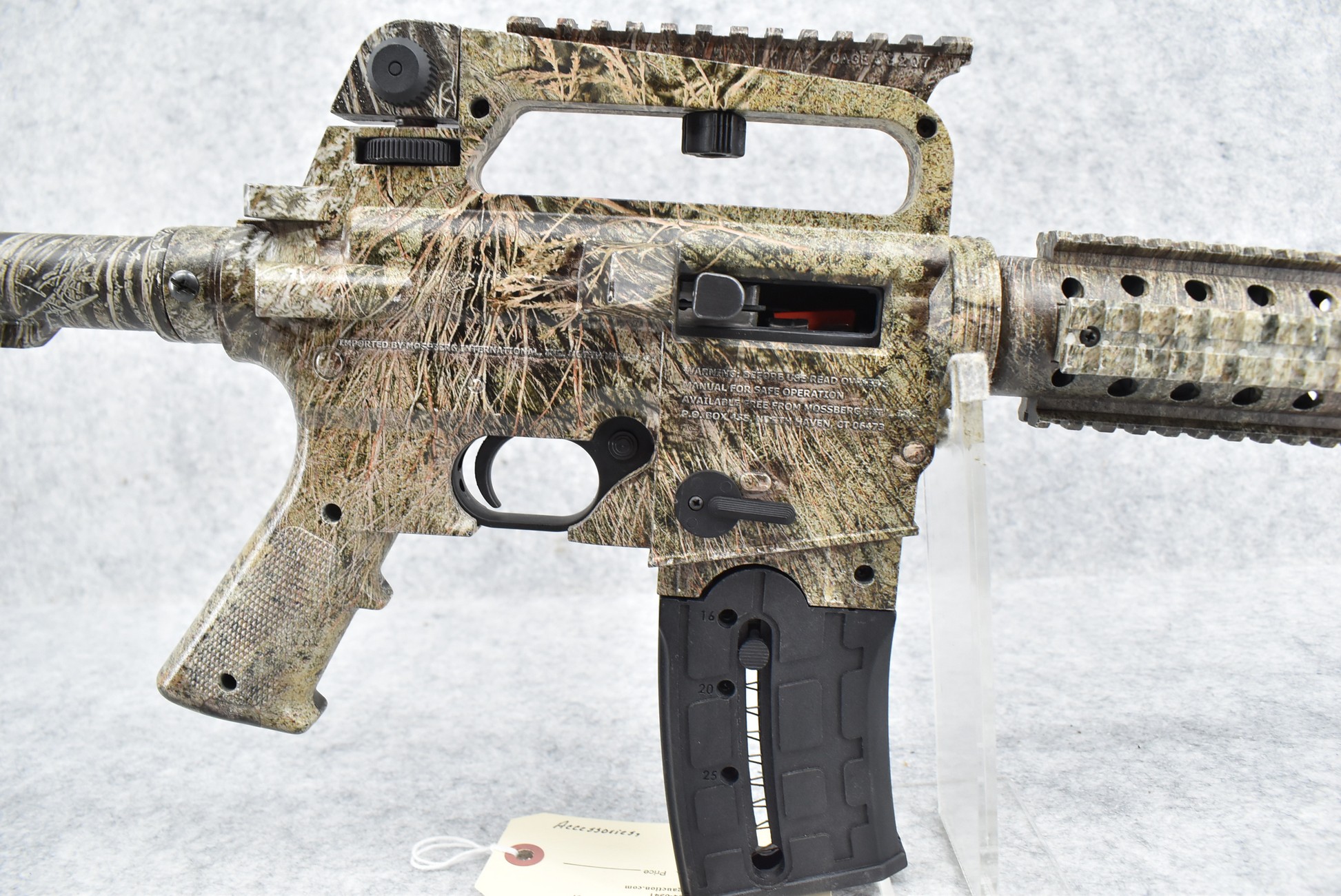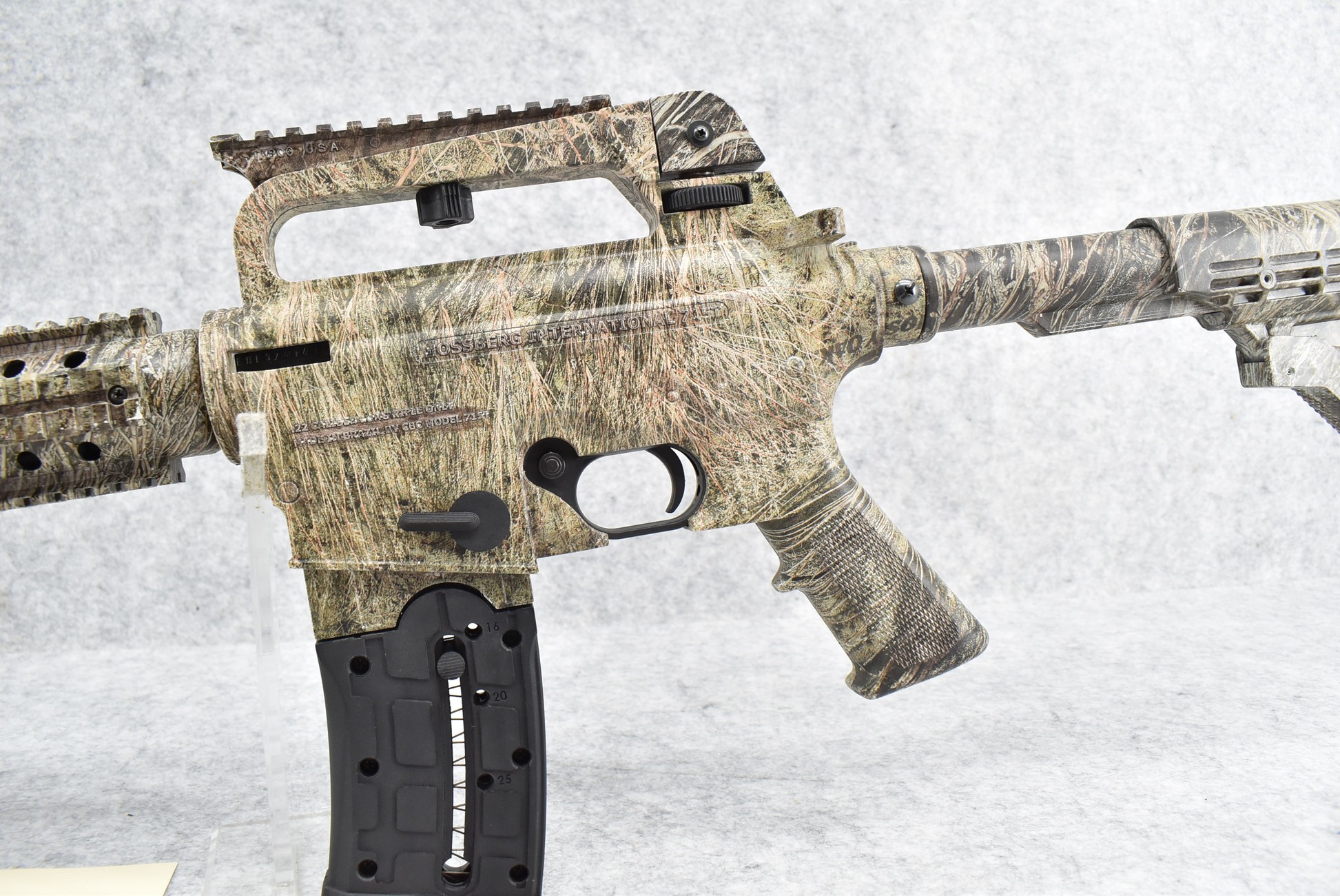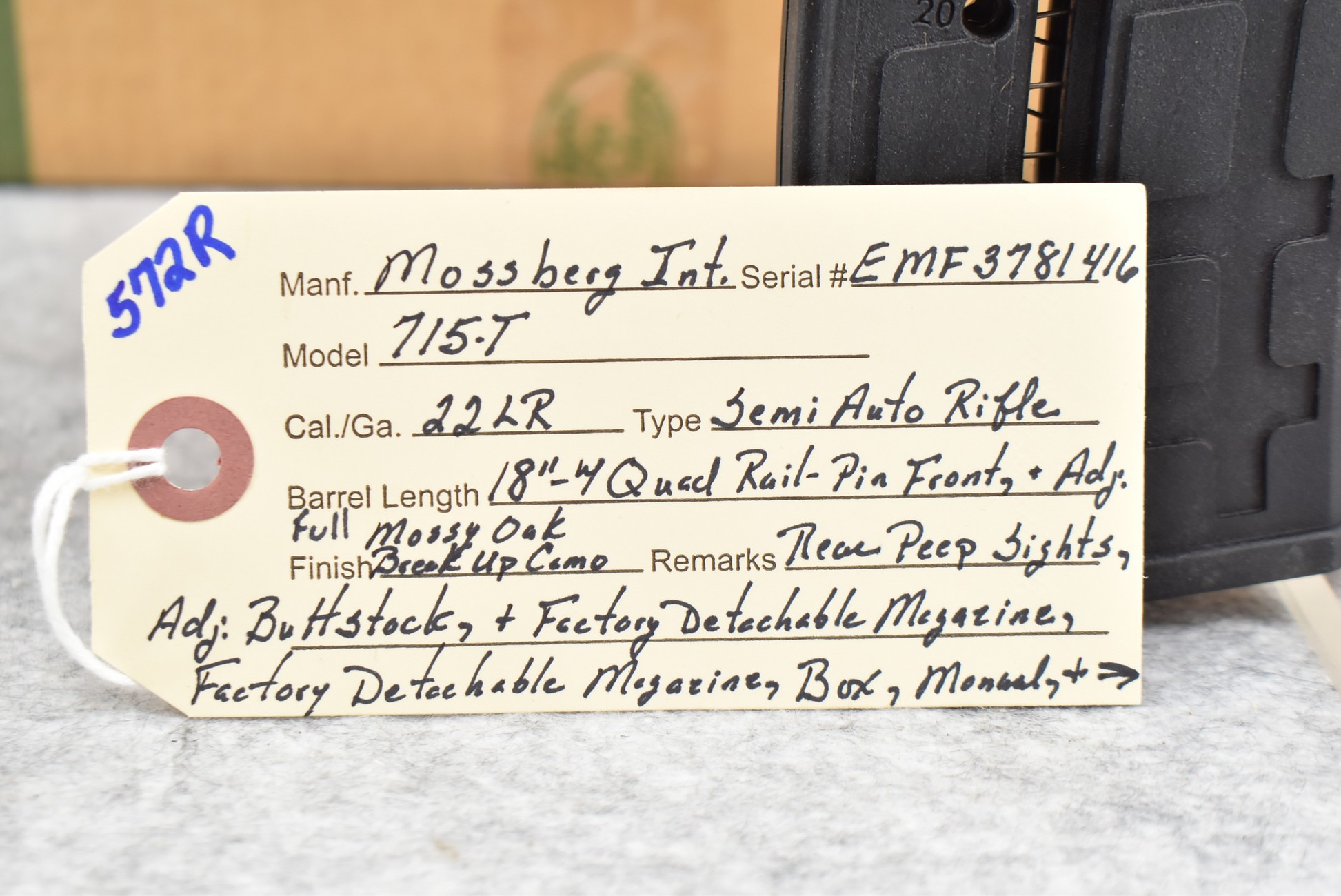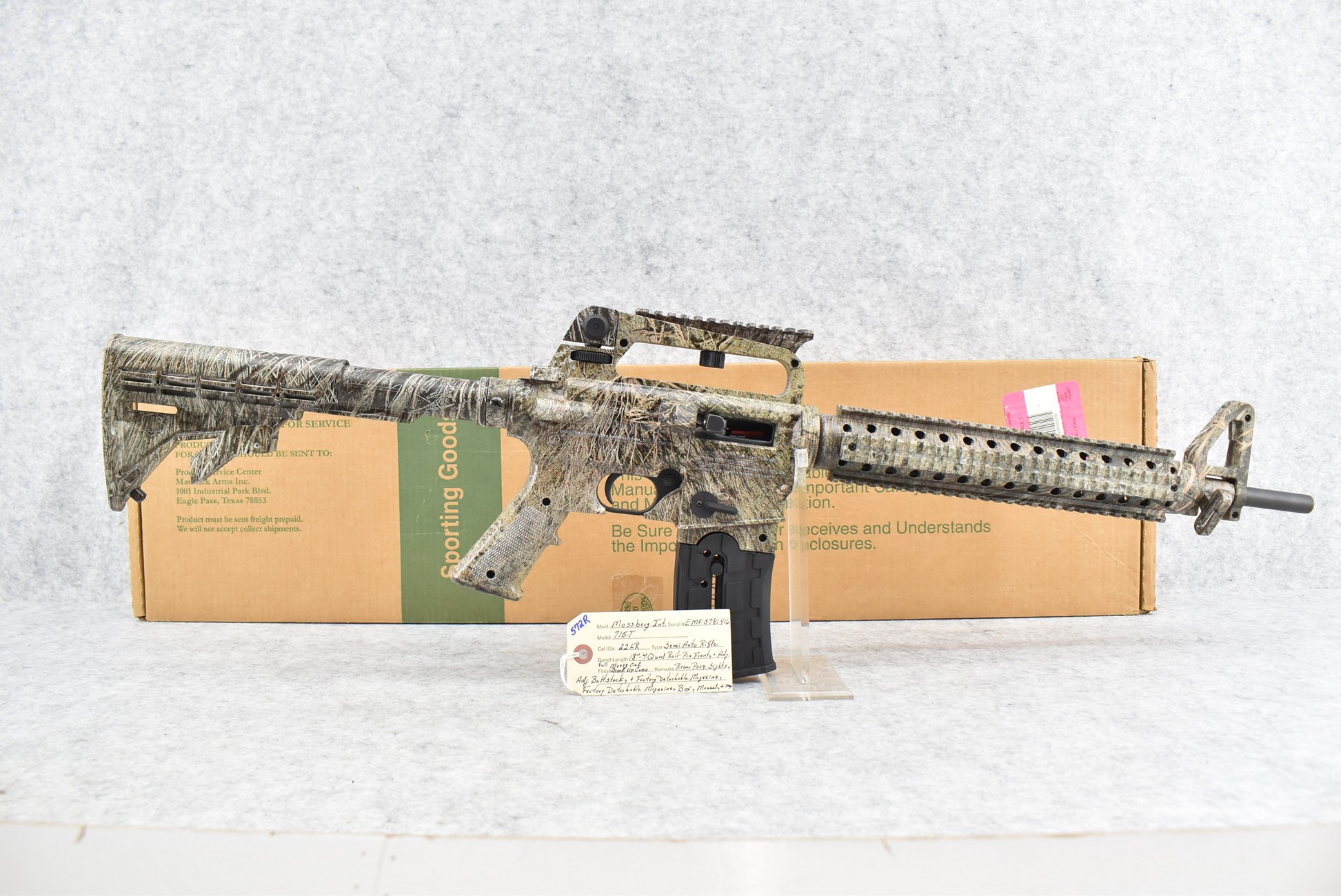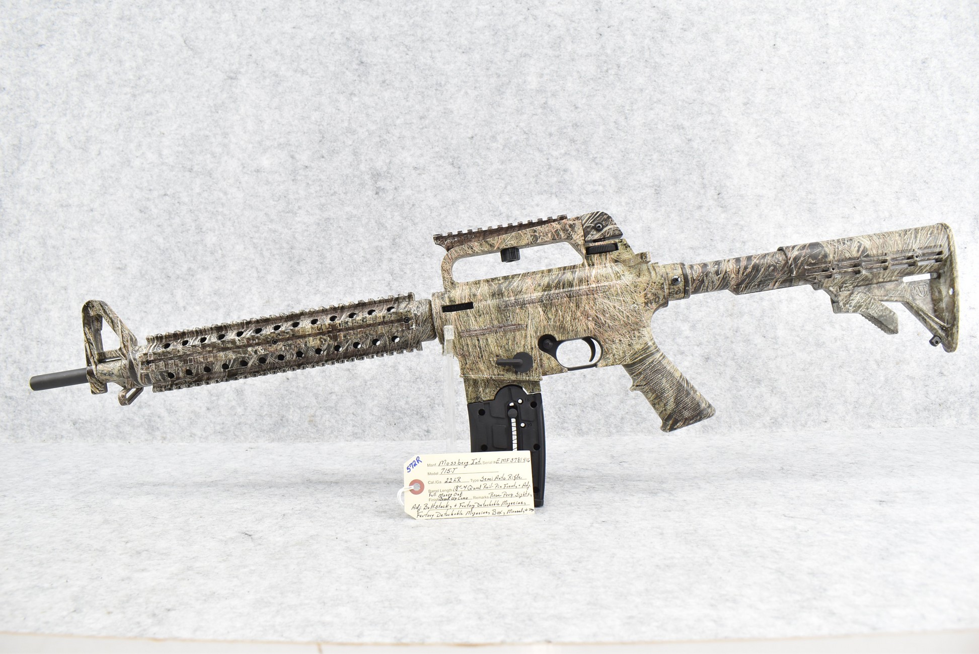 572R.     Mossberg Int. – Mod. 715-T – 22LR Cal. Semi-Auto Rifle – w/18” Barrel w/Pin Front & Adj. Rear Peep Sights – Full Mossy Oak Break Up Camo Coverage – w/Factory Detachable Magazine – w/Quad Rail Picatinny Mounts – w/Factory Box, Manual & Accessories