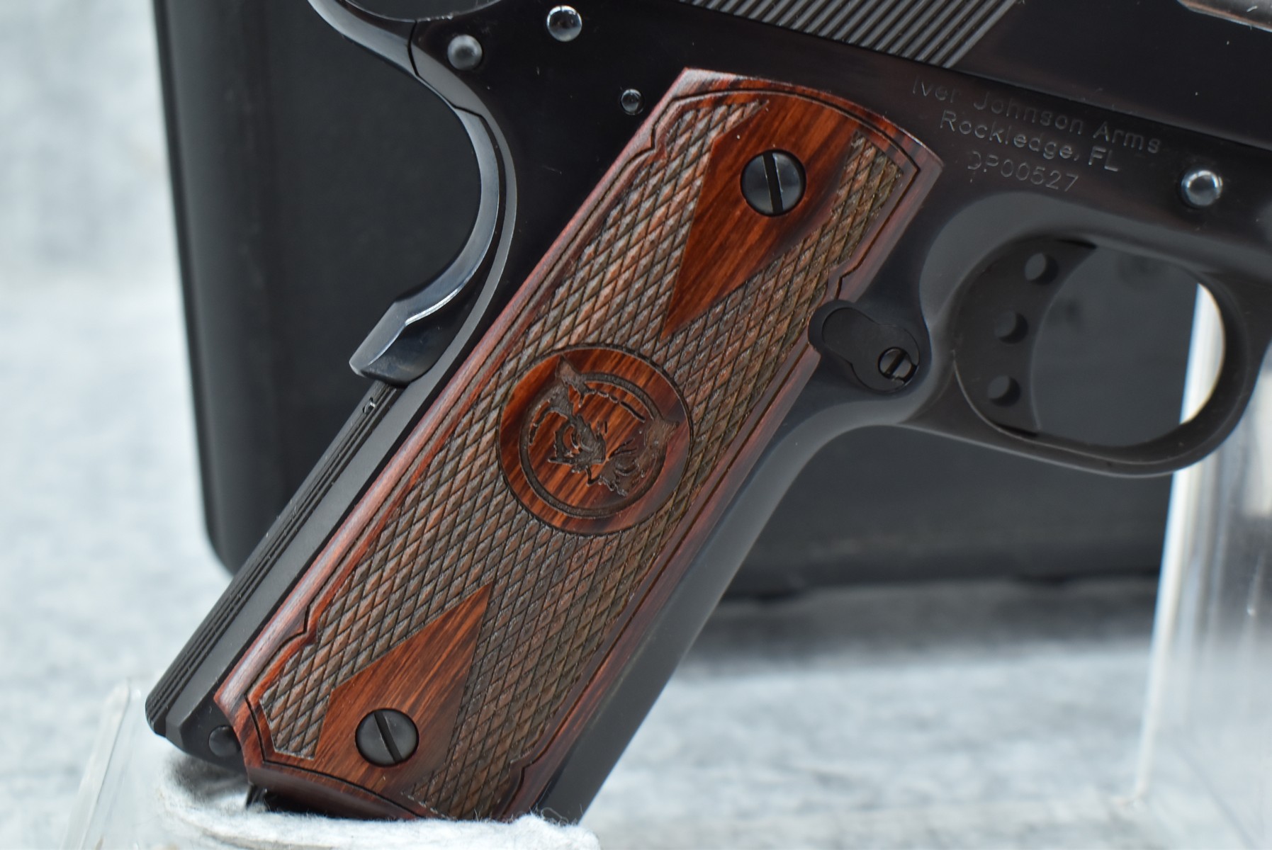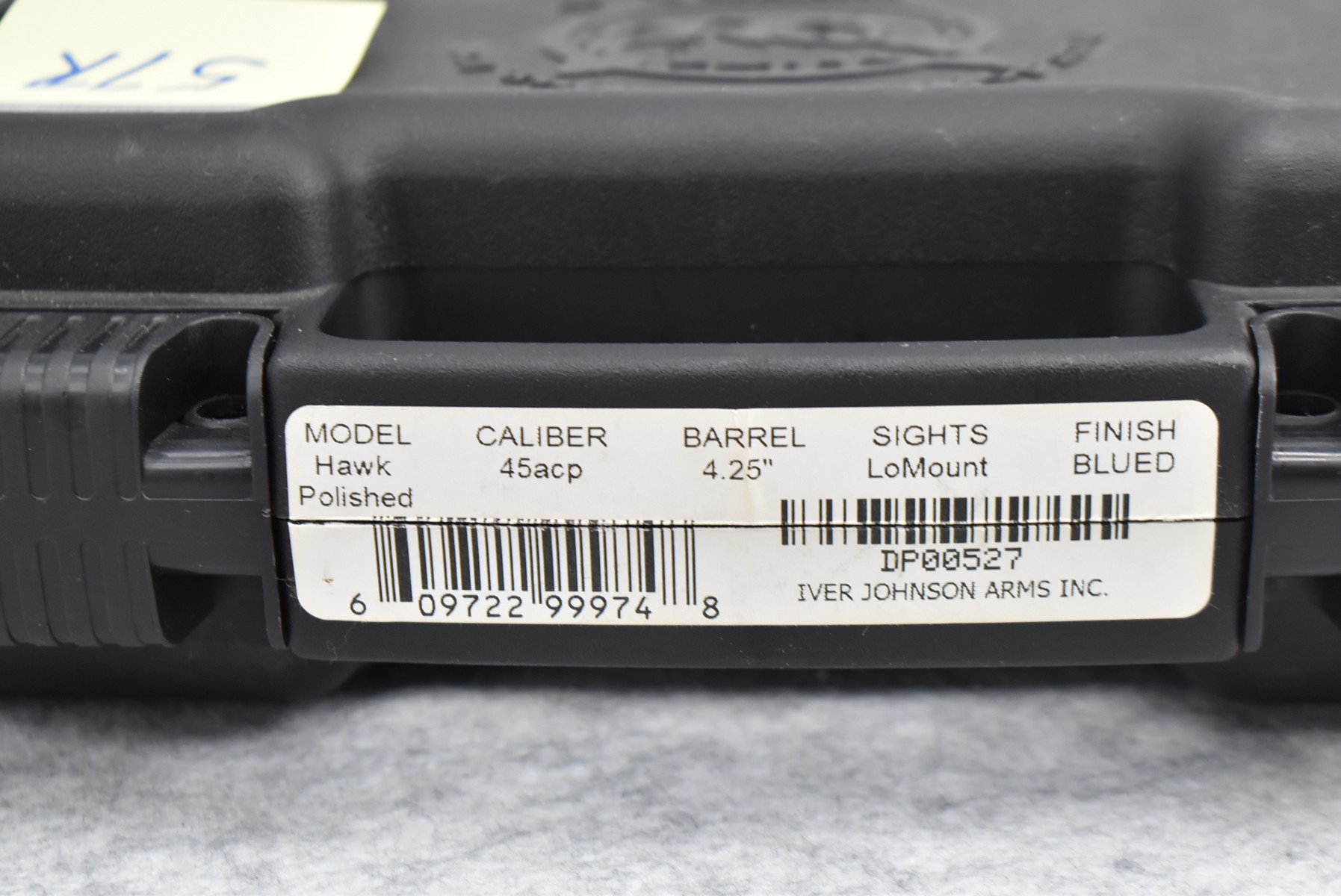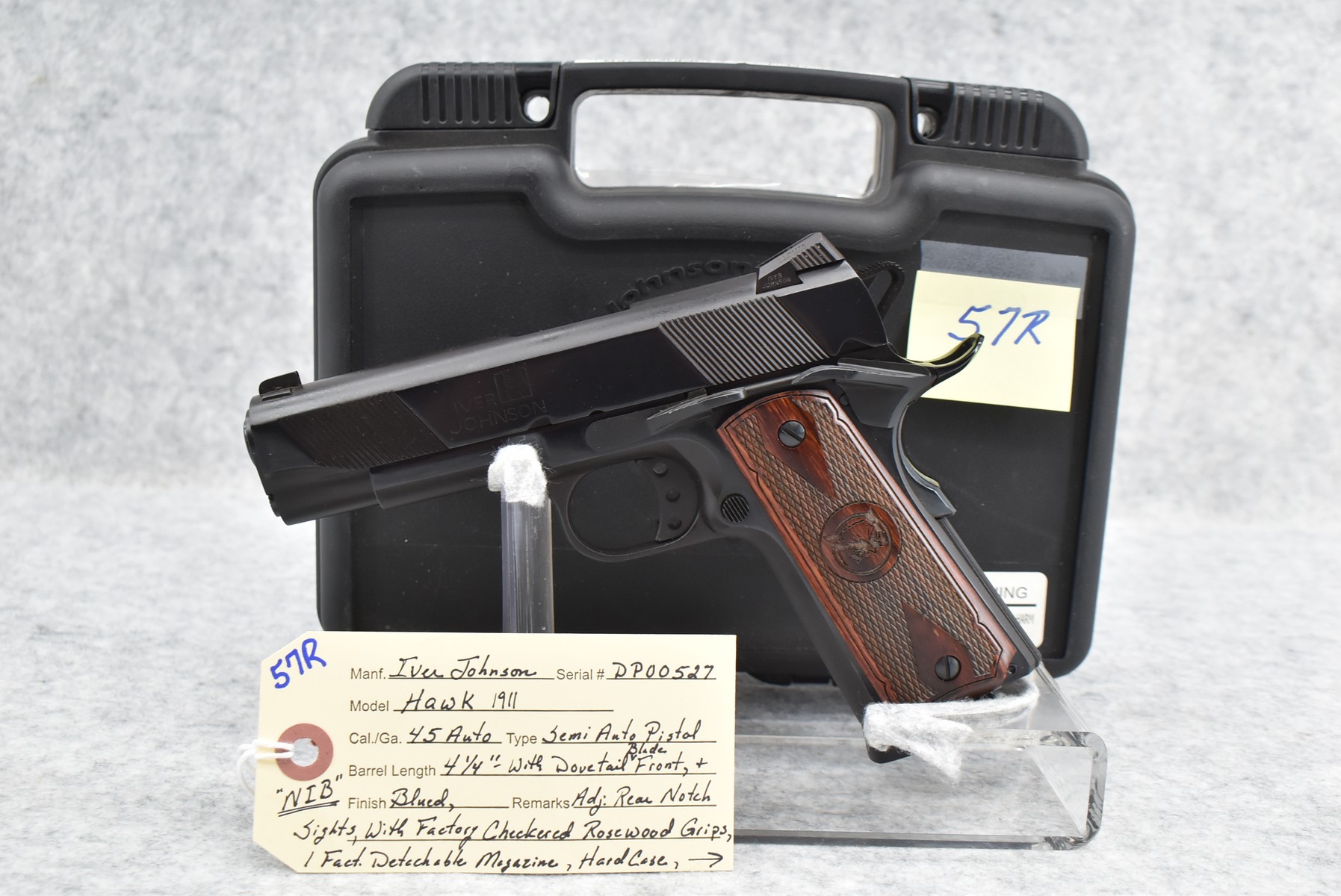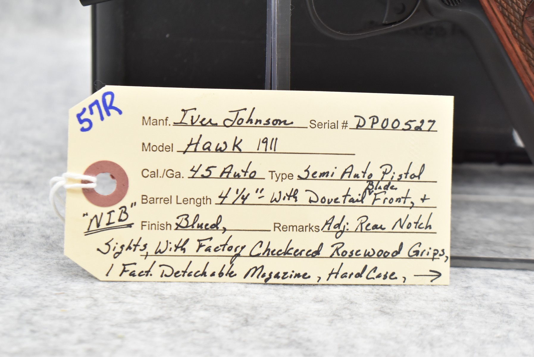 57R. Iver Johnson – Mod. Hawk 1911 – 45 Auto Cal. Semi-Auto Pistol – w/4 ¼” Barrel w/Dovetail Blade Front & Adj. Rear Notch Sights – Blued Finish – w/Factory Checkered Rosewood Grips – w/Factory Detachable Magazine – New w/Hard Case, Manual & Accessories