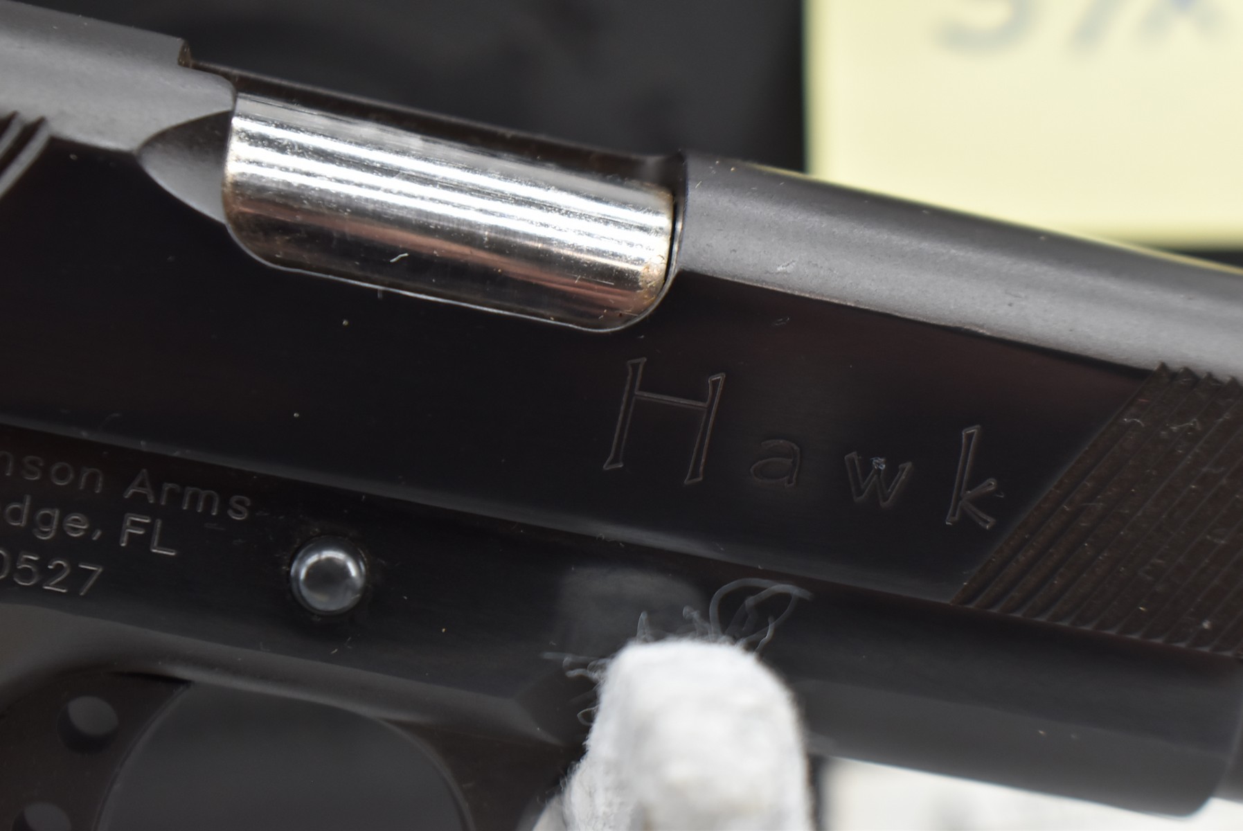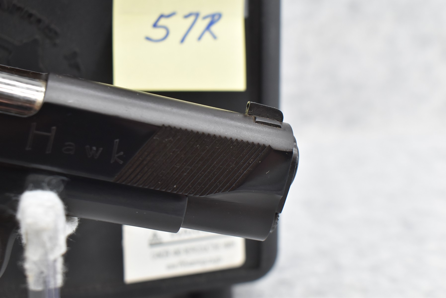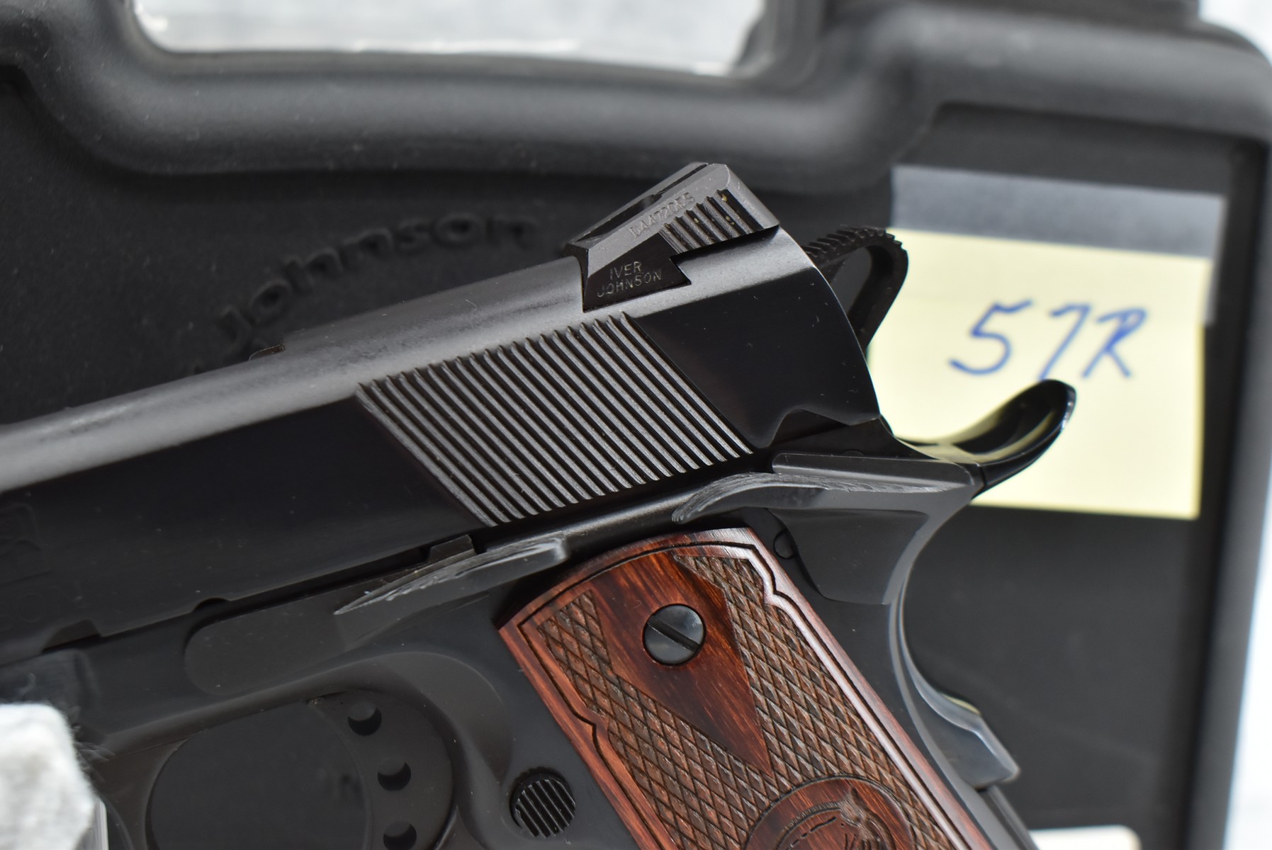 57R. Iver Johnson – Mod. Hawk 1911 – 45 Auto Cal. Semi-Auto Pistol – w/4 ¼” Barrel w/Dovetail Blade Front & Adj. Rear Notch Sights – Blued Finish – w/Factory Checkered Rosewood Grips – w/Factory Detachable Magazine – New w/Hard Case, Manual & Accessories