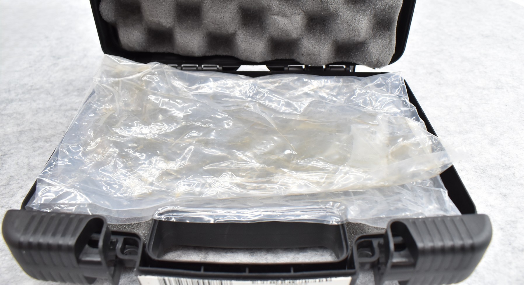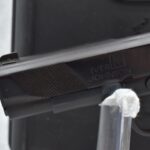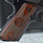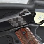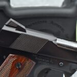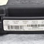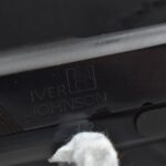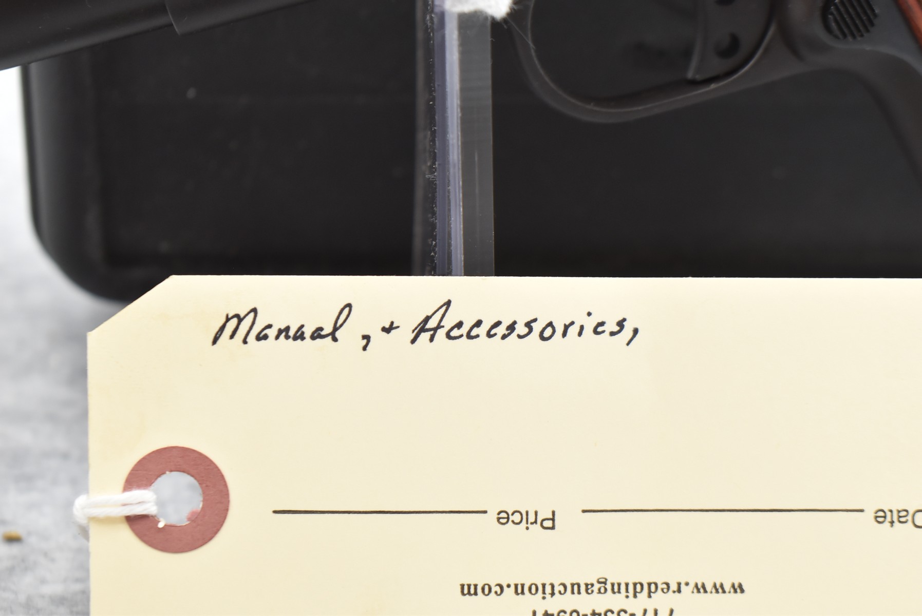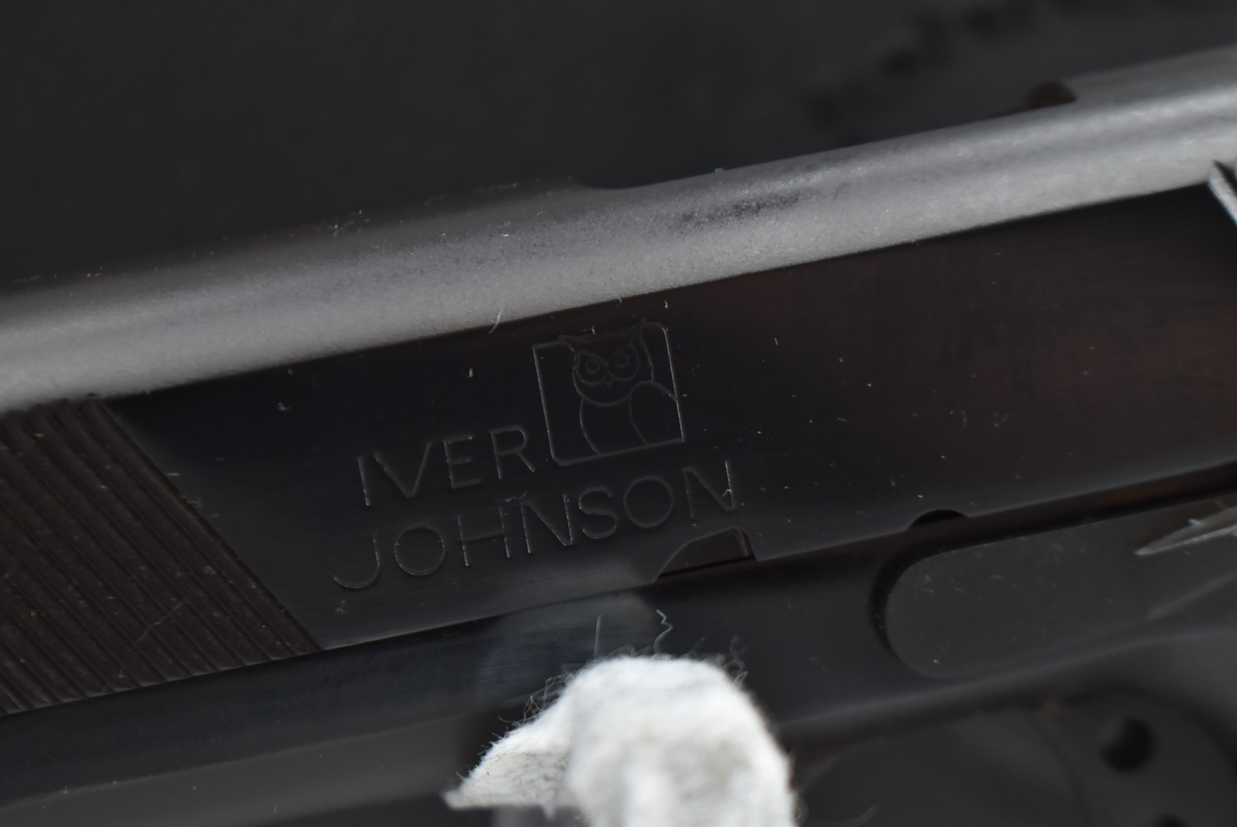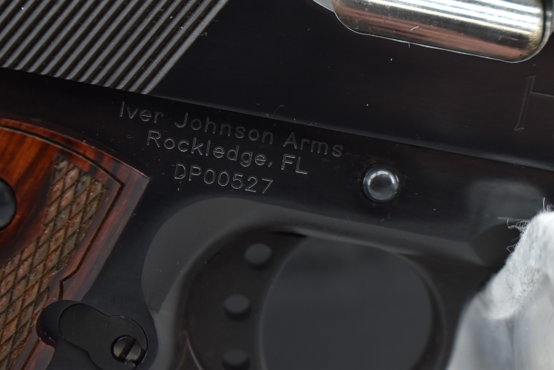 57R. Iver Johnson – Mod. Hawk 1911 – 45 Auto Cal. Semi-Auto Pistol – w/4 ¼” Barrel w/Dovetail Blade Front & Adj. Rear Notch Sights – Blued Finish – w/Factory Checkered Rosewood Grips – w/Factory Detachable Magazine – New w/Hard Case, Manual & Accessories