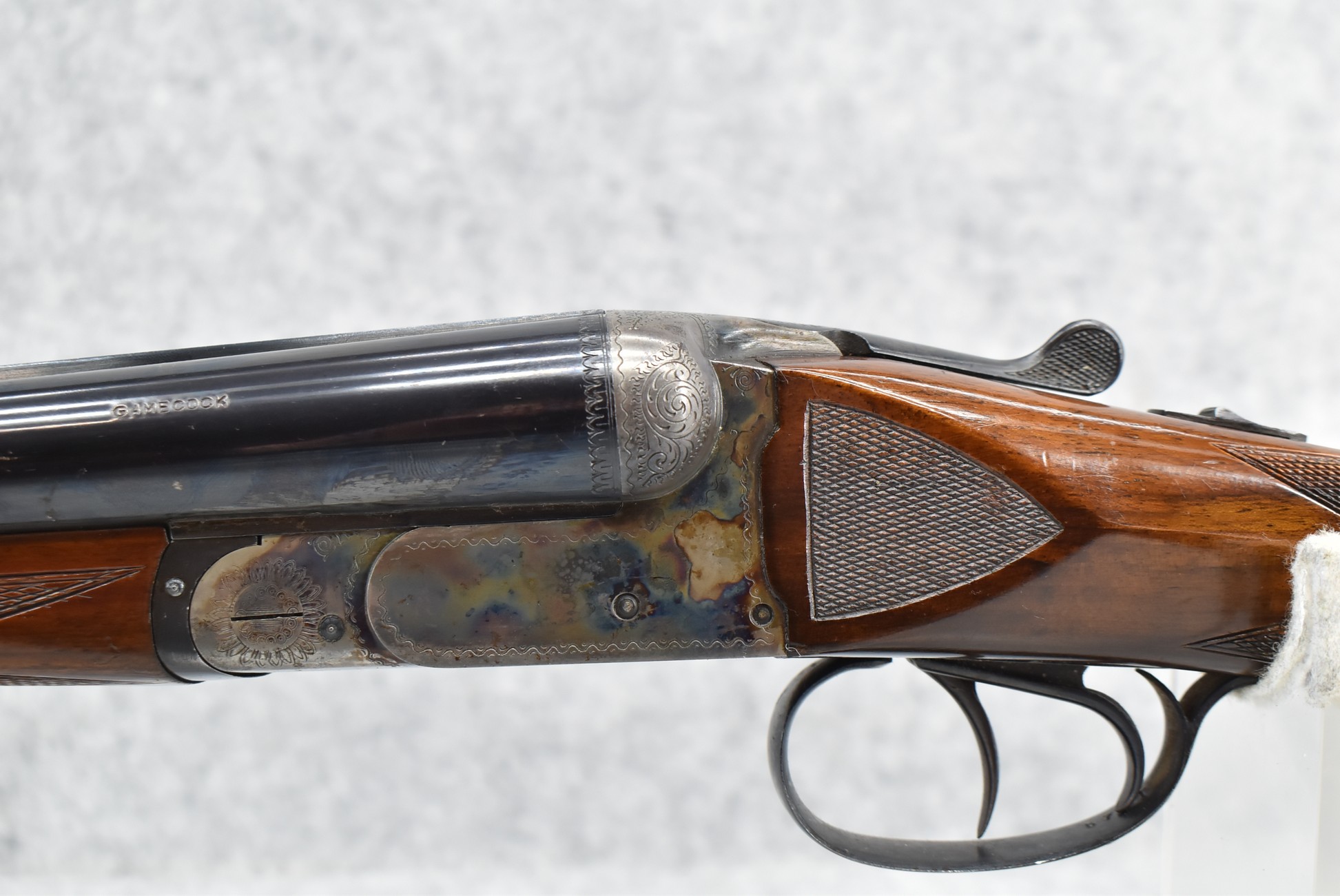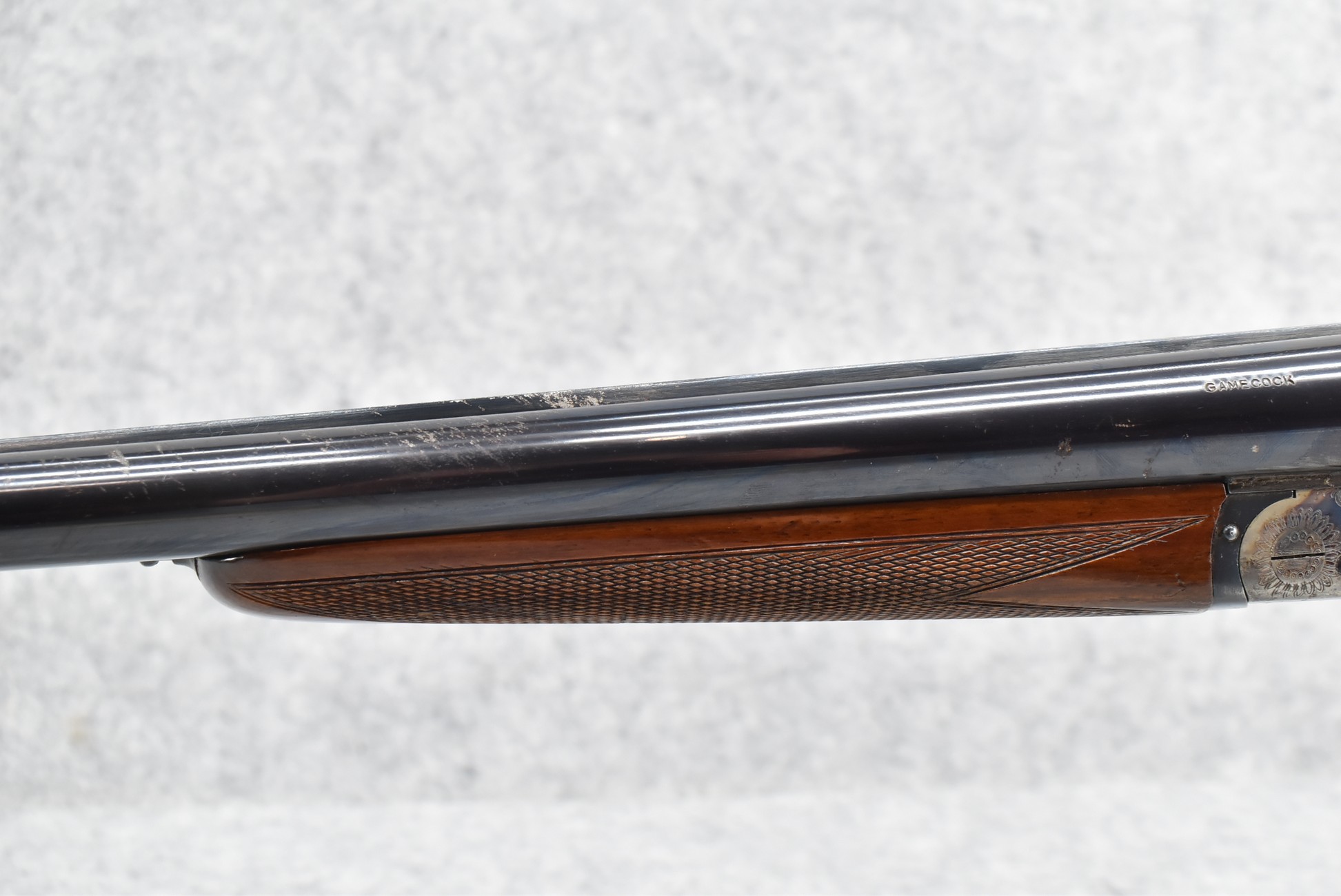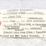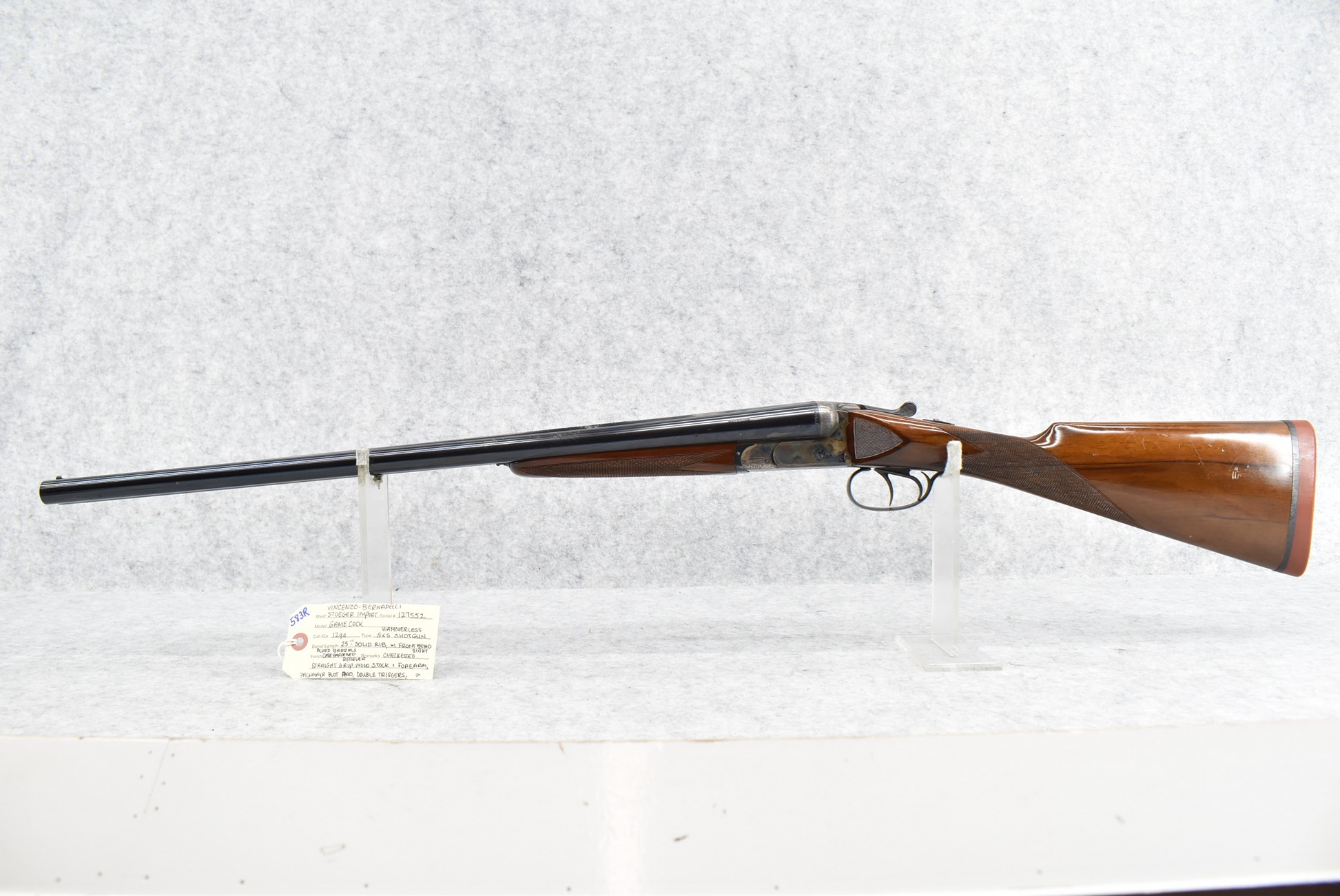 583R. Vincenzo-Bernadelli (Stoeger Import) – Mod. Game Cock – 12ga. Hammerless Double Barrel Shotgun – w/25” Solid Rib Blued Finish Barrels w/Front Bead Sight – w/Case Hardened Receiver w/Floral Engraving – w/Checkered Straight Grip Wood Stocks w/Pachmayr Butt Pad – w/Double Triggers – Note: Forearm Has Crack Starting at Release Button