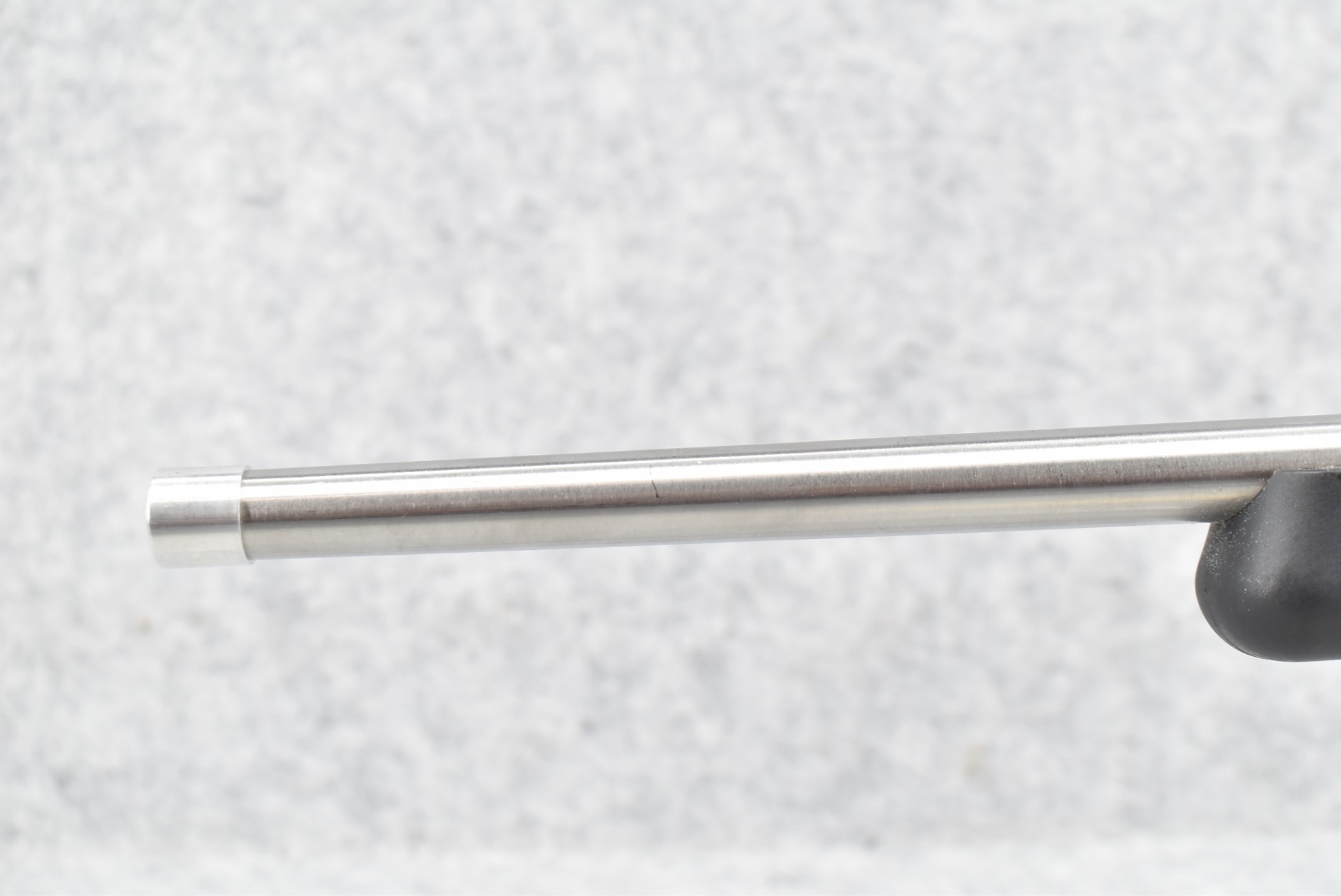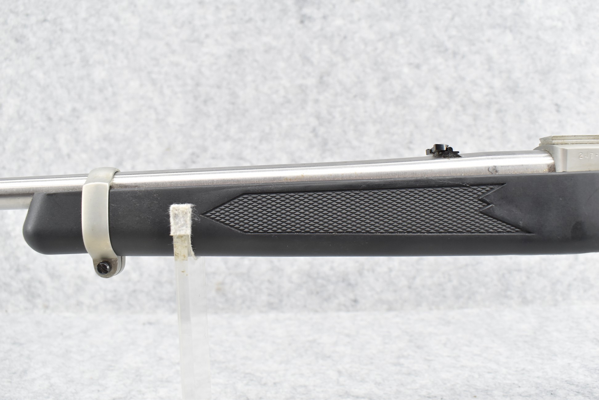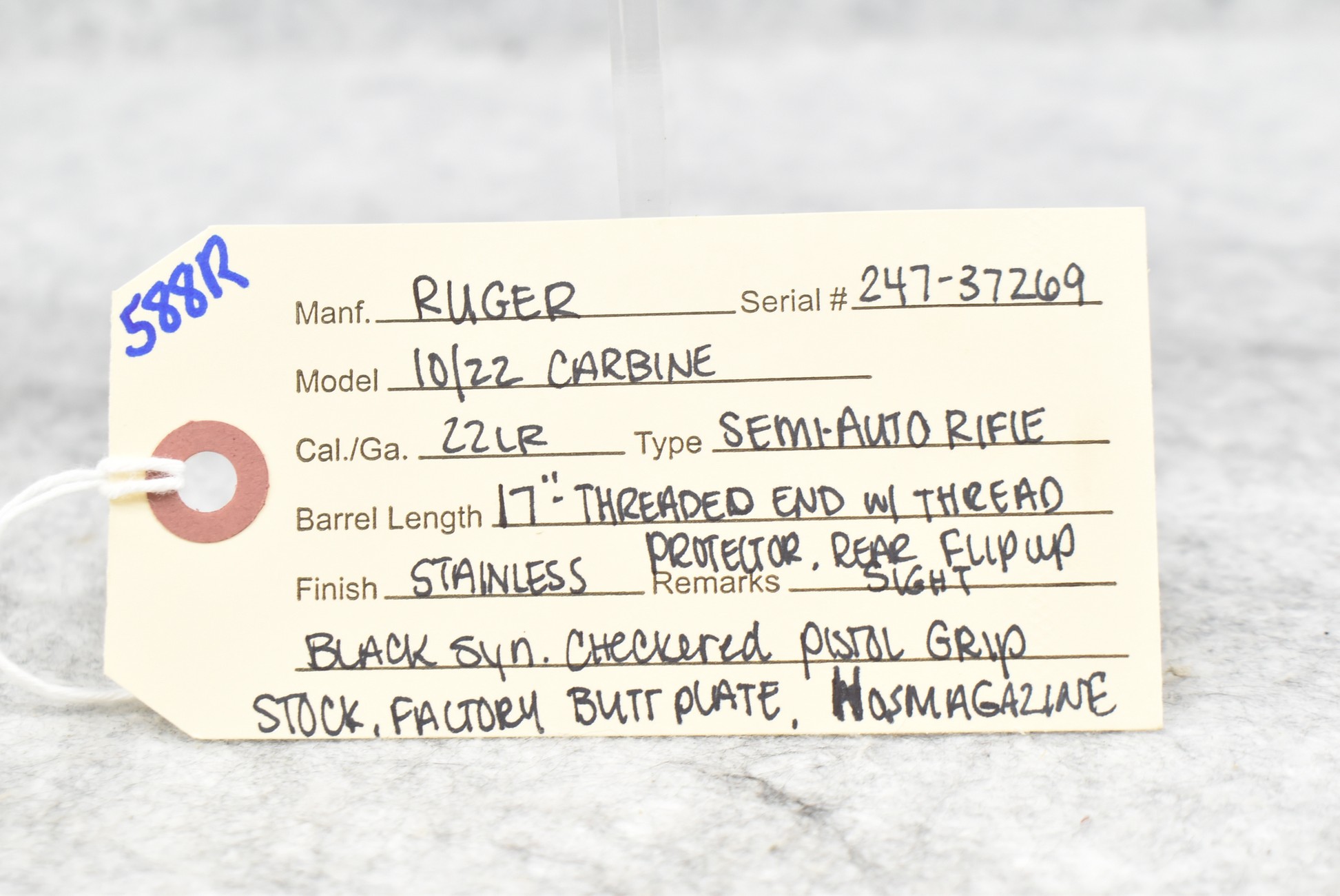 588R. Ruger – Mod. 10/22 Carbine – 22LR Cal. Semi-Auto Rifle – w/17” Barrel w/Rear Flip Up Sight w/Threaded Muzzle w/Cap – Stainless Finish – w/Black Synthetic Checkered Pistol Grip Stock w/Factory Butt Plate – w/Magazine