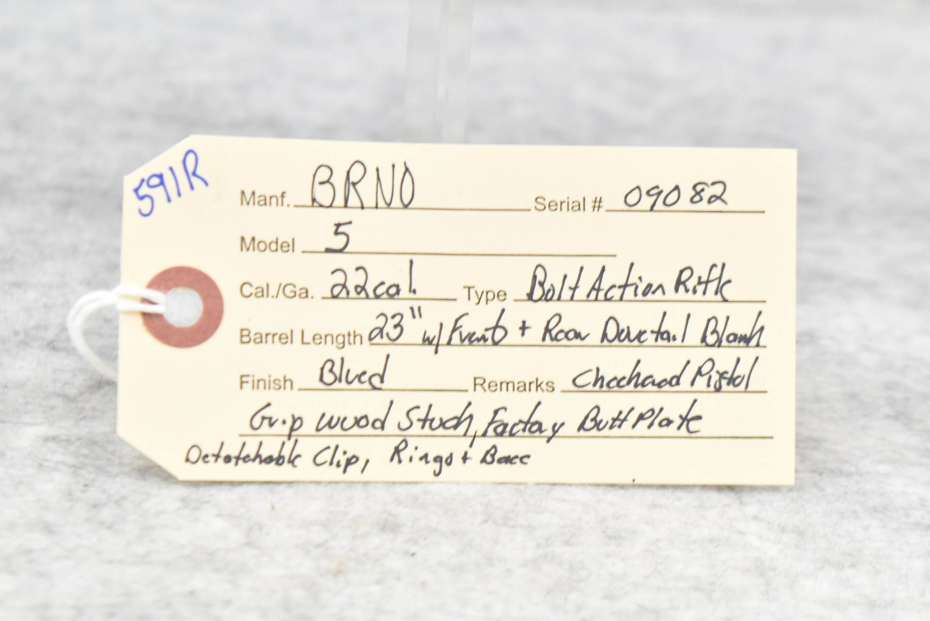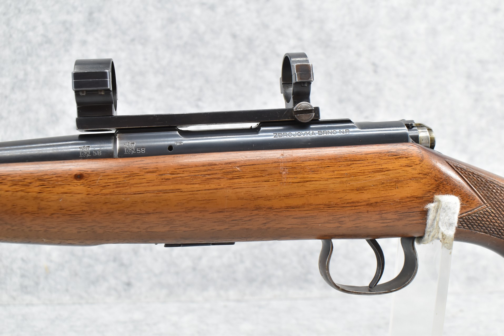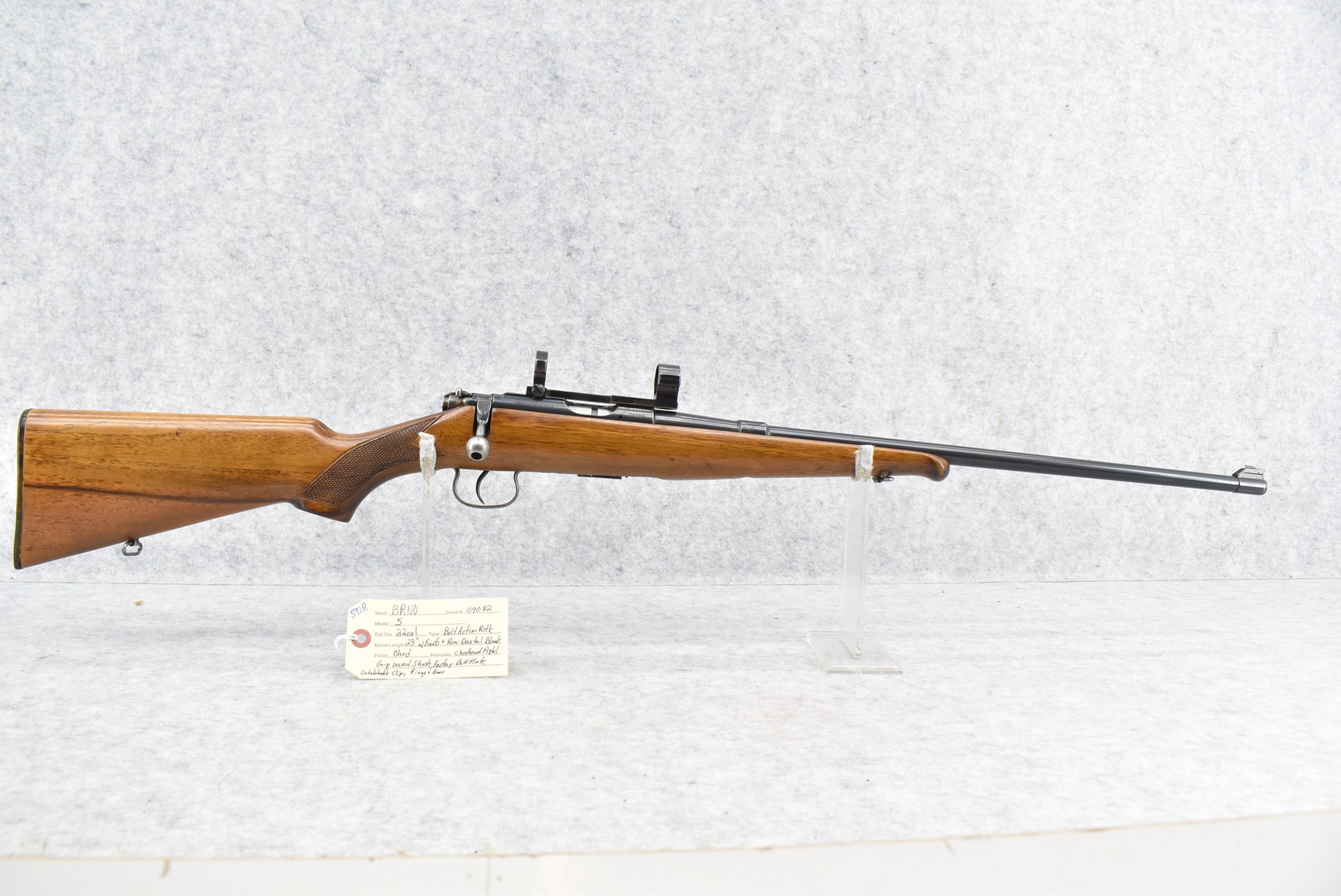 591R. BRNO – Mod. 5 – 22 Cal. Bolt Action Rifle – w/23” Barrel w/Front Sight (Rear Dovetail Blank) – Blued Finish – w/Checkered Pistol Grip Wood Stock w/Factory Butt Plate – w/Detachable Clip – w/Rings & Base