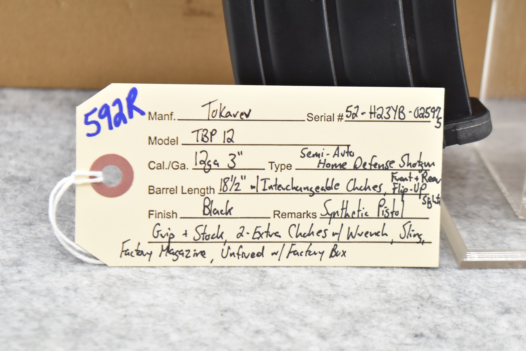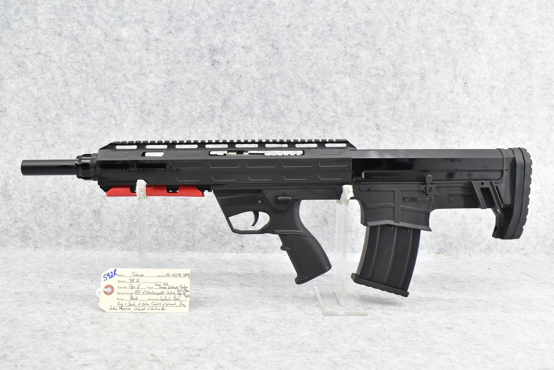 592R. Tokarev – Mod. TBP 12 – 12ga. 3” Semi-Auto Home Defense Shotgun – w/18 ½” Barrel w/Interchangeable Chokes, Front & Rear Flip Up Sights – Black Finish – w/Synthetic Pistol Grip & Stock – w/Factory Magazine – w/Sling – Unfired w/Factory Box & 2 Extra Chokes w/Wrench
