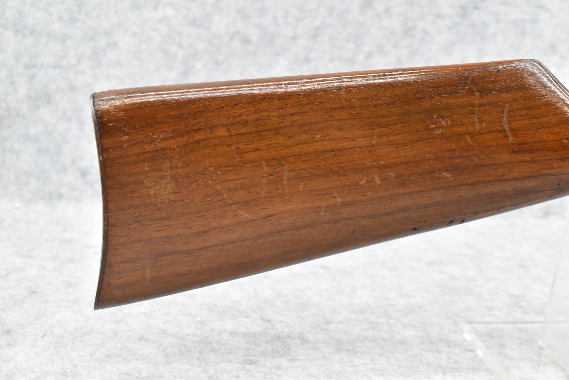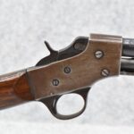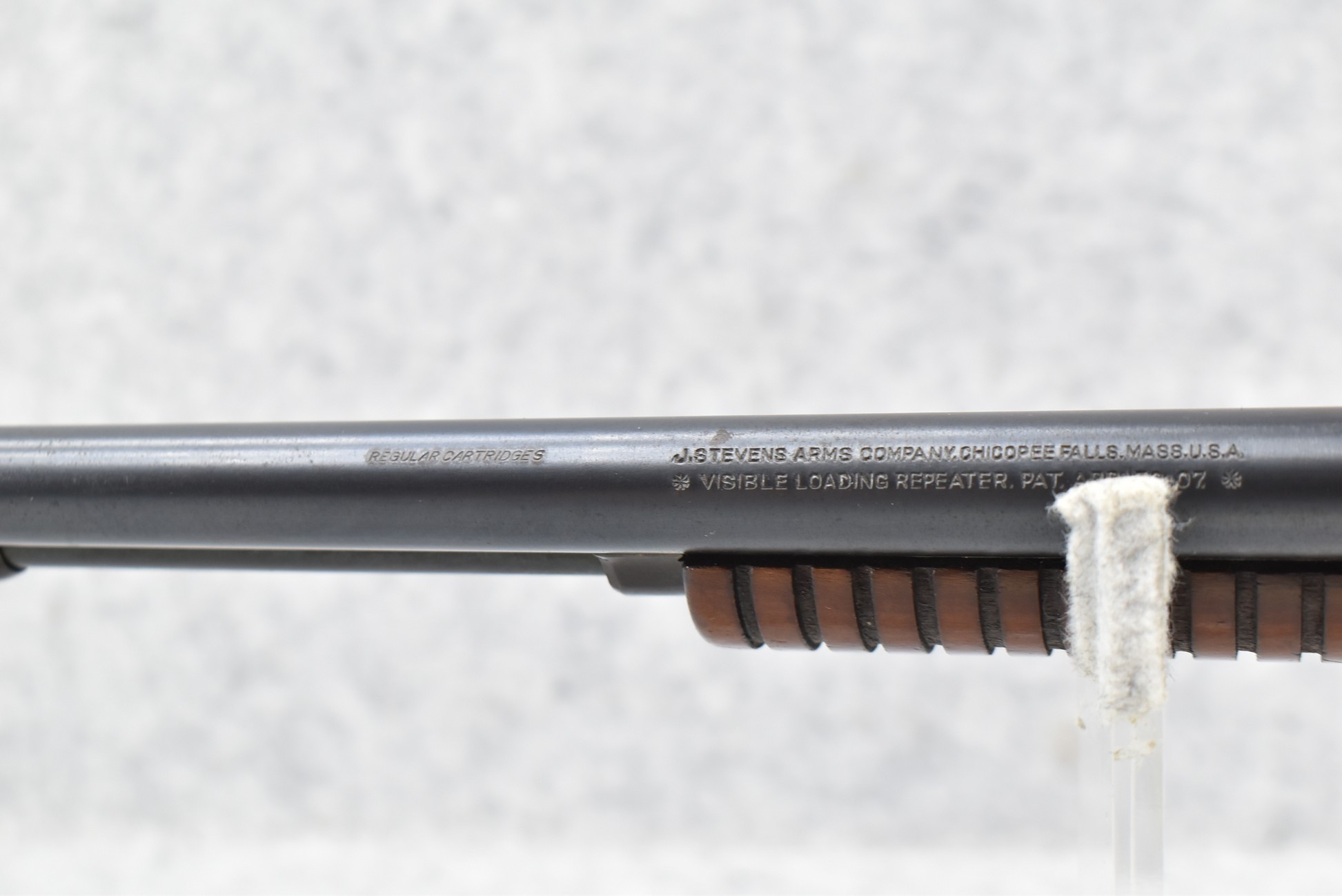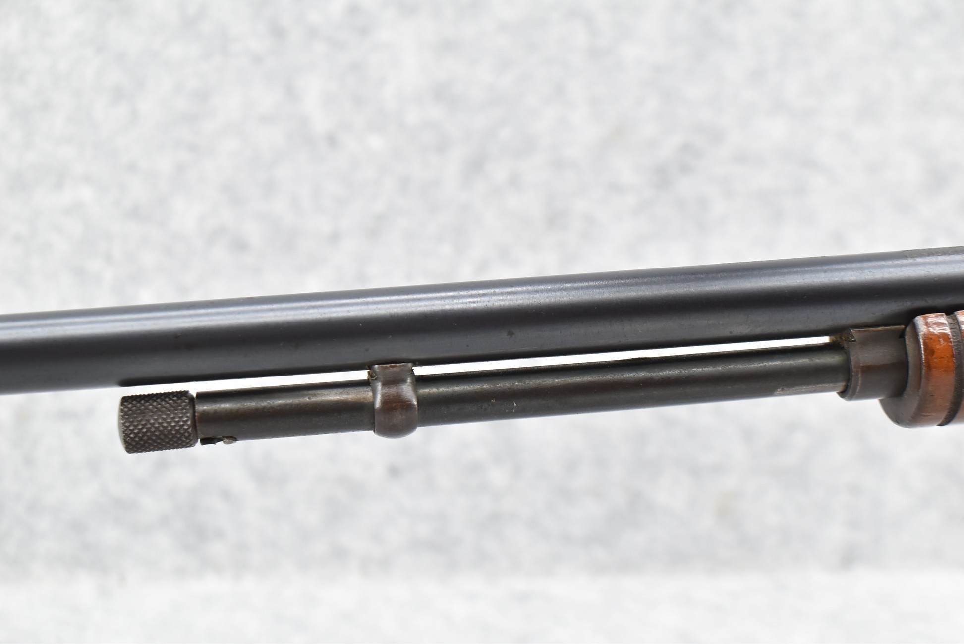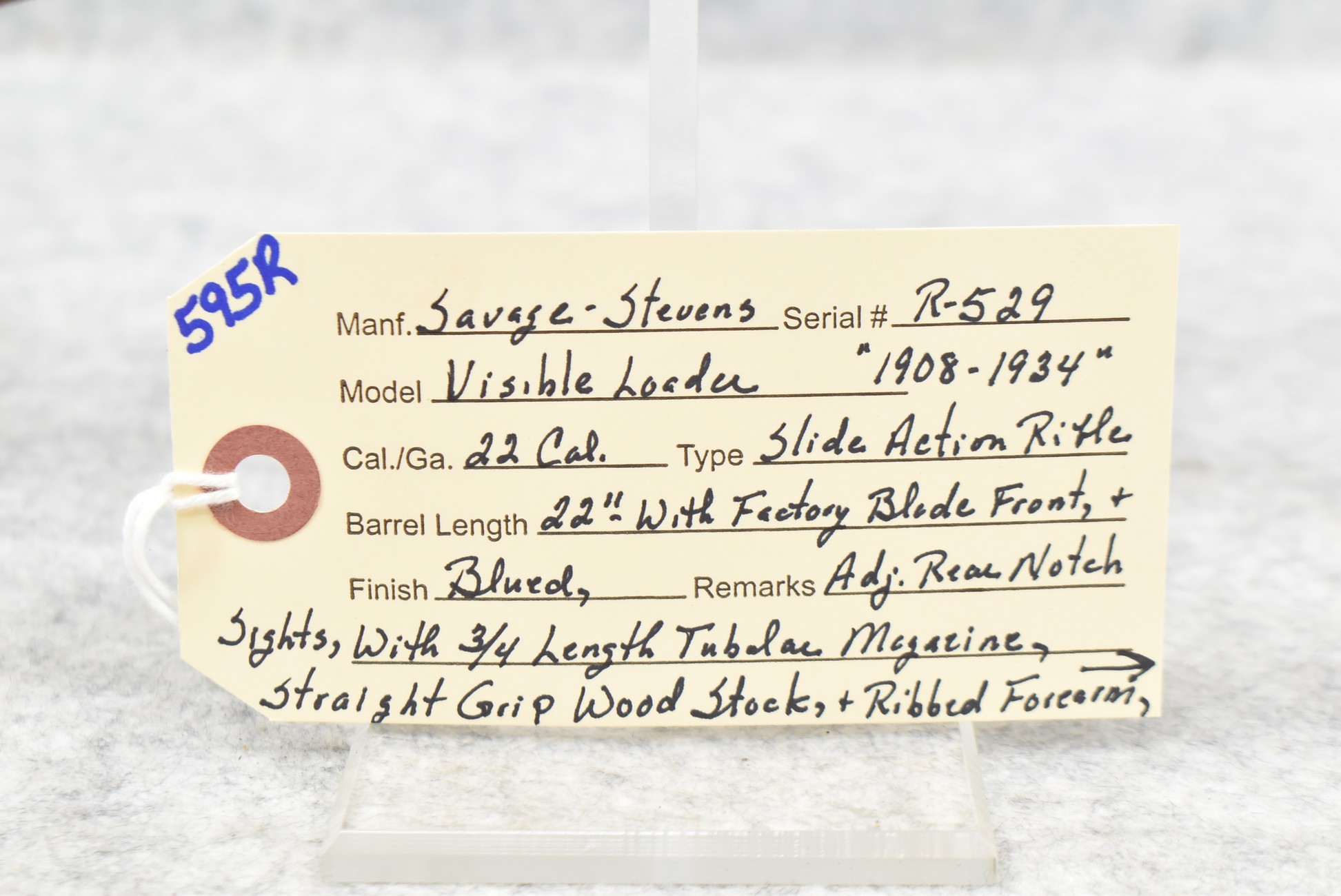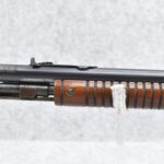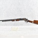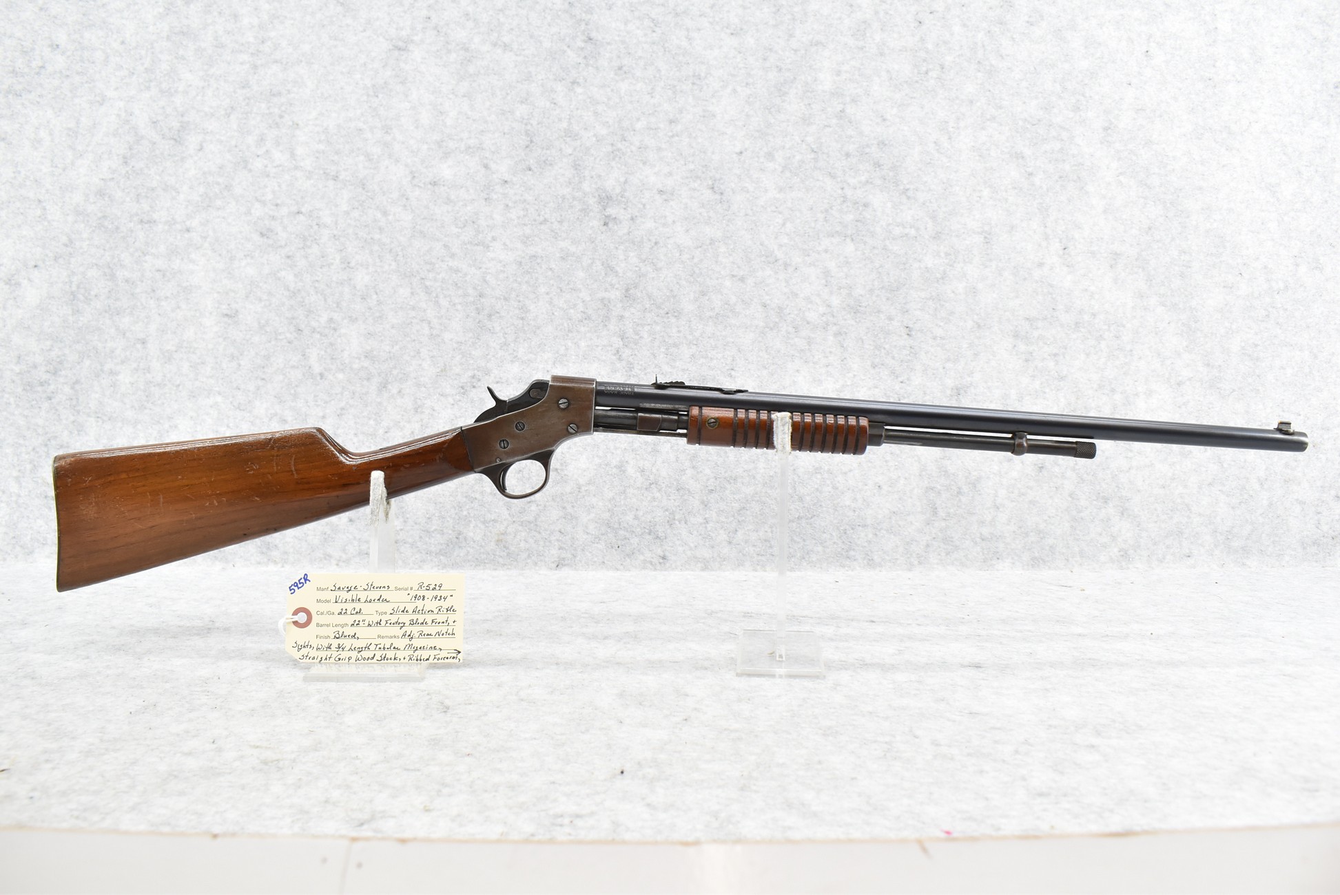 595R. Savage-Stevens – Mod. Visible Loader – 22 Cal. Pump Action Rifle – w/22” Barrel w/Factory Blade Front and Adjustable Rear Notch Sights – Blued Finish – w/Straight Grip Wood Stock and Ribbed Forearm w/Metal Butt Plate – w/¾ Length Tubular Magazine – Manufactured 1908-1934
