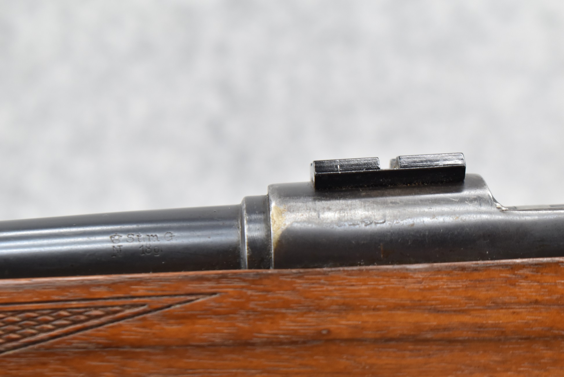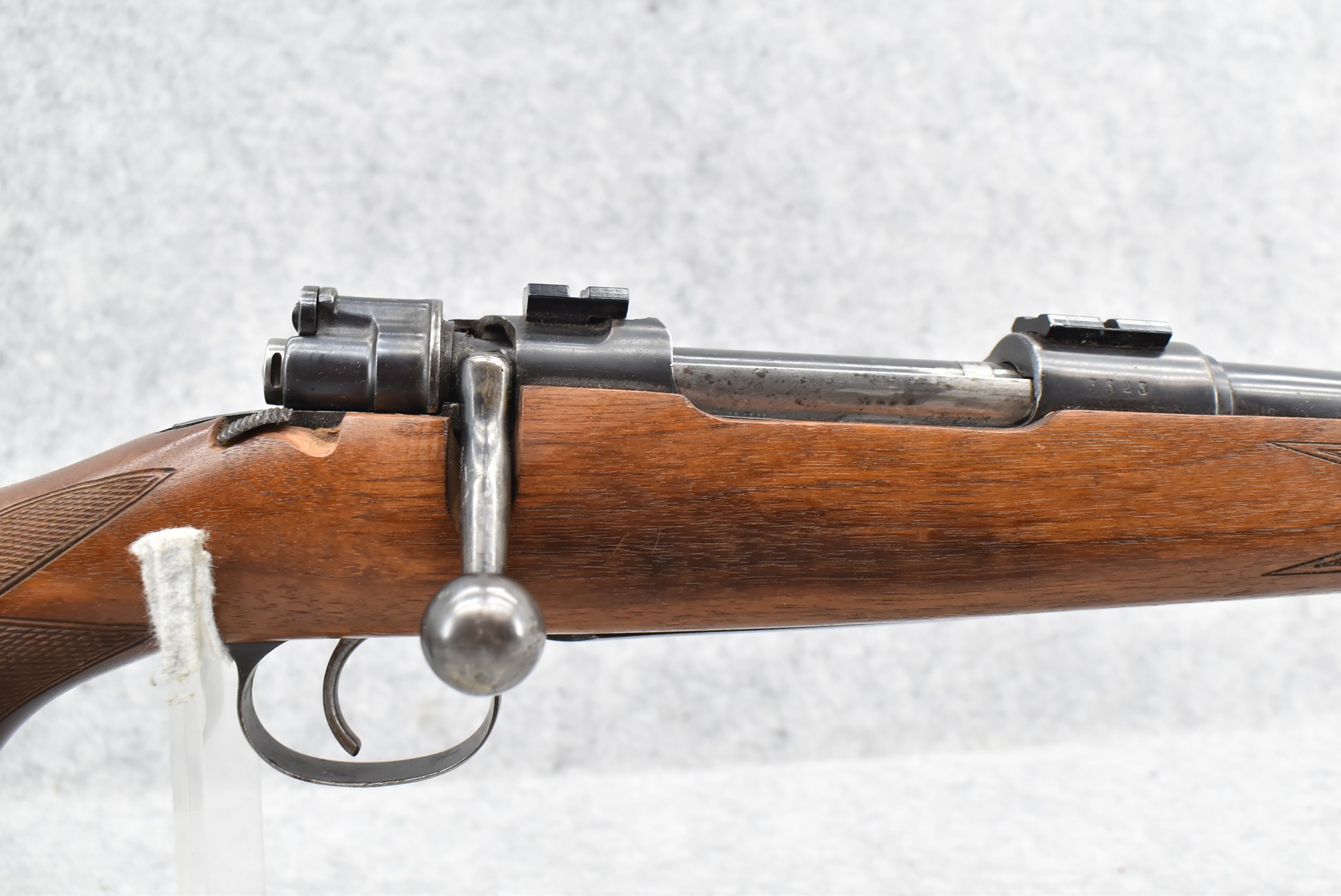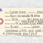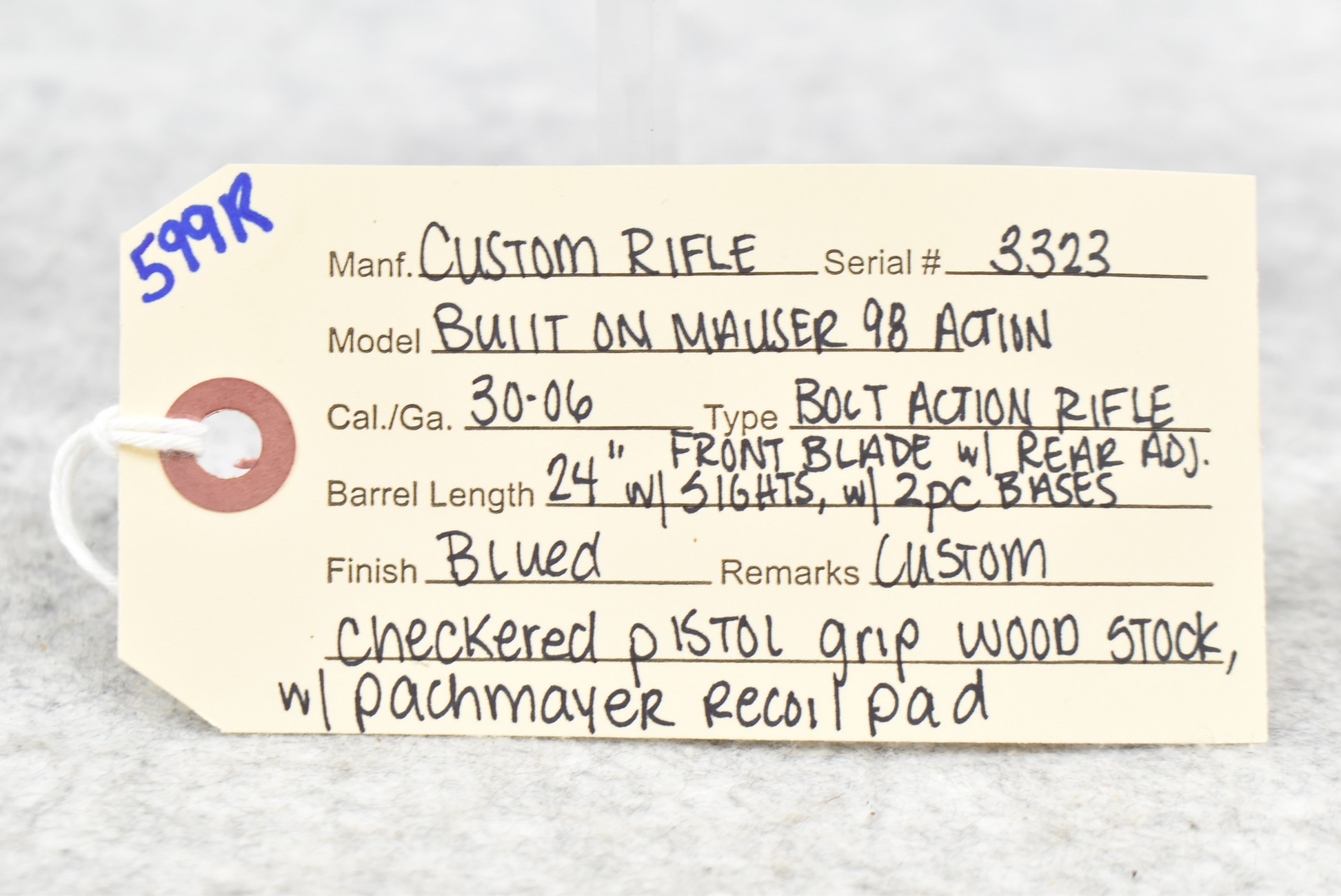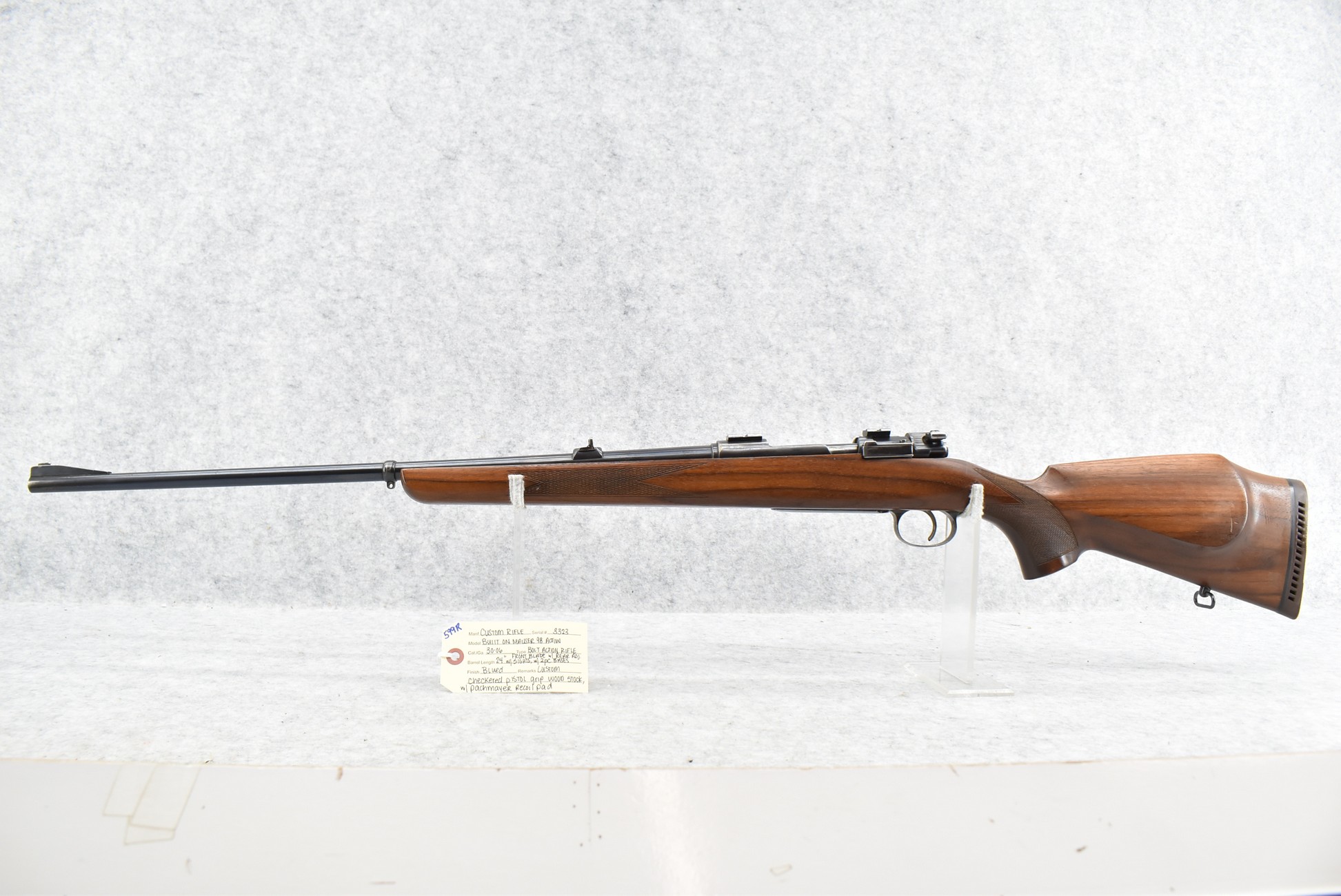 599R.     Custom Rifle – Built on Mauser Mod. 98 Action – 30-06 Cal. Bolt Action Rifle – w/24” Barrel w/Blade Front and Adjustable Rear Sights – Blued Finish – w/Custom Checkered Pistol Grip Wood Stock w/Pachmayr Recoil Pad – w/2-Piece Scope Bases