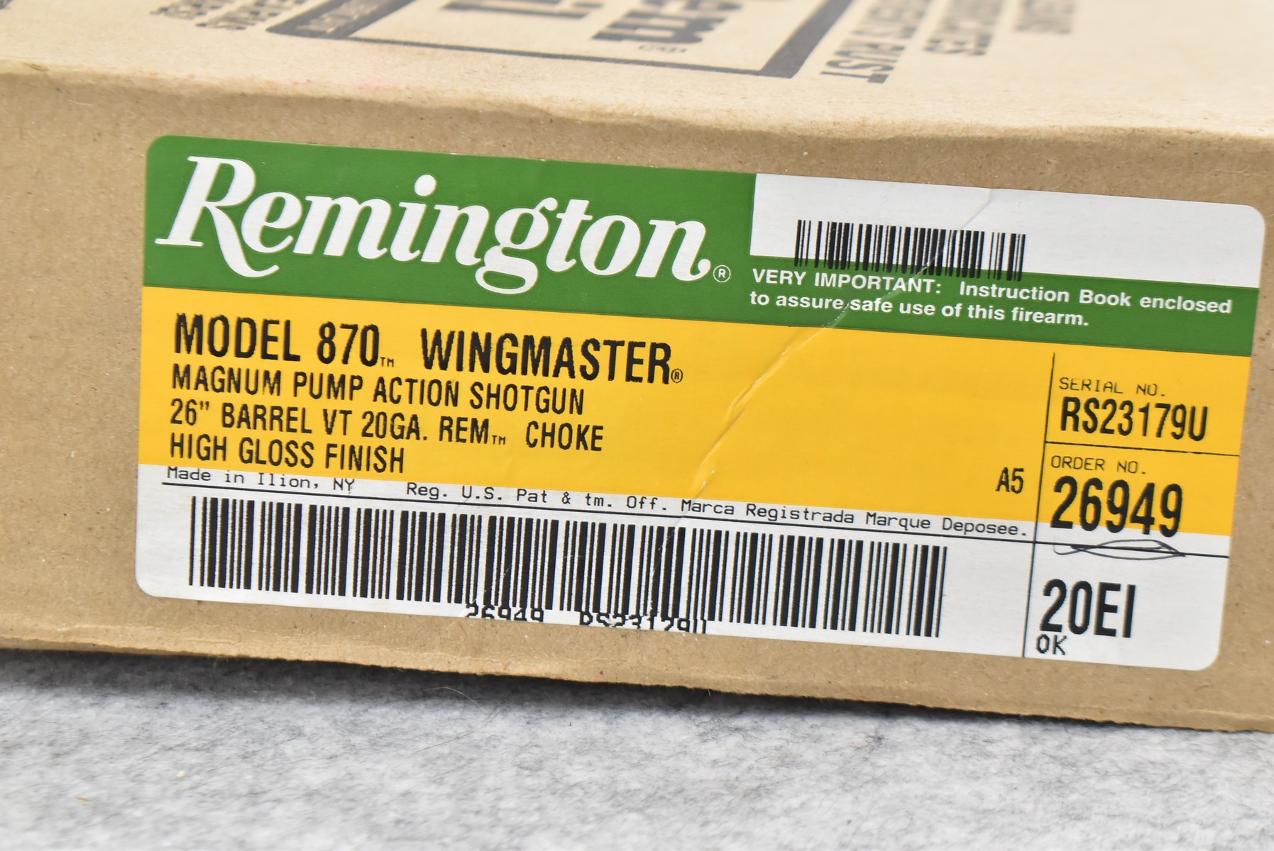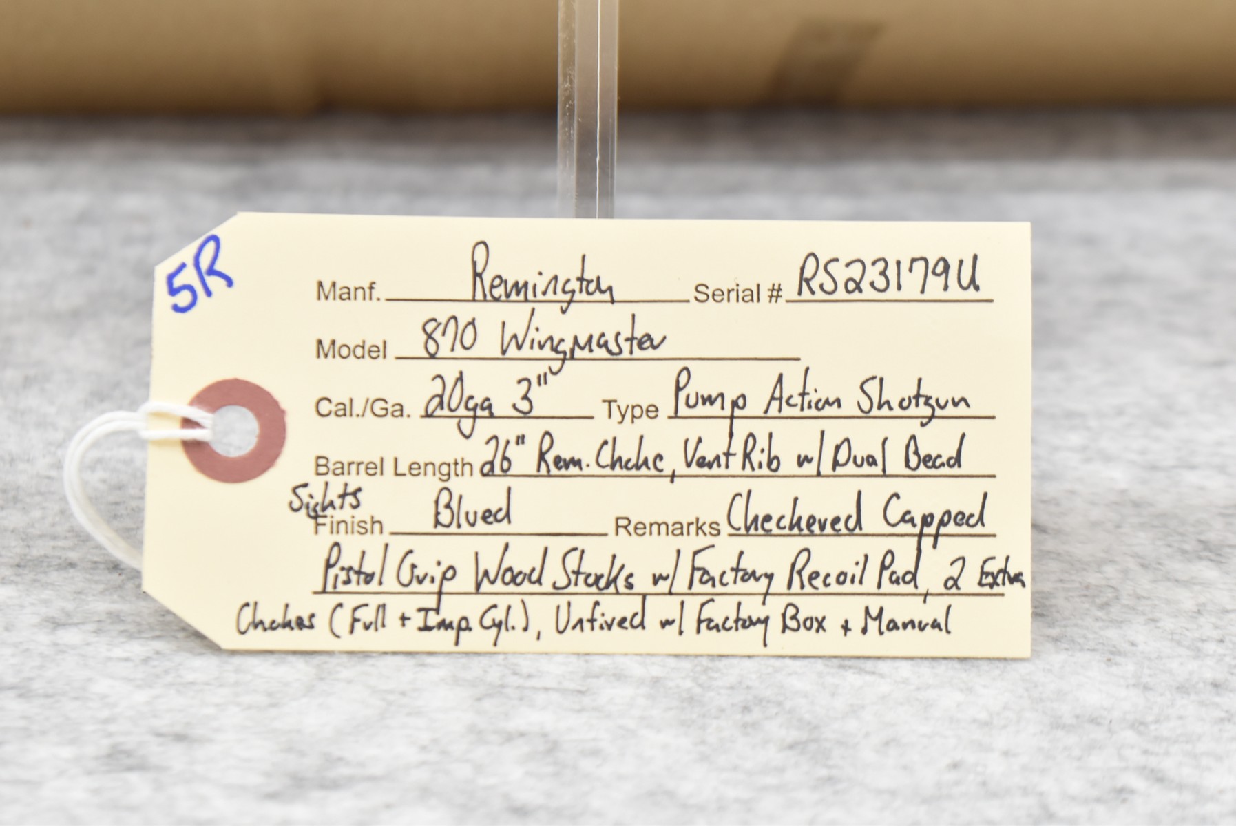 5R. Remington – Mod. 870 Wingmaster – 20ga. 3” Pump Action Shotgun – w/26” Rem. Choked Vent Rib Barrel w/Dual Bead Sights – Blued Finish – w/Checkered Capped Pistol Grip Wood Stocks w/Factory Recoil Pad – w/2 Extra Full/Imp. Cyl. Chokes – Unfired w/Factory Box and Manual