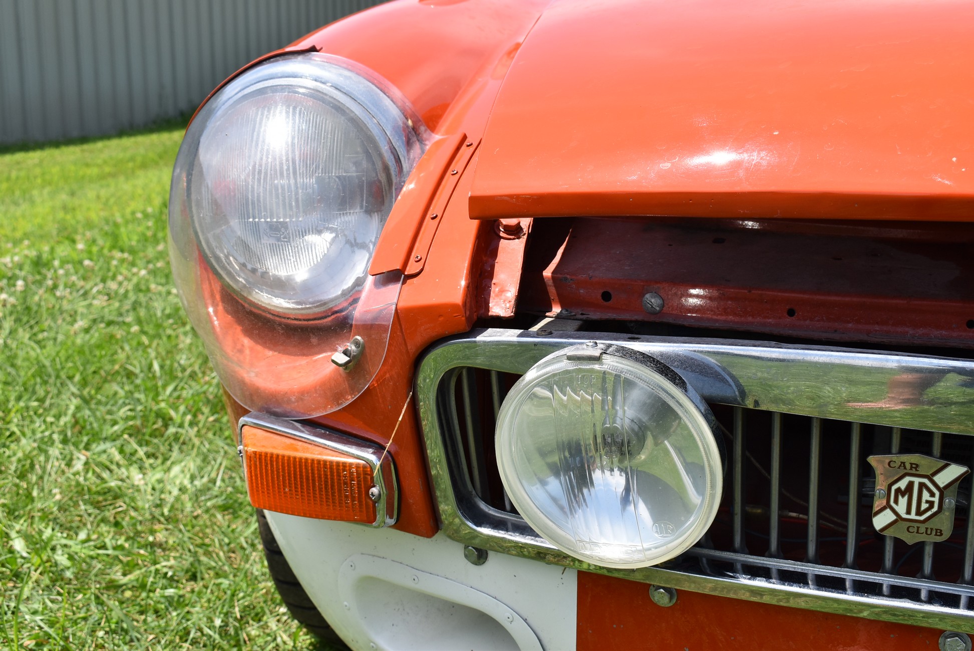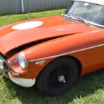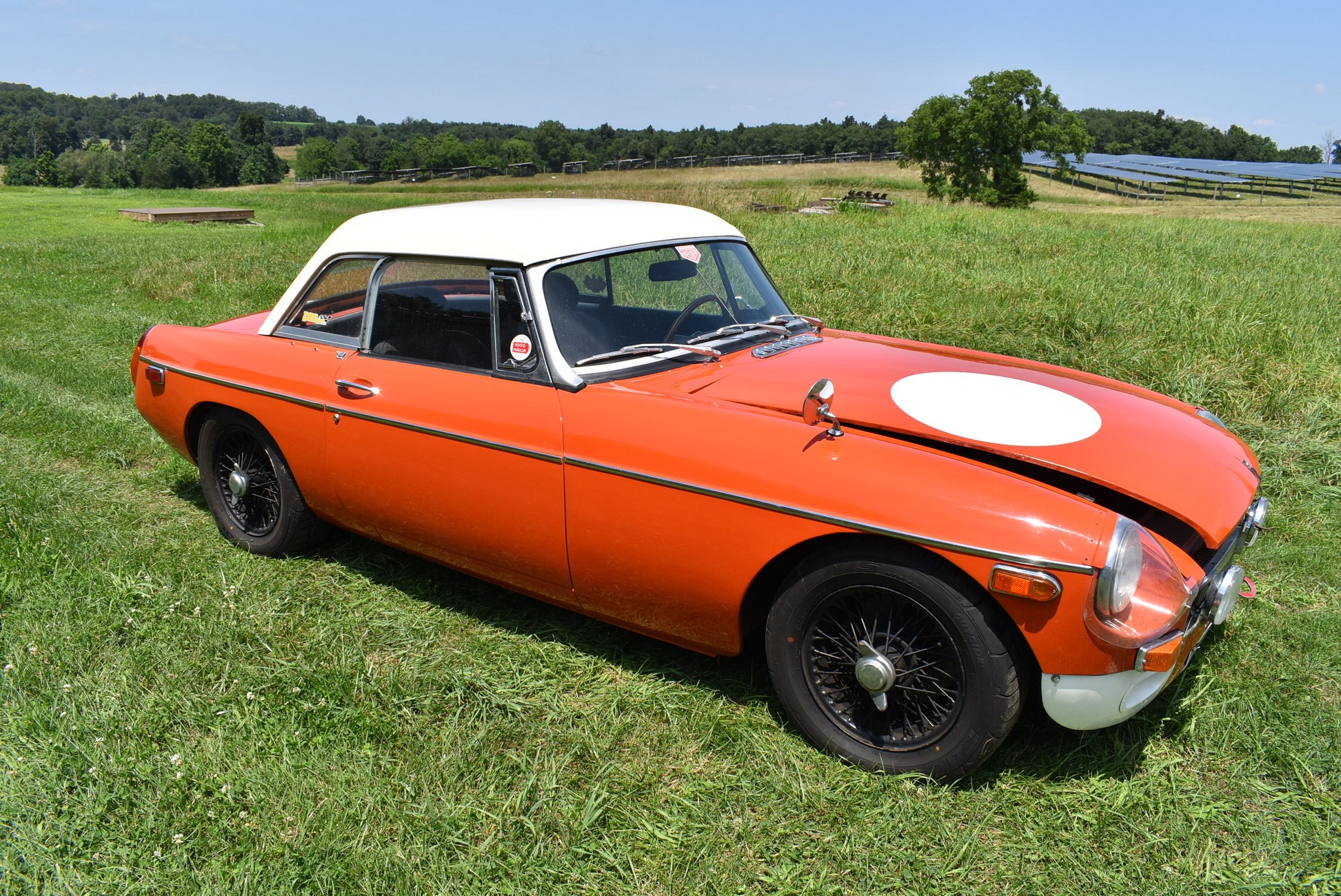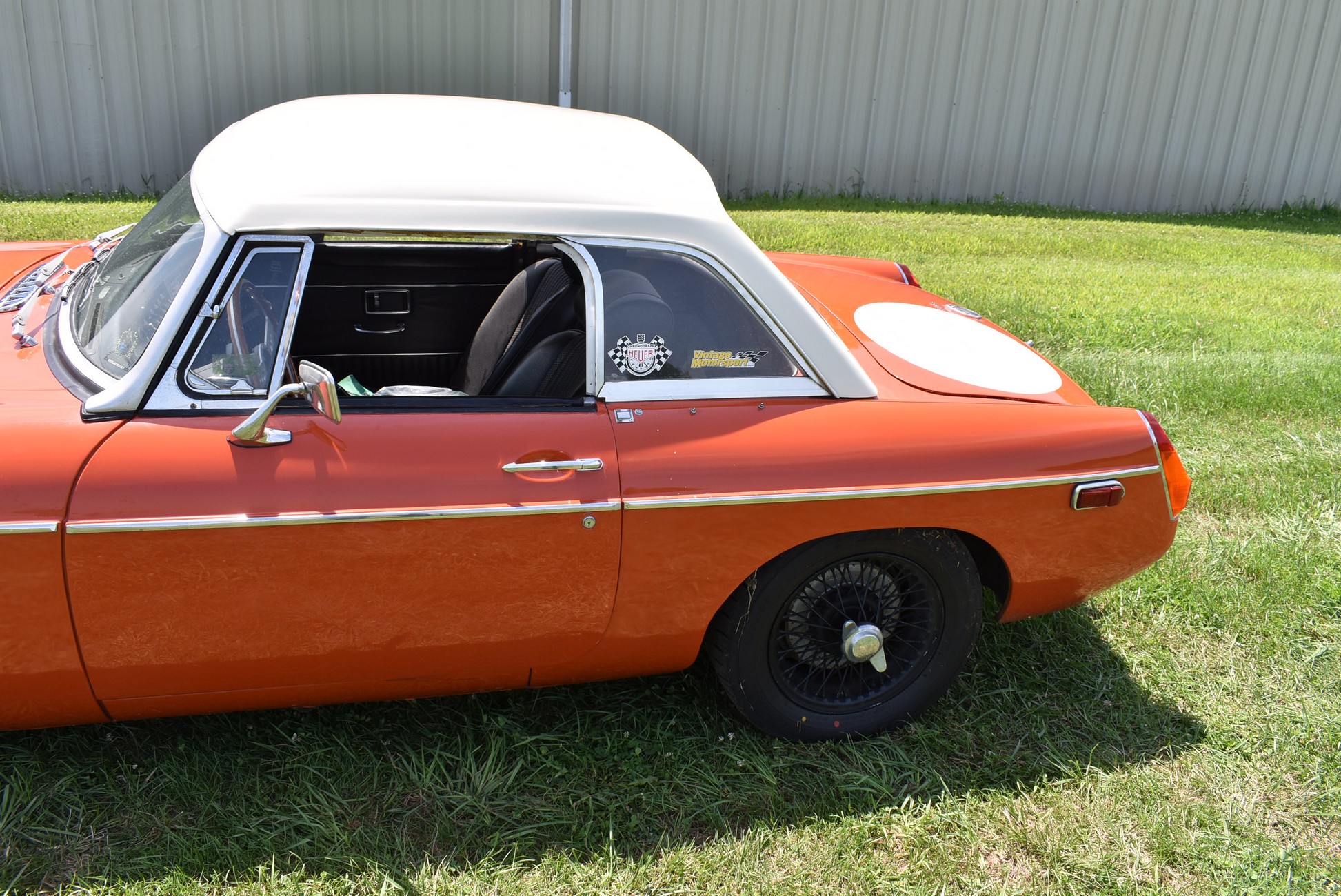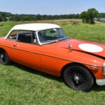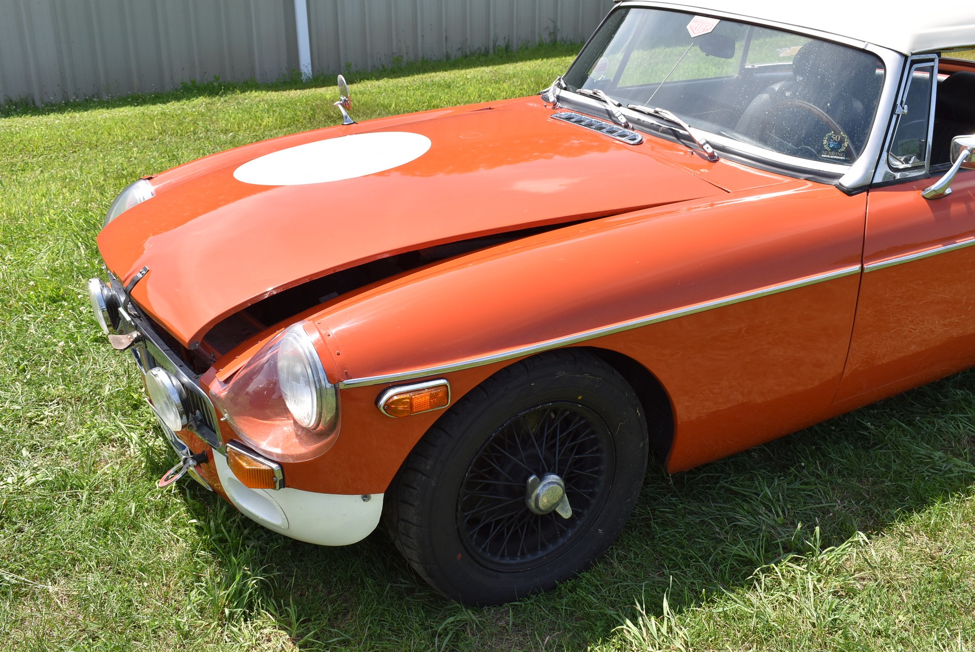 6. 1971 MG MGB Convertible Made to Look like 1965 Sebring MGB “Tribute” – 1.8L 4cyl. Engine – 53,062 Miles Showing on the Odometer – 4spd. Transmission w/Overdrive – Equipped w/Metal Dash, Greens Racing Pads, Covered Head Lights, Single 12v Battery, PECO Manifold & Exhaust, Original Factory MGB Hardtop & 5 ½” Powder Coated Spokes “Racing Wheels” – Black Interior – Orange/White Exterior – Pace Car for Inaugural Carolina Trophy Rally Race – Vin#: GHN5UB227681G