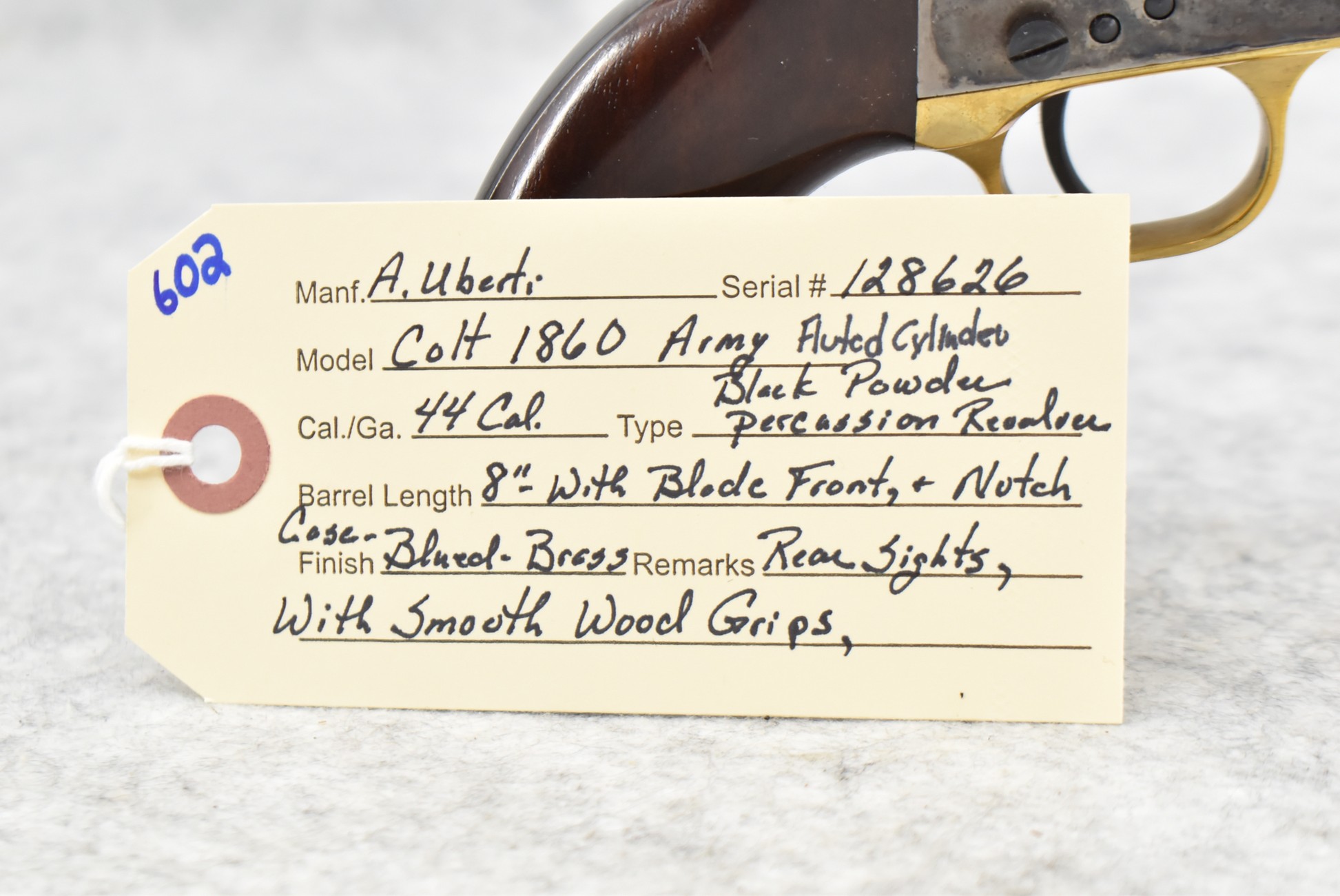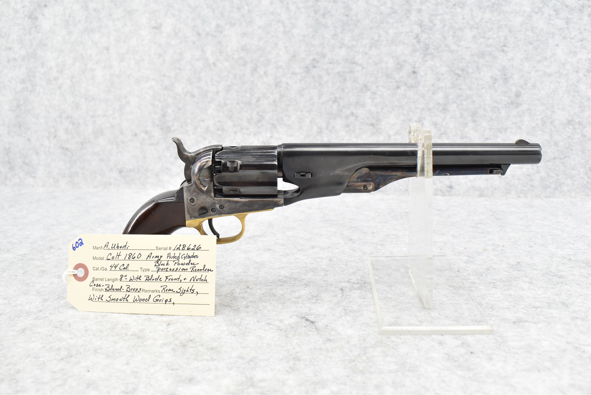 602.        A. Uberti – Colt Mod. 1860 Army Fluted Cylinder – 44 Cal. Black Powder Percussion Revolver – w/8” Barrel w/Blade Front & Notch Rear Sights – Case Hardened/Blued Finish – w/Smooth Wood Grips