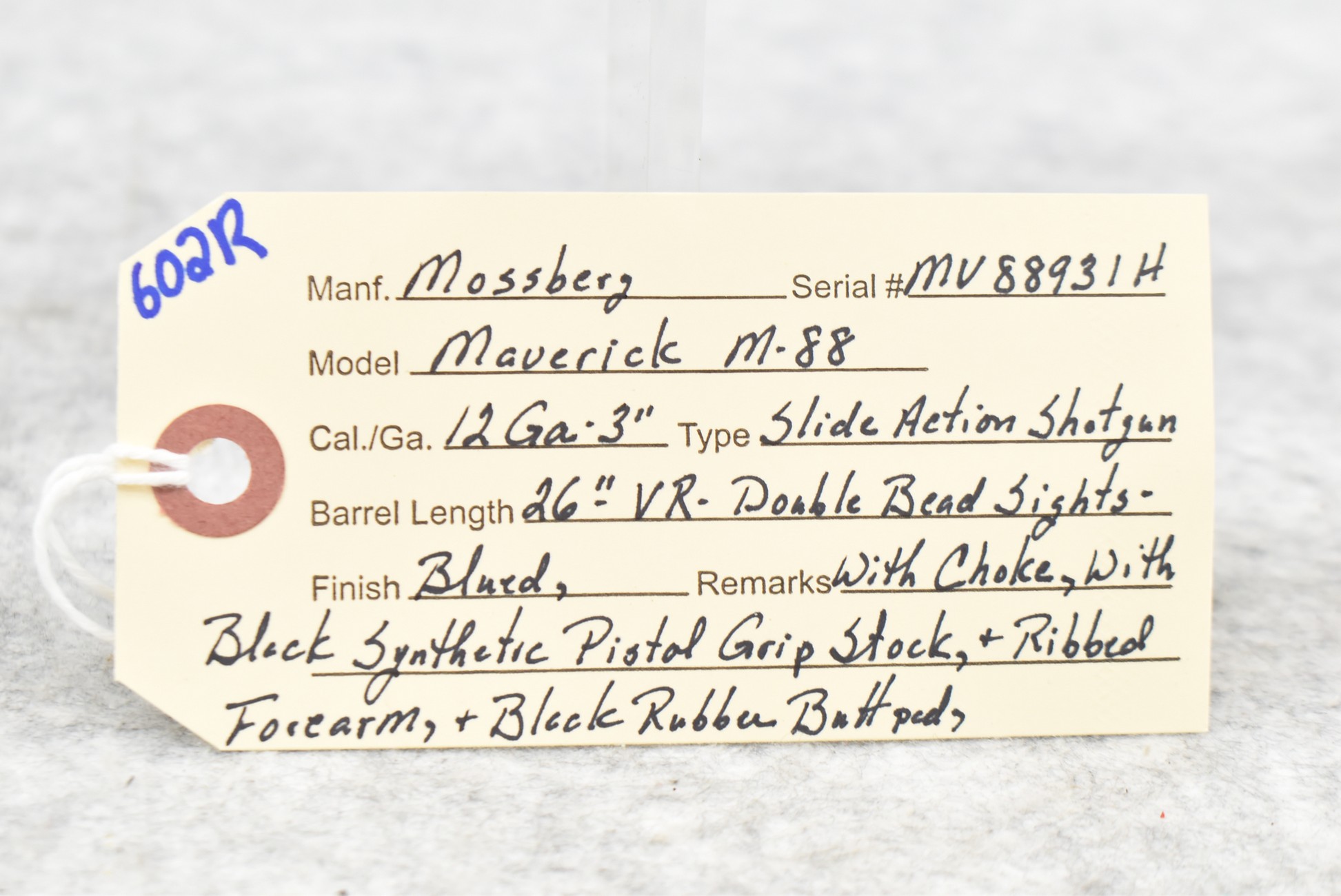 602R. Mossberg – Mod. Maverick M-88 – 12ga. 3” Pump Action Shotgun – w/26” Vent-Rib Barrel w/Double Bead Sight – Blued Finish – w/Black Synthetic Pistol Grip Stock w/Butt Pad & Ribbed Forearm