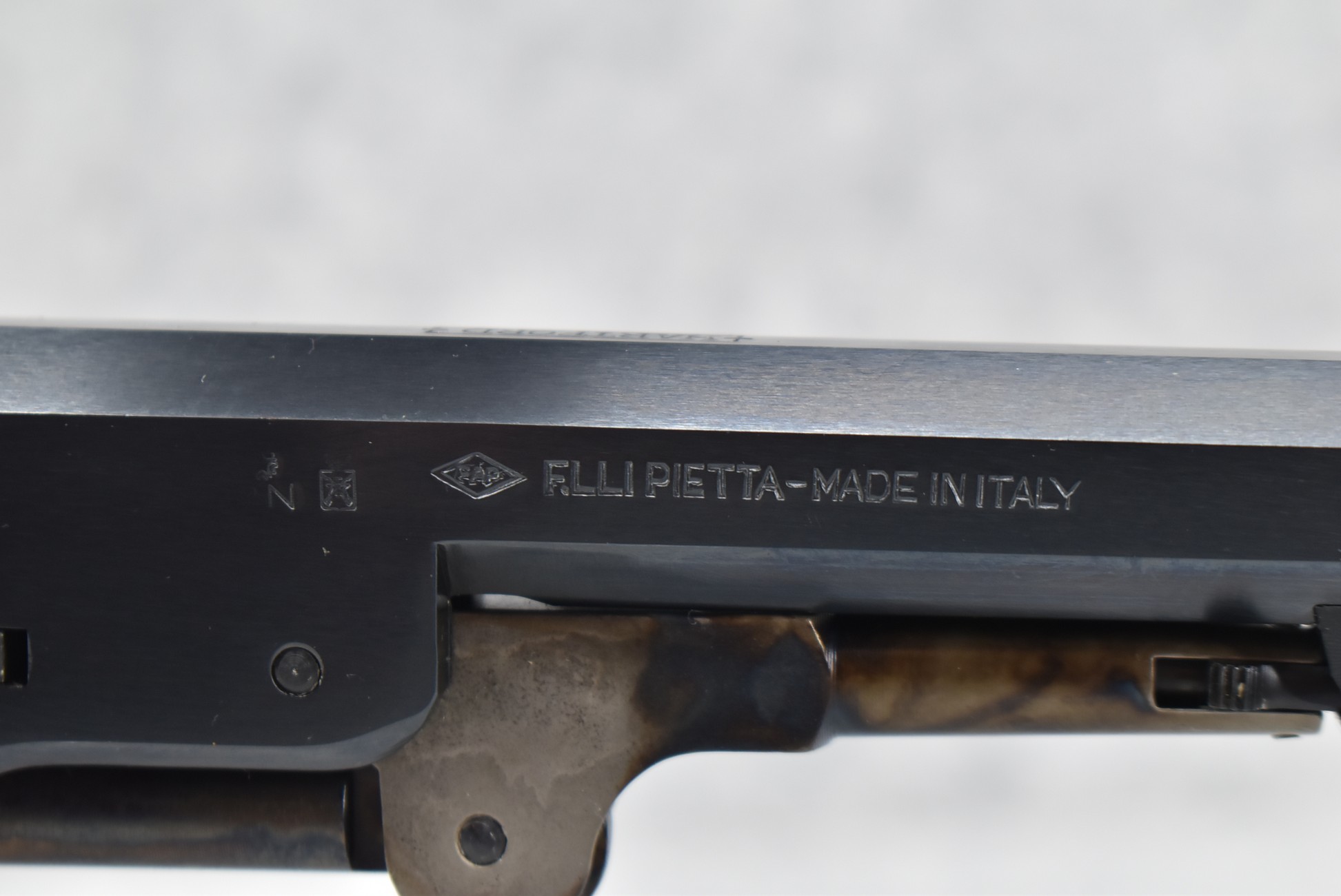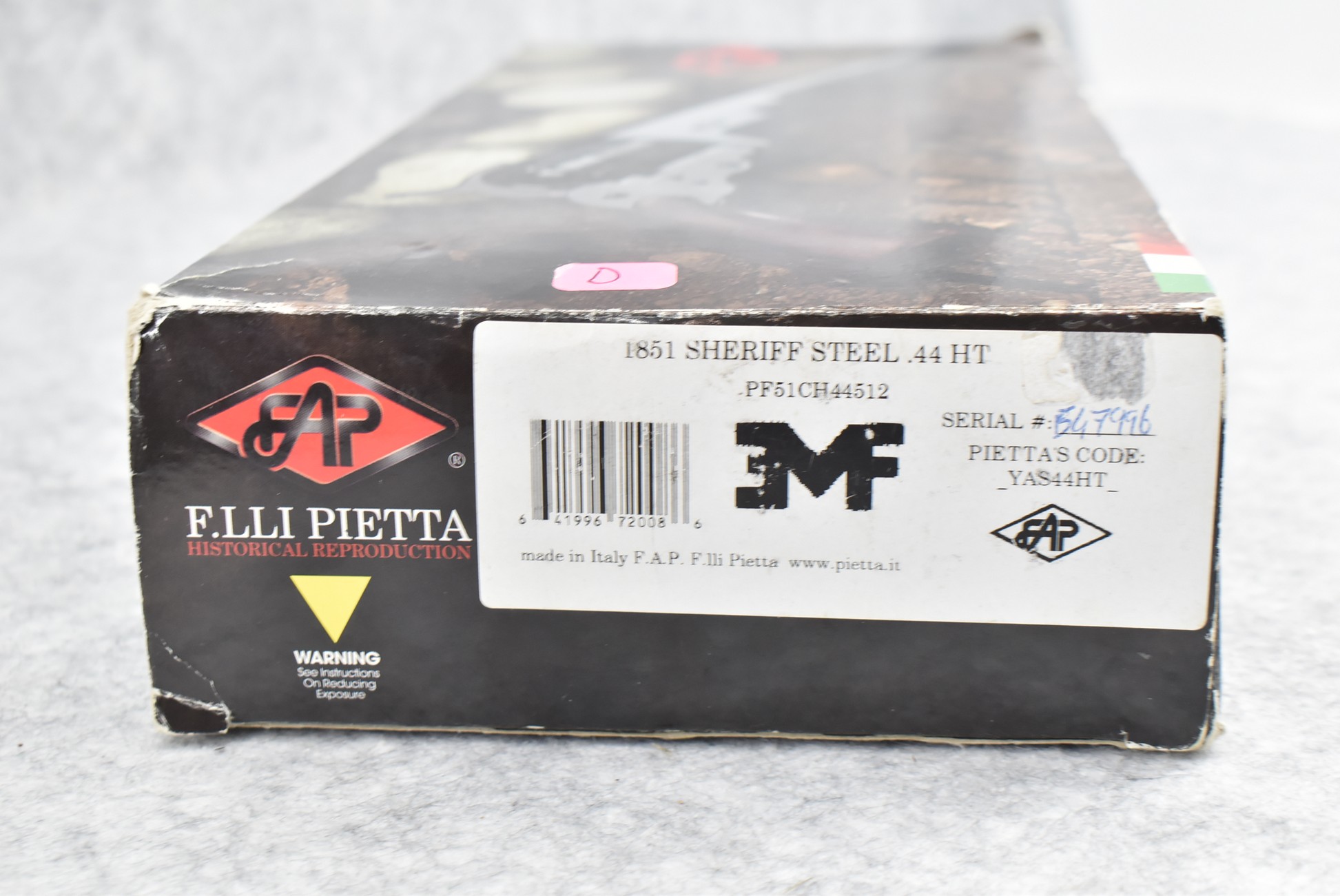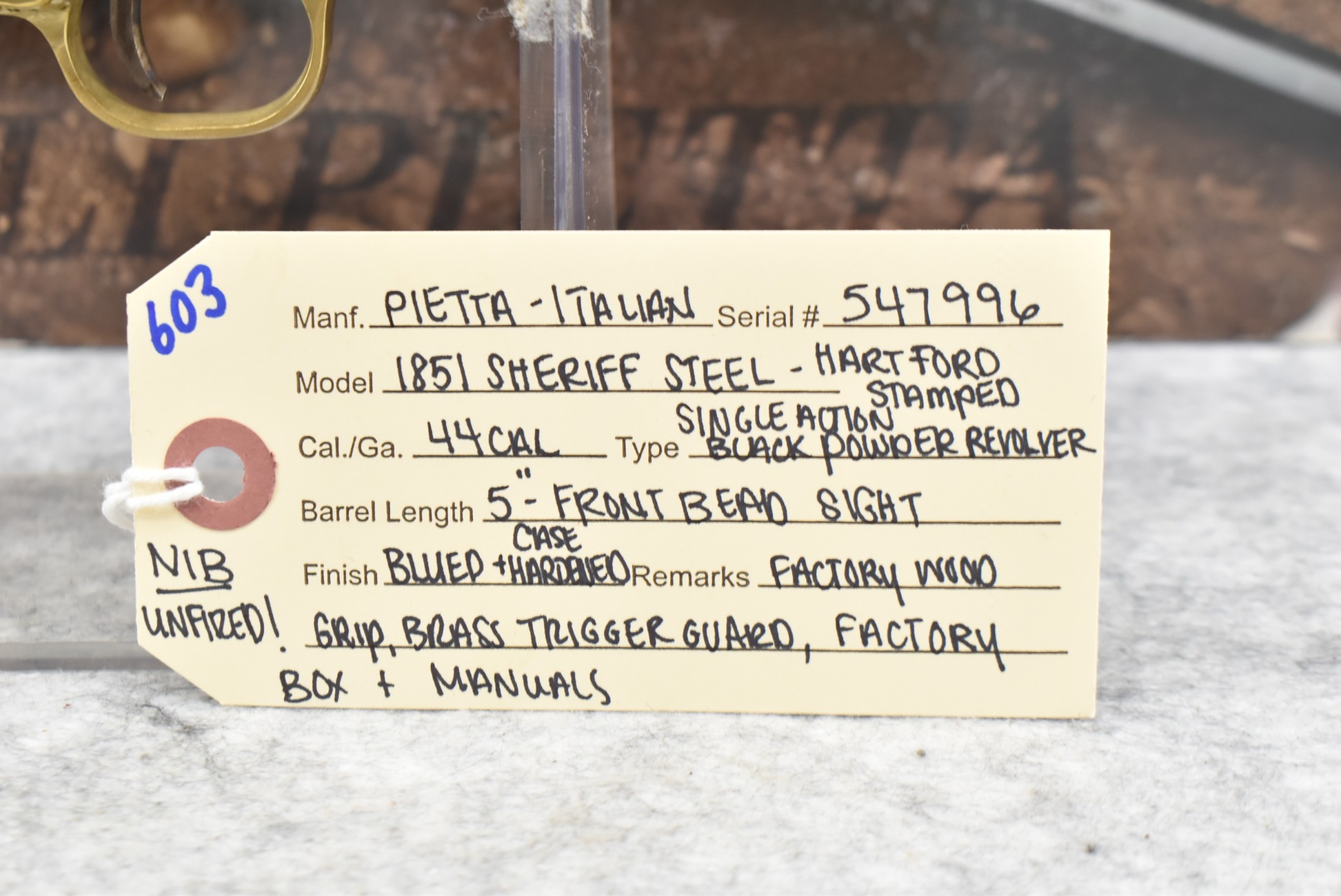 603. Pietta-Italian – Mod. 1851 Sheriff Steel (Hartford Stamped) – 44 Cal. Black Powder Revolver – w/5” Barrel w/Front Bead Sight – Blued/Case Hardened Finish – w/Brass Trigger Guard – w/Factory Wood Grip – Unfired & New w/Factory Box & Manuals