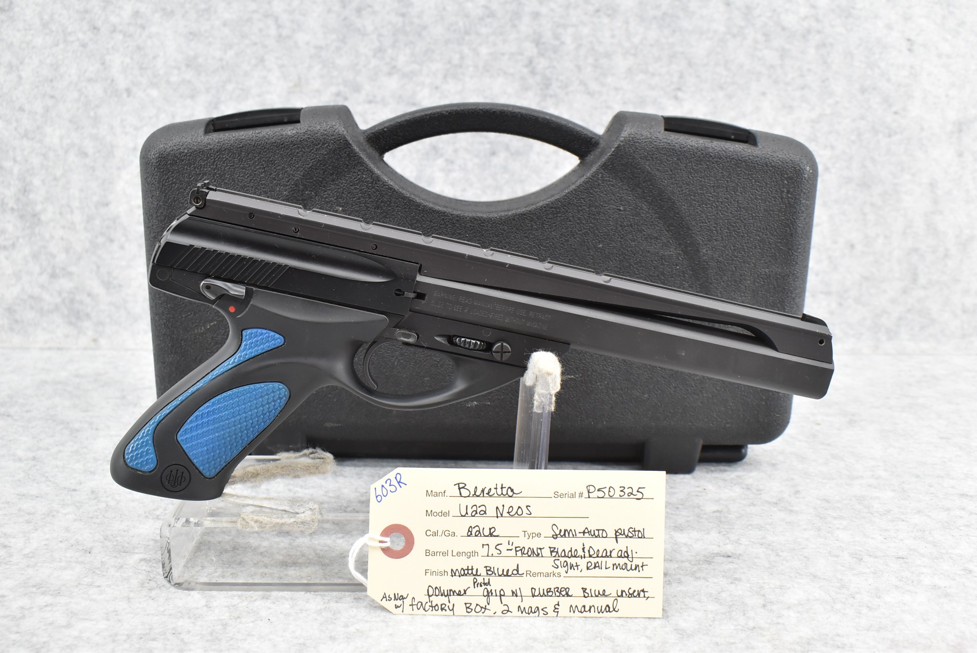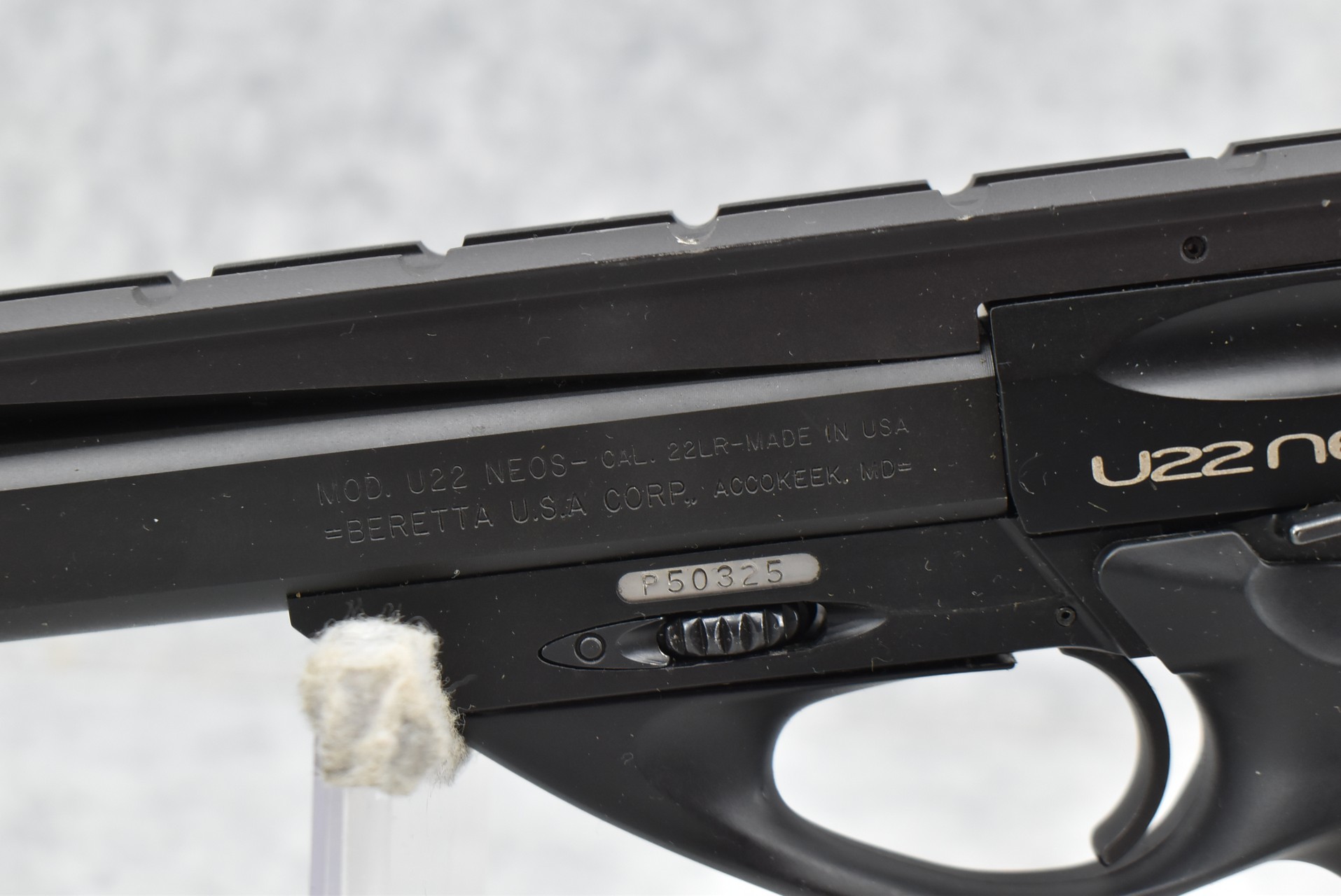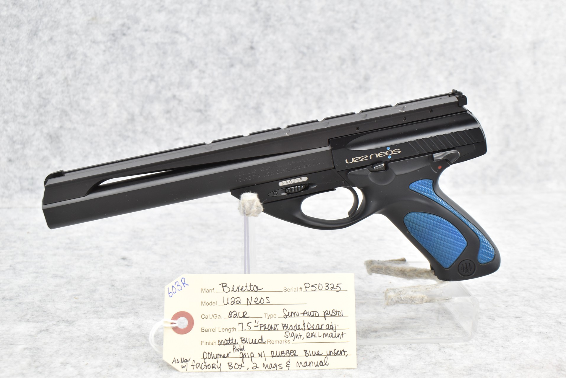 603R. Beretta – Mod. U22 NEOS – 22LR Cal. Semi-Auto Pistol – w/7.5” Barrel w/Front Blade & Rear Adj. Sights – Matte Blued Finish – w/Polymer Pistol Grip w/Rubber Blue Insert – w/Rail Mount – As New w/Factory Box, 2 Mags & Manual