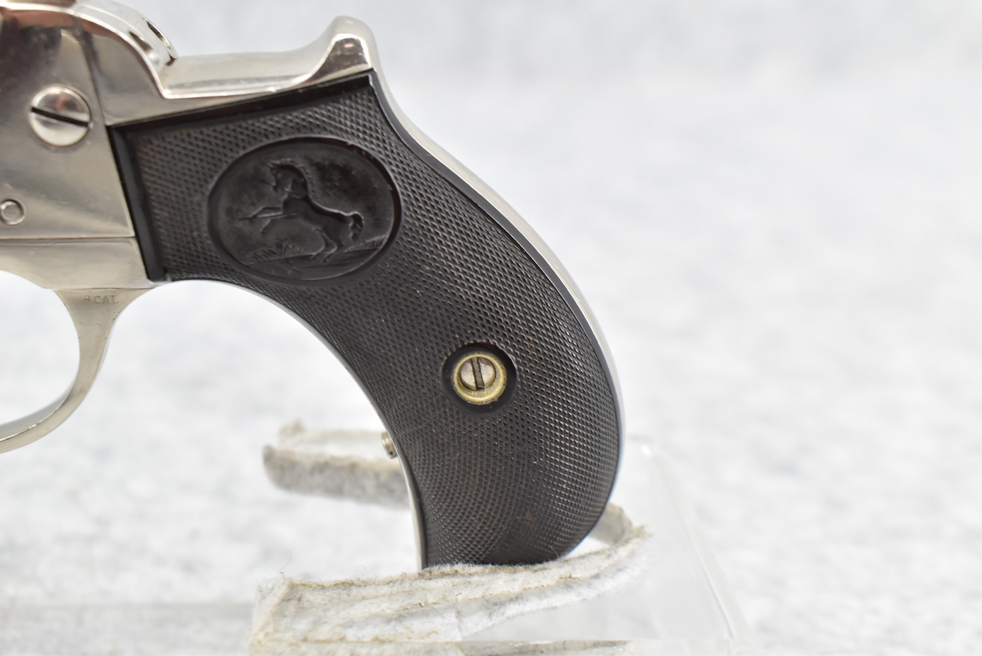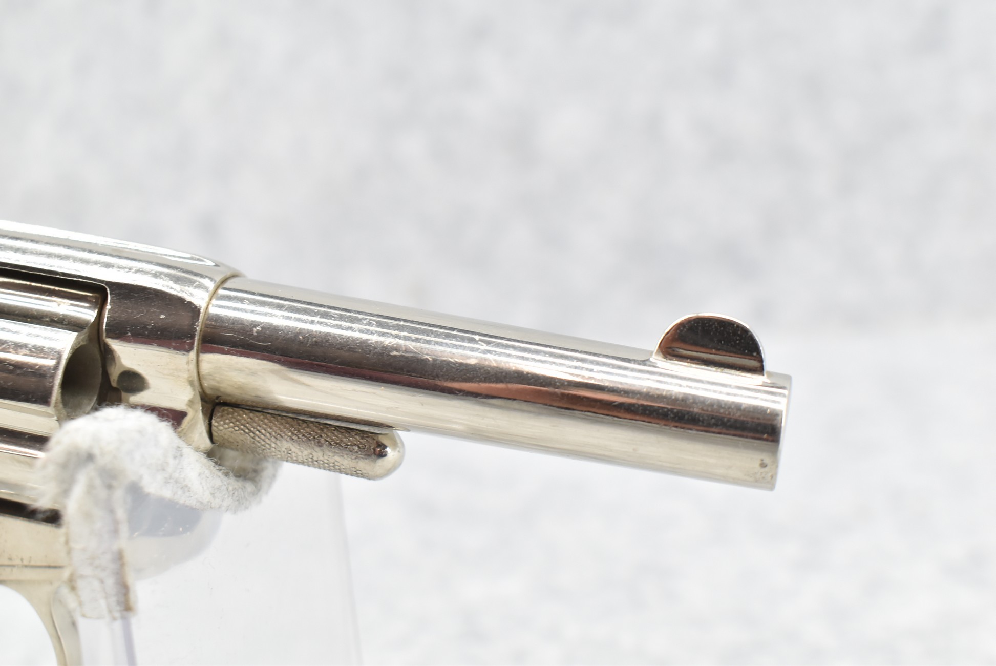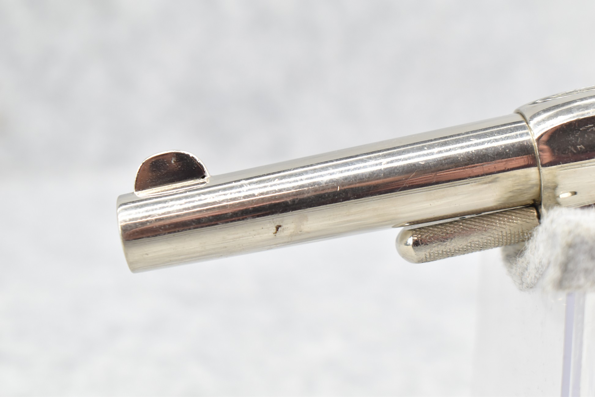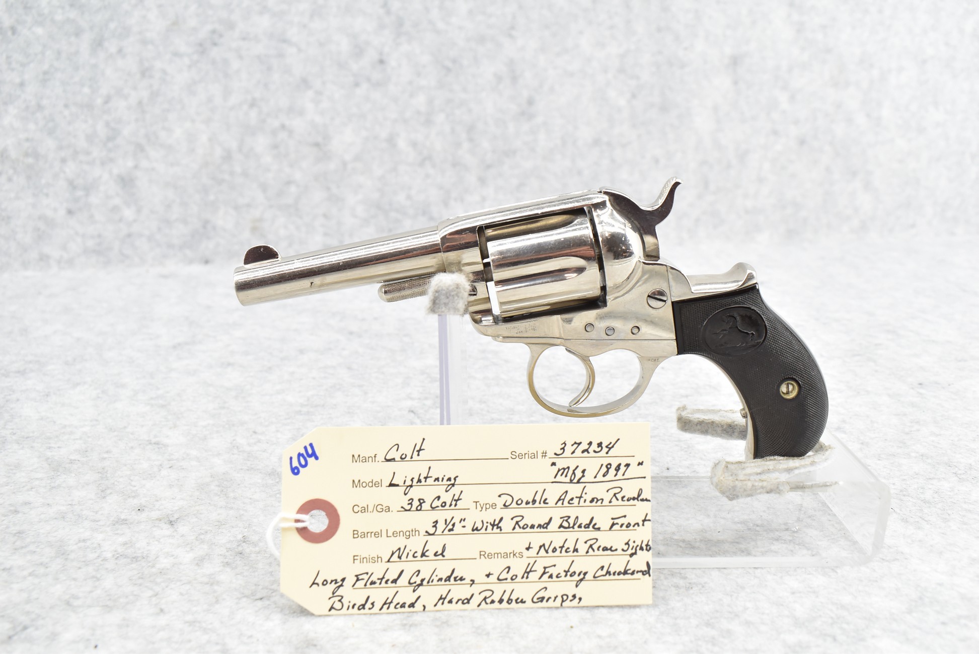 604. Colt – Mod. Lightning – 38 Colt Cal. Double Action Revolver – w/3 ½” Barrel w/Round Blade Front & Notch Rear Sights – Nickel Finish – w/Long Fluted Cylinder – w/Colt Factory Checkered Birds Head Hard Rubber Grips – Mfg. 1897