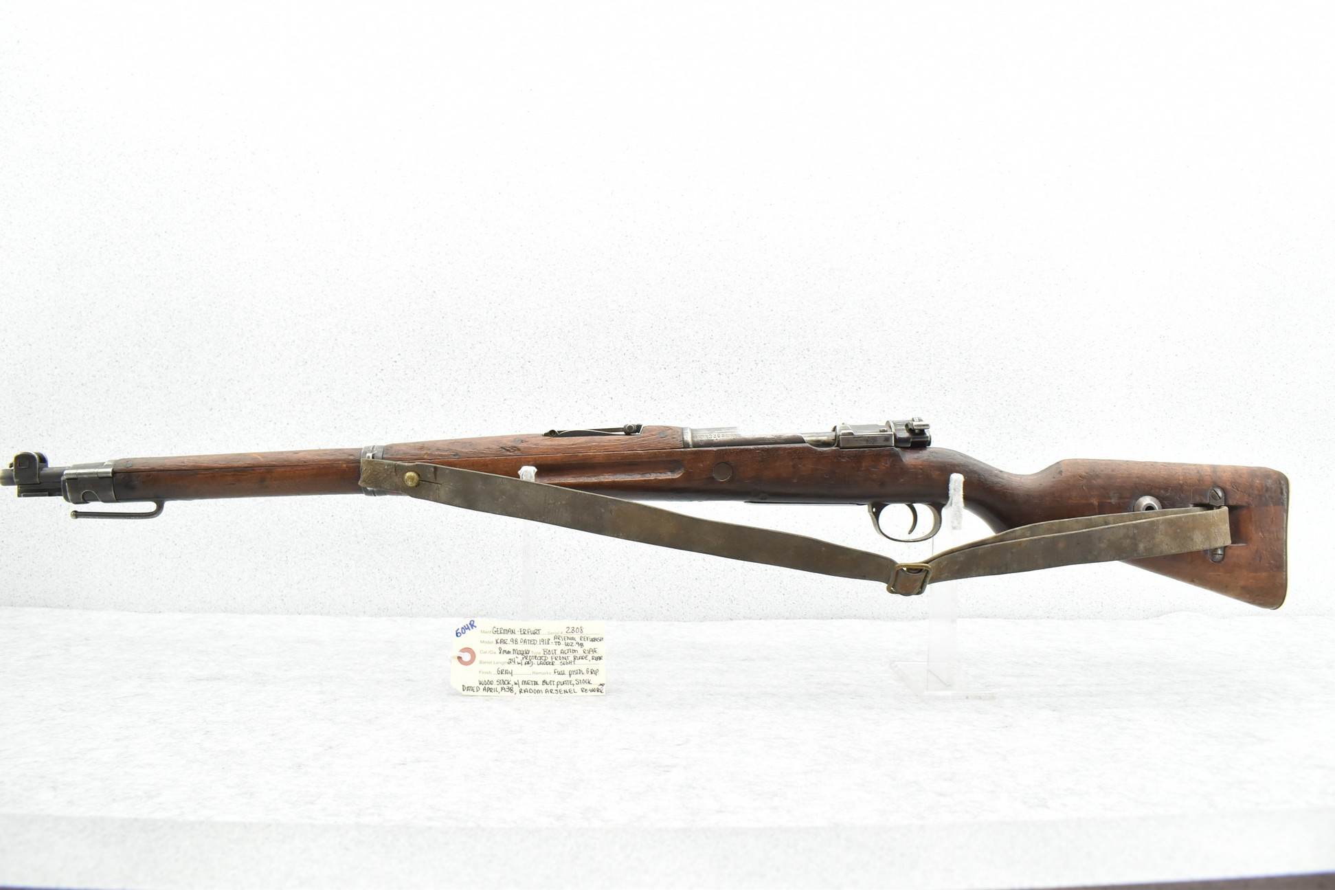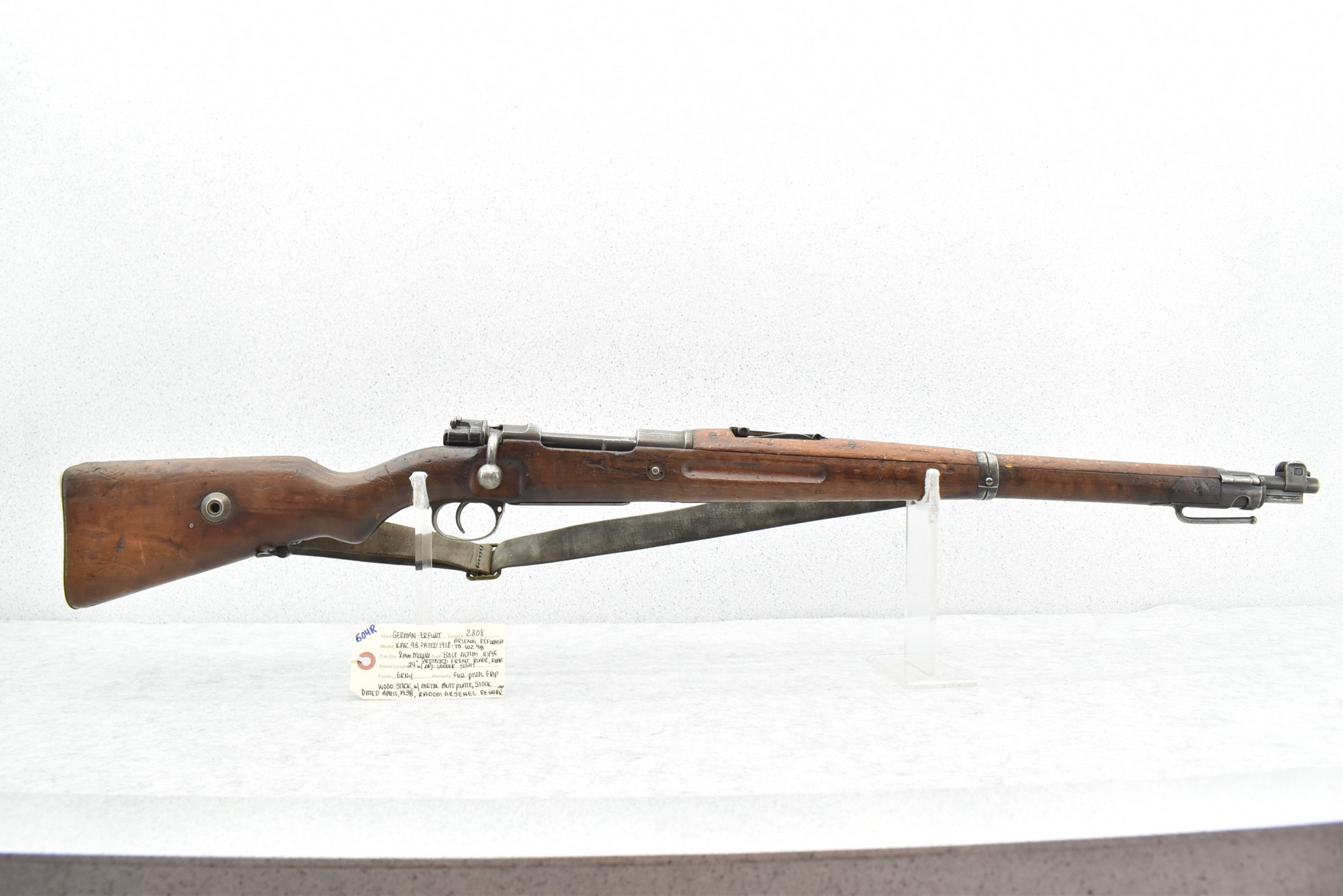 604R. Erfurt (German) – Mod. Kar 98 (Radom Arsenal Refurbish to WZ.98) – 8mm Mauser Cal. Bolt Action Rifle – w/24” Barrel w/Protected Front Blade & Rear Adj. Ladder Sights – Gray Finish – w/Full Pistol Grip Wood Stock w/Metal Butt Plate – w/Leather Military Sling – Stock Marked w/Multiple Radom Arsenal Rebuild Markings & Dated April 1938 – Dated 1918 – No Visible Import Mark
