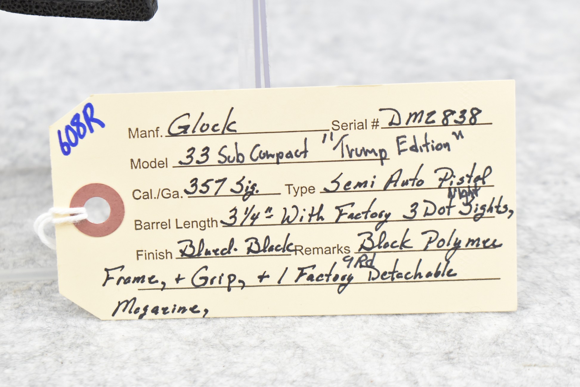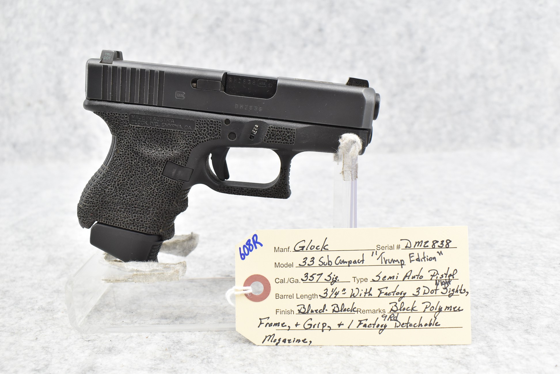 608R. Glock – Mod. 33 Sub Compact “Trump Edition” – 357 Sig Cal. Semi-Auto Pistol – w/3 ¼” Barrel w/Factory 3-Dot Night Sights – Blued Finish – w/Black Polymer Frame & Grip – w/Factory 9Rd Detachable Mag