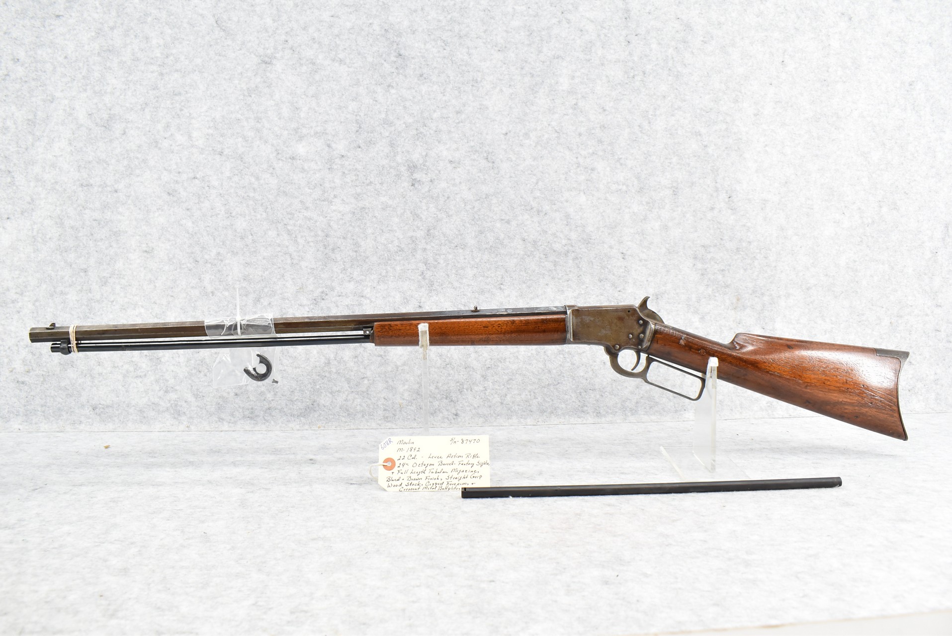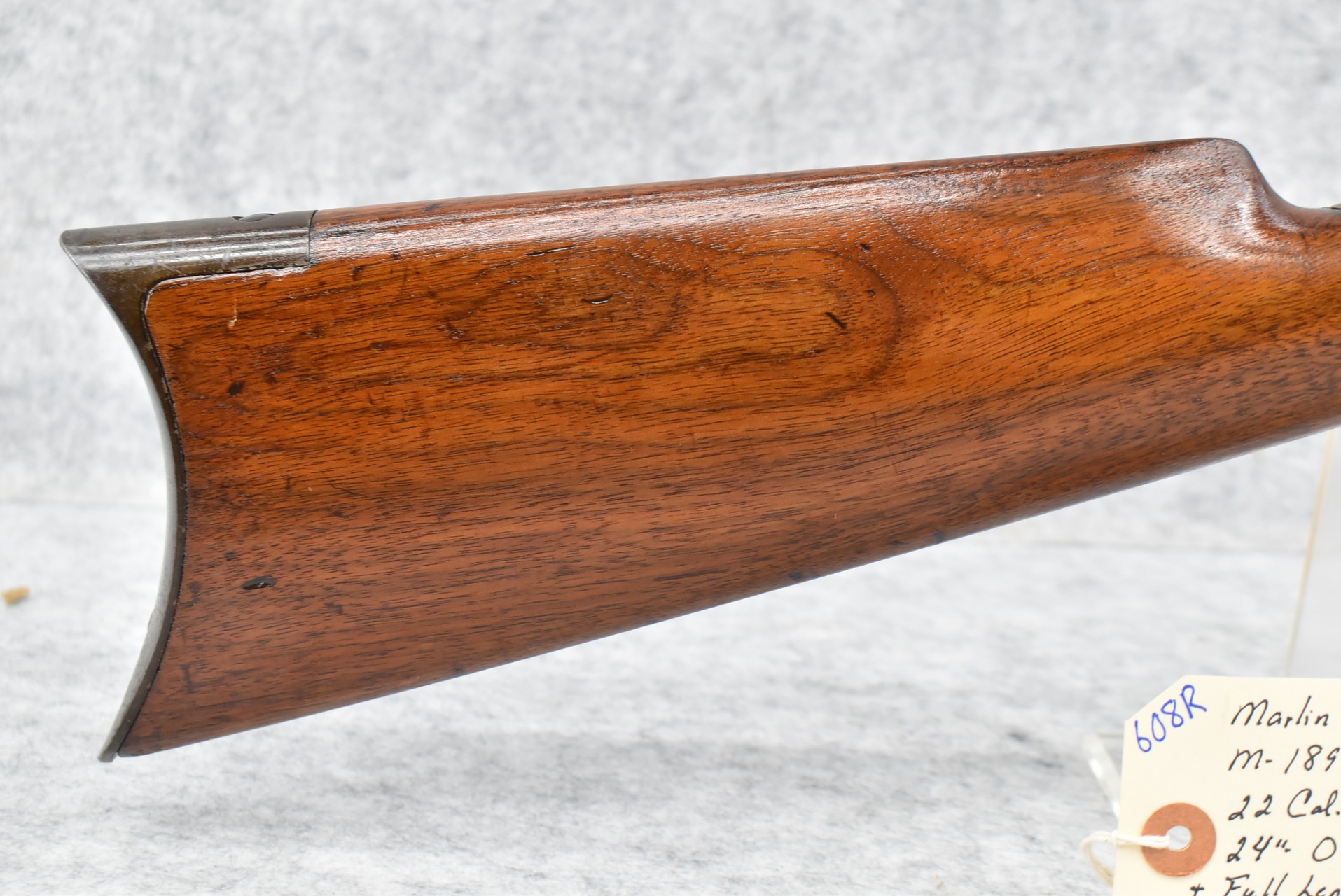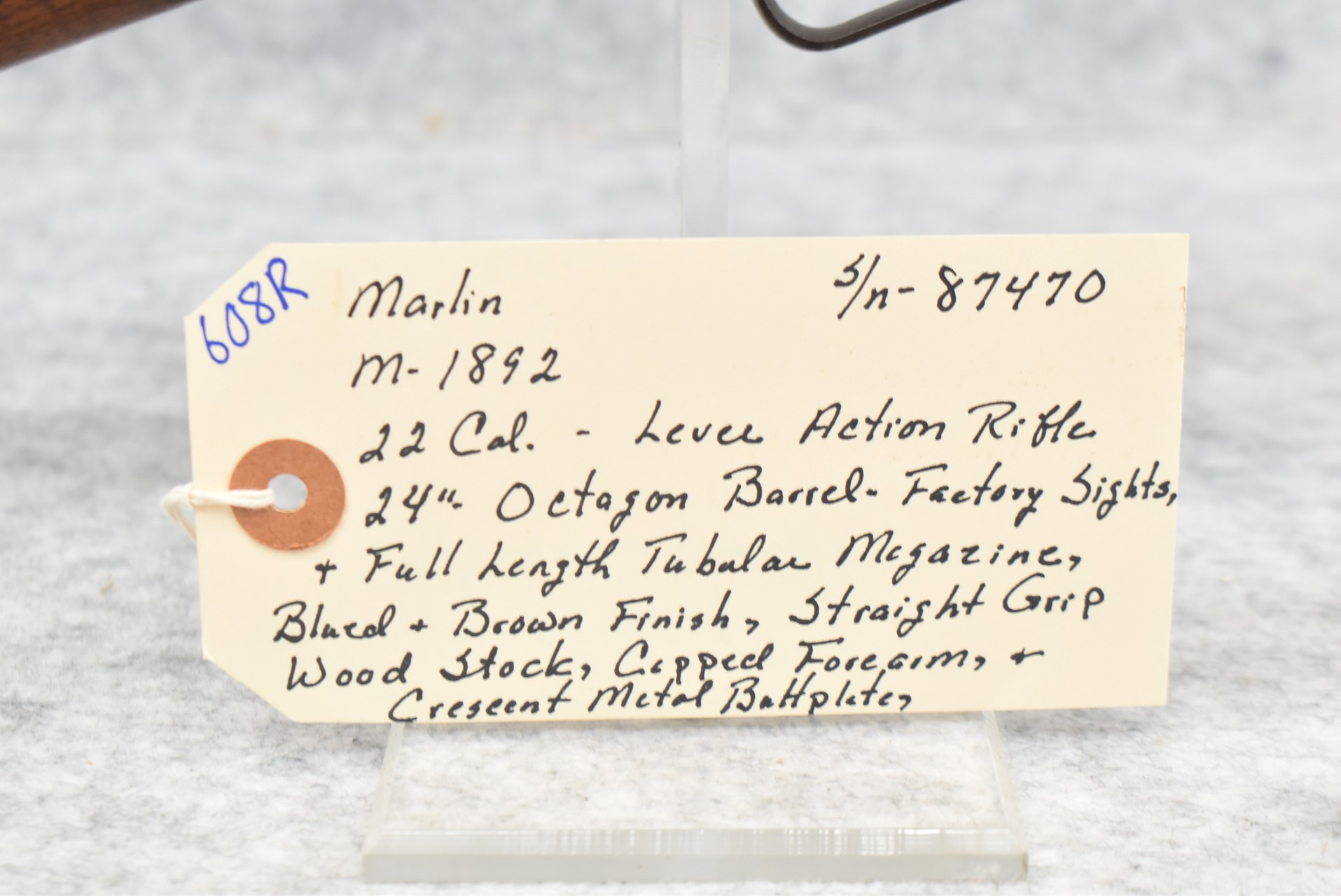 608R. Marlin – Mod. 1892 – 22 Cal. Lever Action Rifle – w/24” Octagon Barrel w/Factory Sights & Full Length Tubular Magazine – Blued & Brown Finish – w/Straight Grip Wood Stock & Capped Forearm w/Crescent Metal Butt Plate – Has Original Magazine Tube w/Gun, a Replacement Tube is Currently in the Gun – Note: Forearm Issues