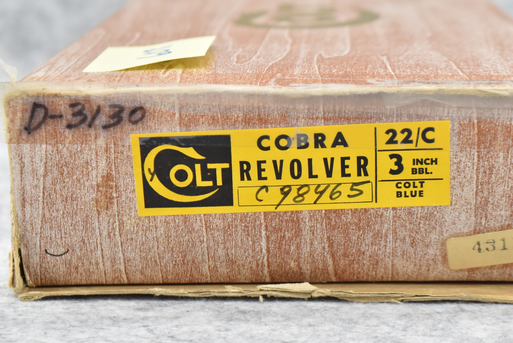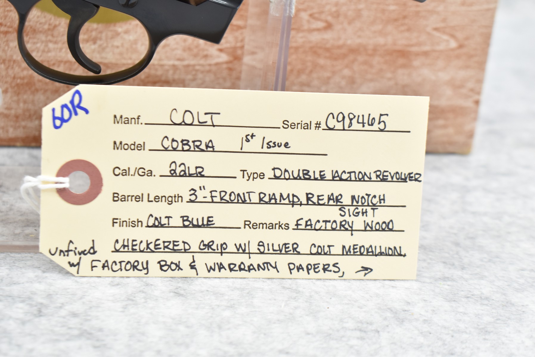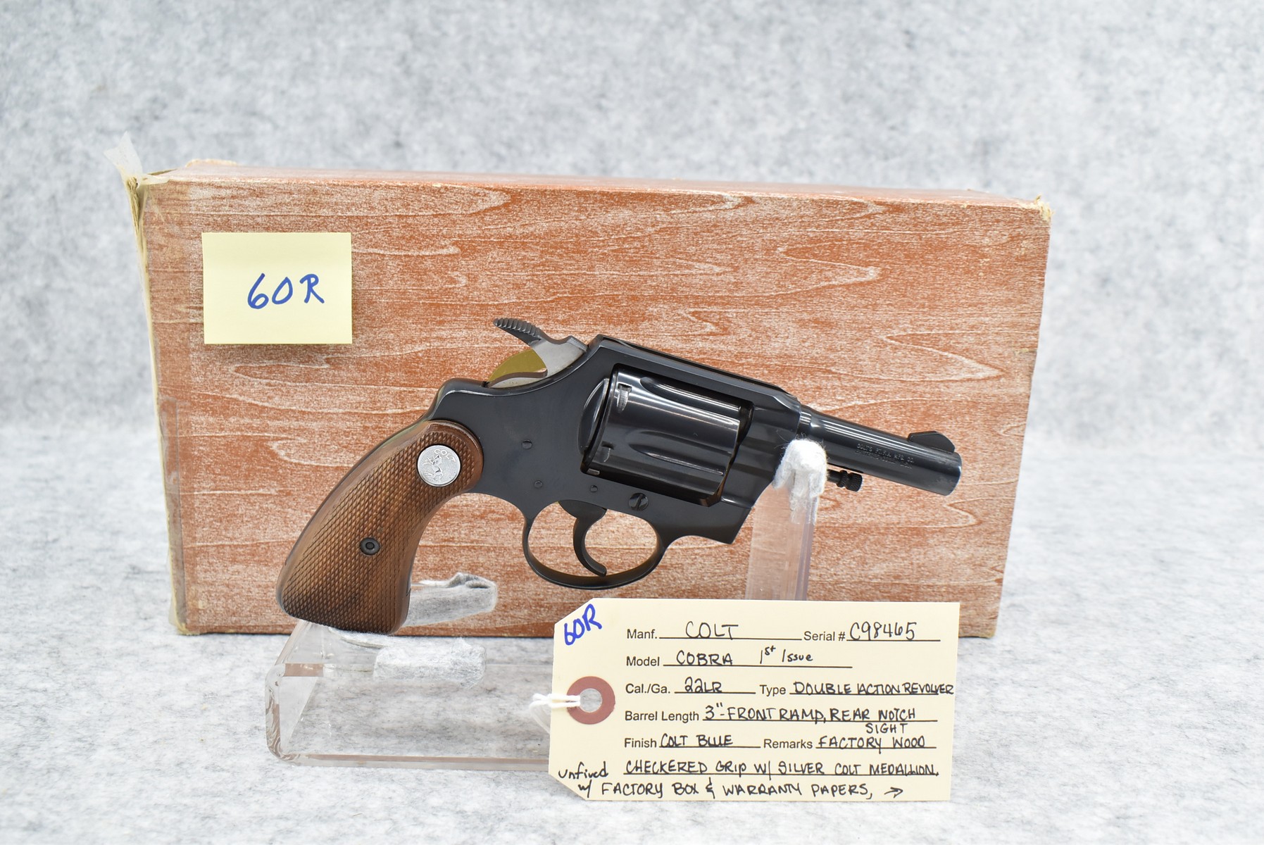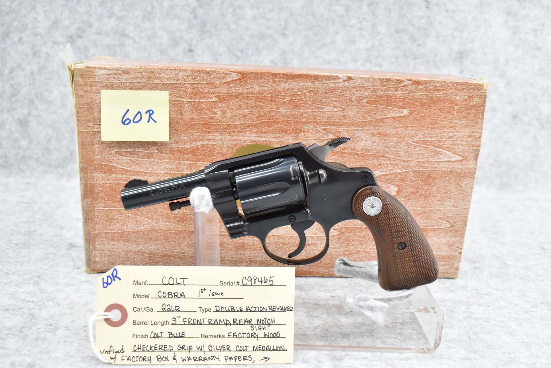 60R. Colt – Mod. Cobra 1st Issue – 22LR Cal. Double Action Revolver – w/3” Barrel w/Front Ramp & Rear Notch Sights – Blued Finish – w/Factory Wood Checkered Grip w/Silver Colt Medallion – Unfired w/Factory Box, Warranty Papers & Factory Repair Order Dated 1976