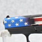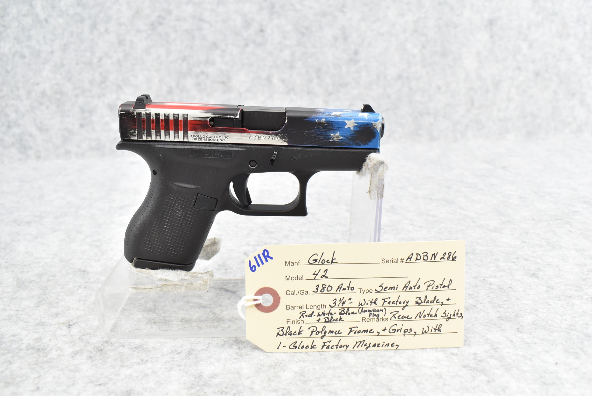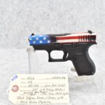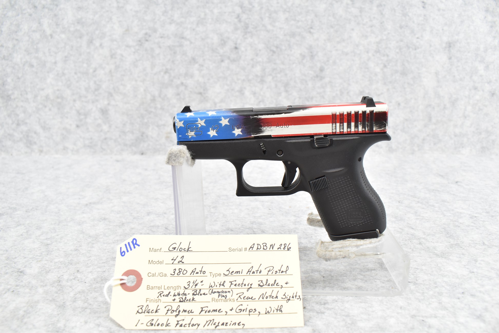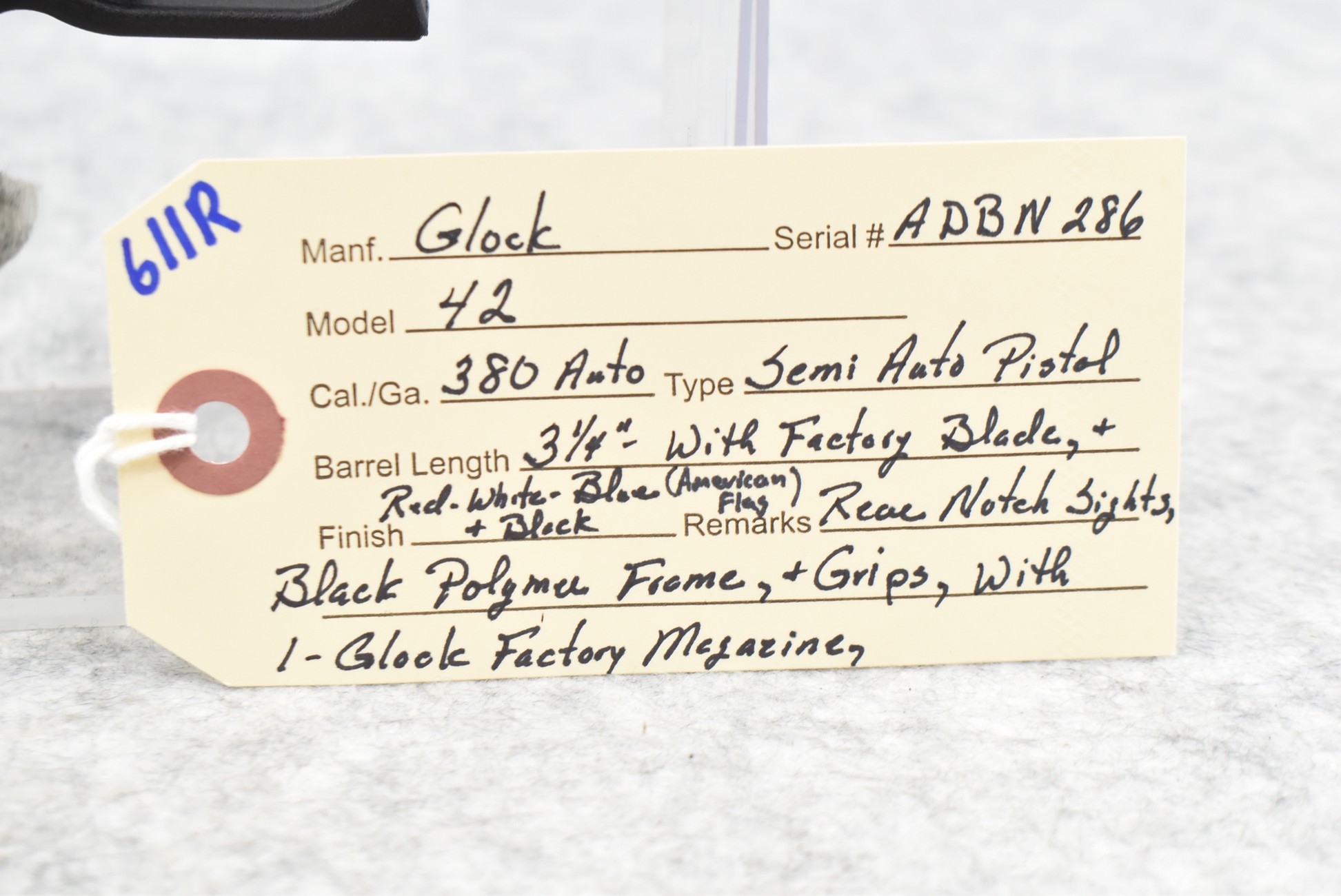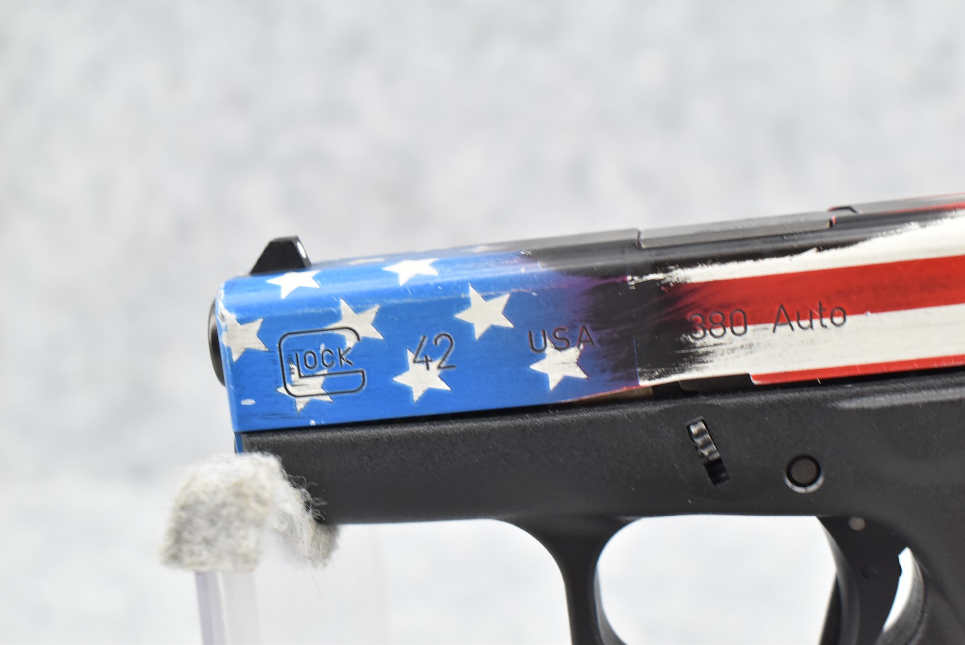 611R. Glock – Mod. 42 – 380 Auto Cal. Semi-Auto Pistol – w/3 ¼” Barrel w/Factory Blade & Rear Notch Sights – Red, White & Blue (American Flag) & Matte Black Finish – w/Black Polymer Frame & Grips – w/Glock Factory Magazine