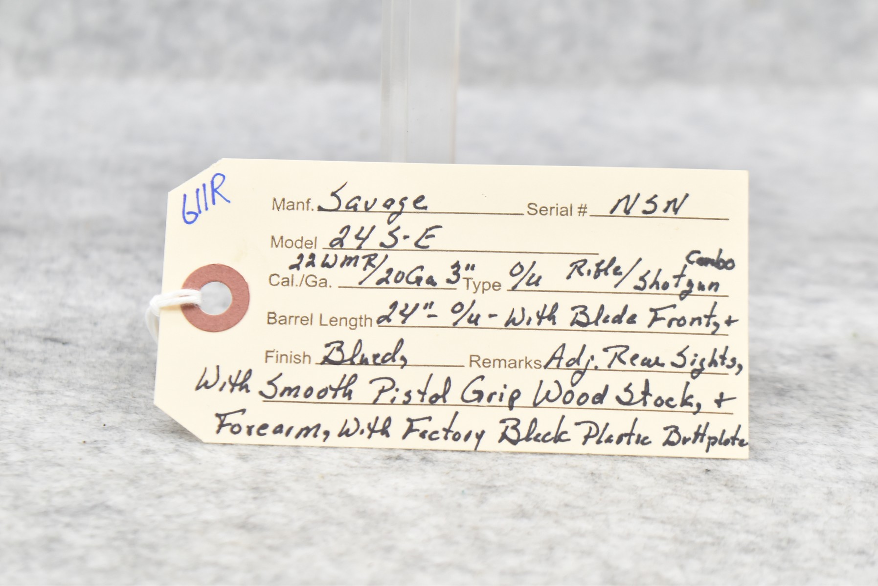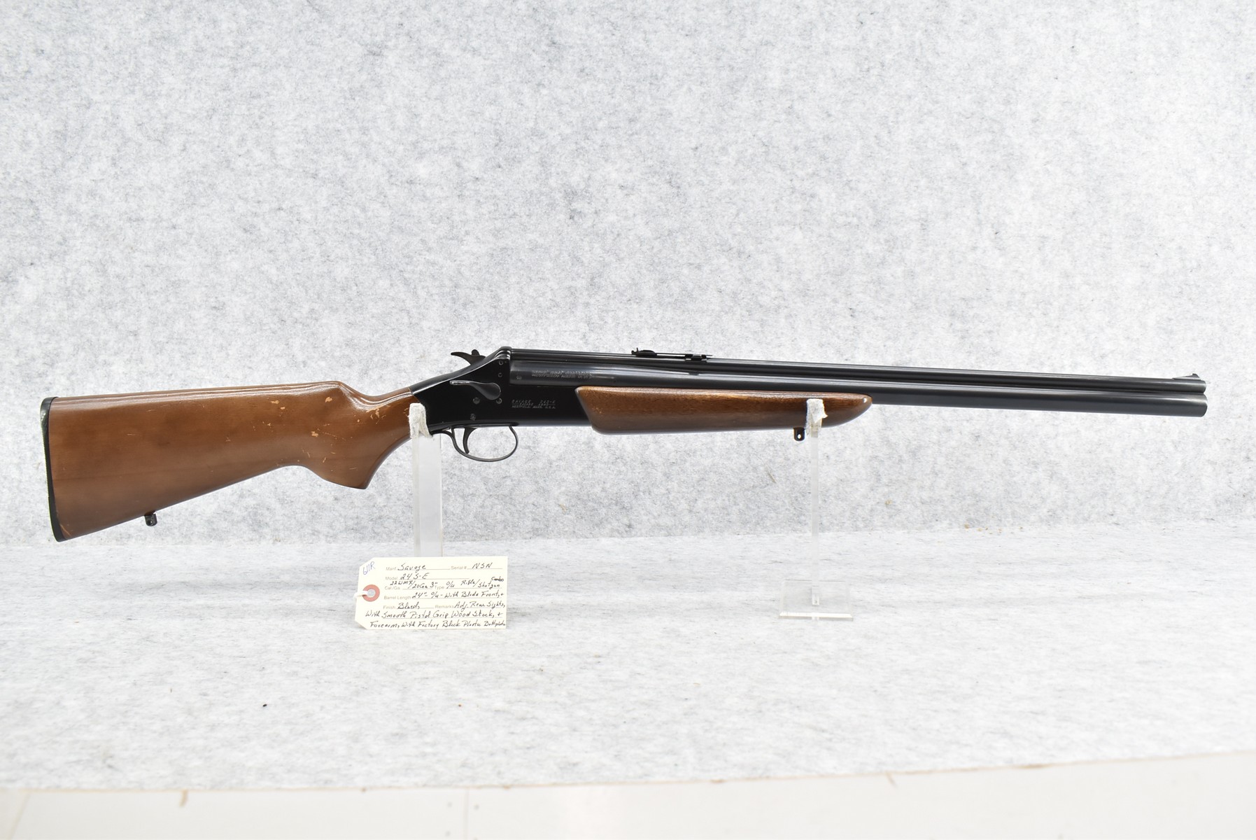 611R. Savage – Mod. 24S-E – 22 WMR/20ga. 3” Over-Under Rifle-Shotgun Combo – w/24” Barrel w/Blade Front & Adj. Rear Sights – Blued Finish – w/Smooth Pistol Grip Wood Stocks w/Factory Butt Plate