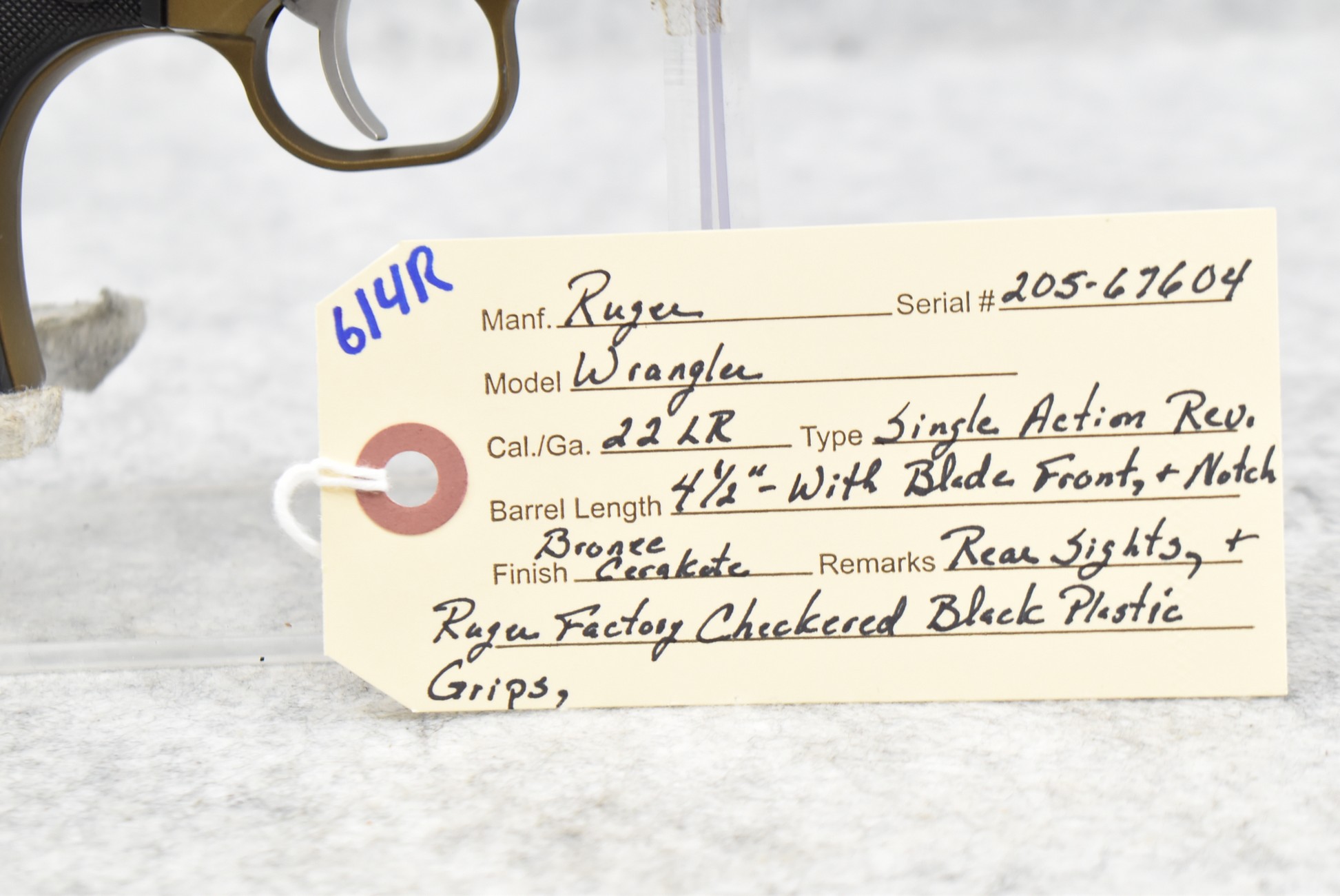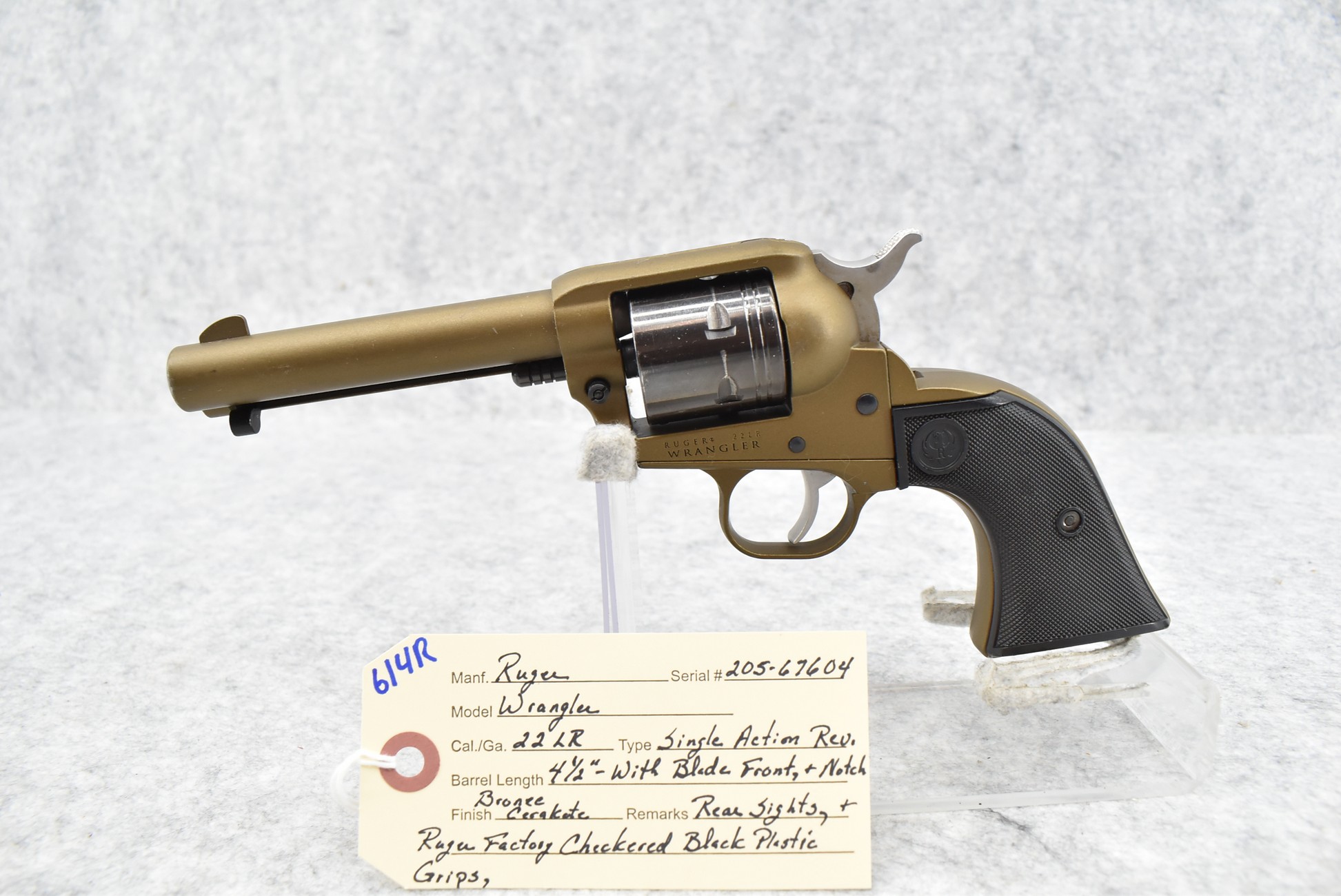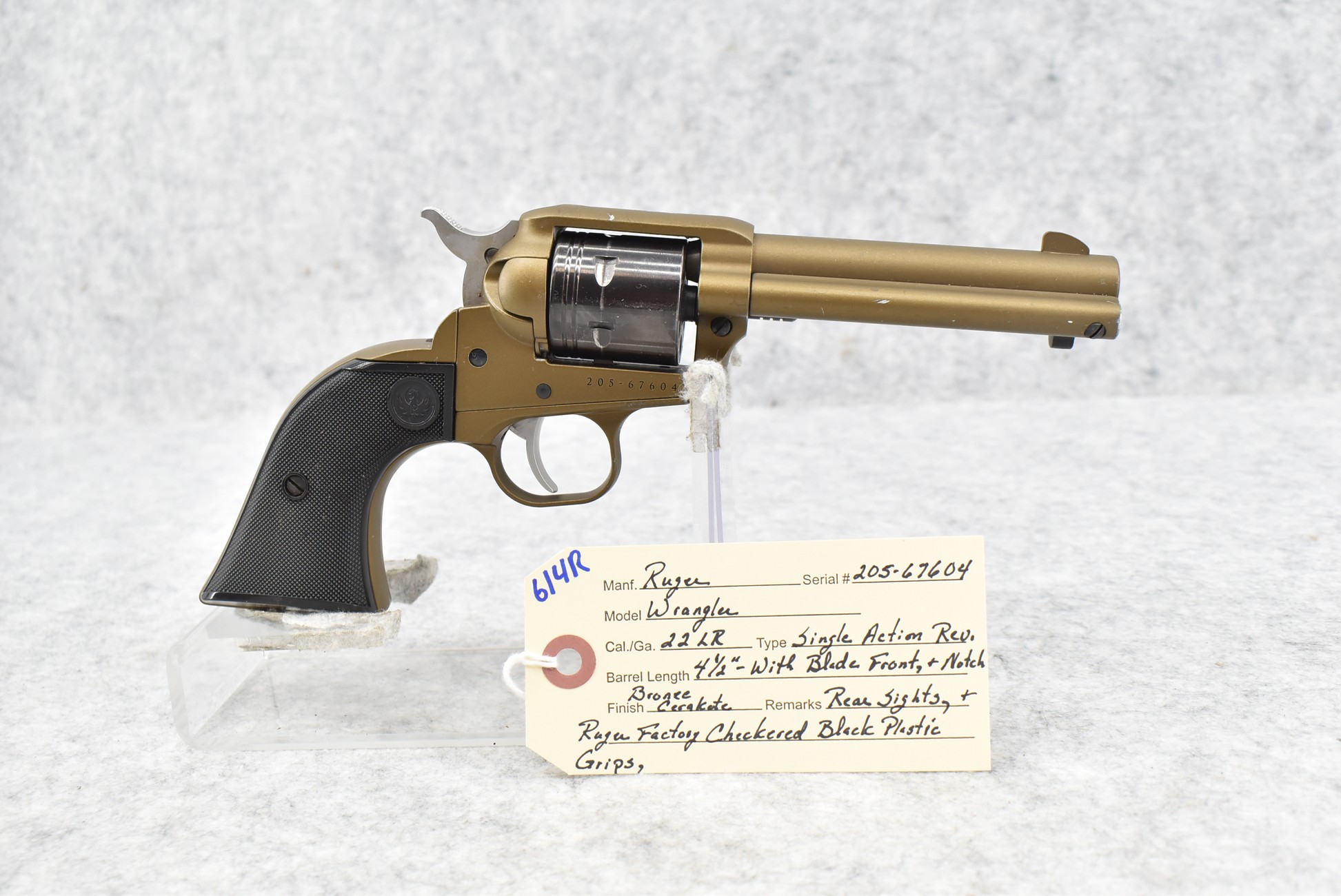 614R. Ruger – Mod. Wrangler – 22LR Cal. Single Action Revolver – w/4 ½” Barrel w/Blade Front & Notch Rear Sights – Bronze Cerakote Finish – w/Ruger Factory Checkered Black Plastic Grips