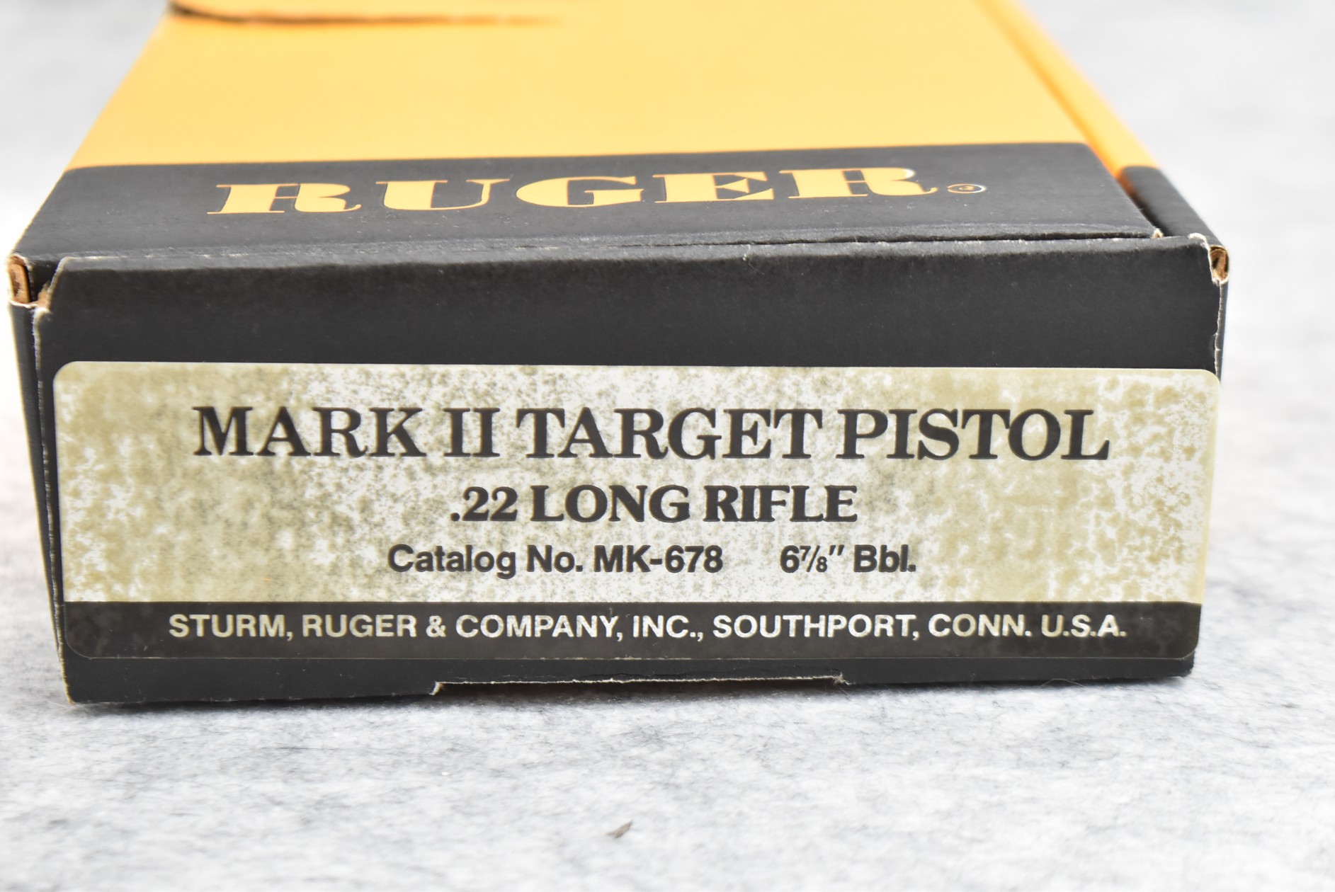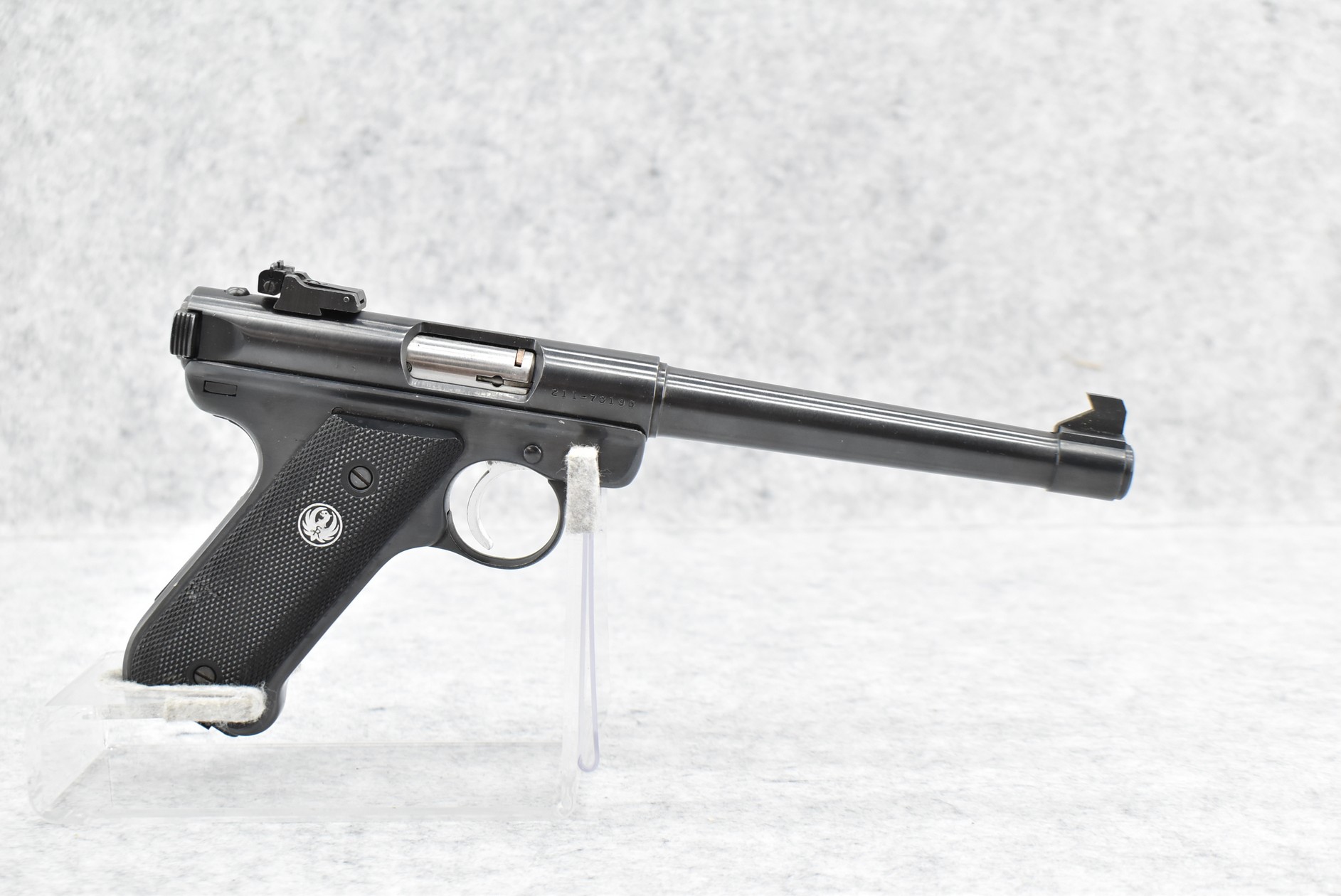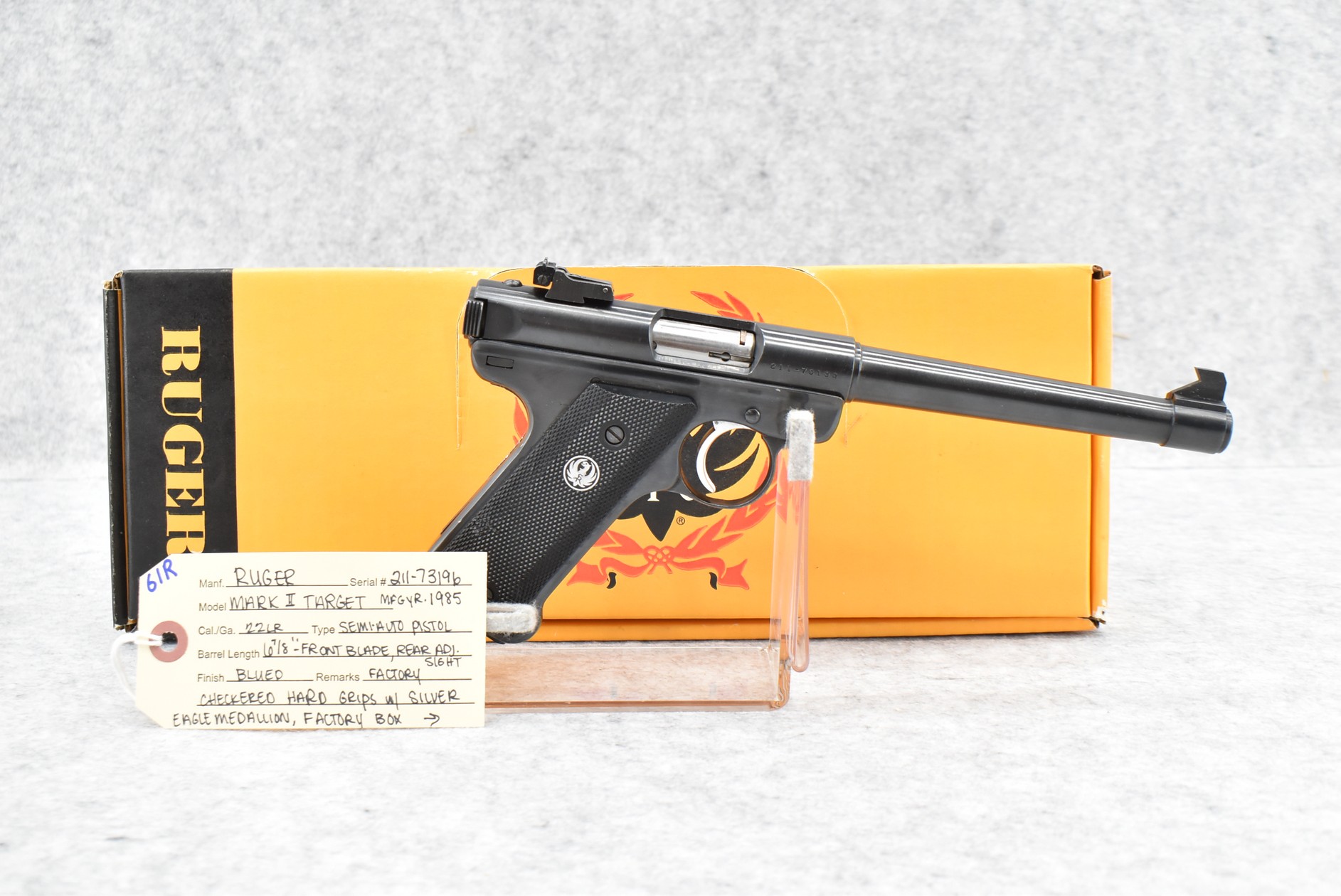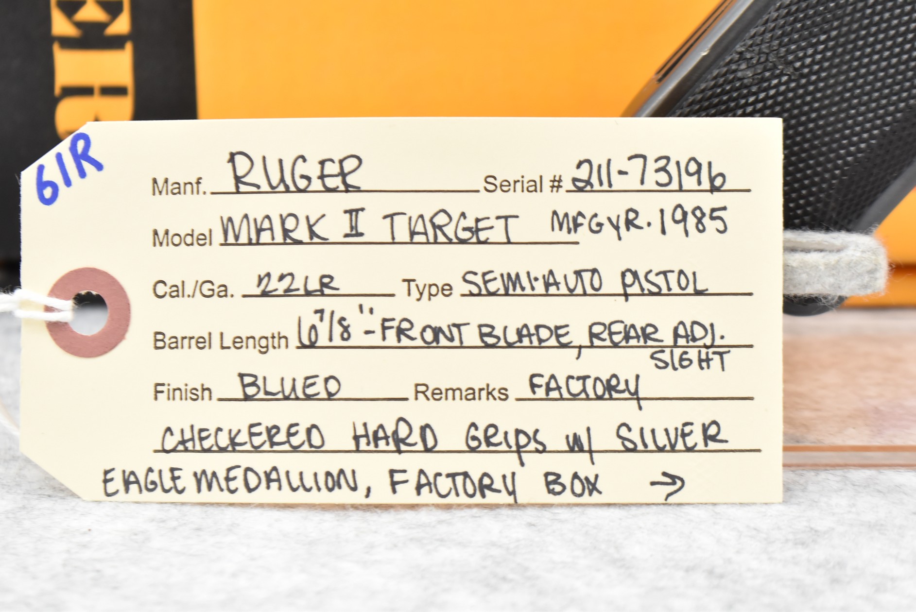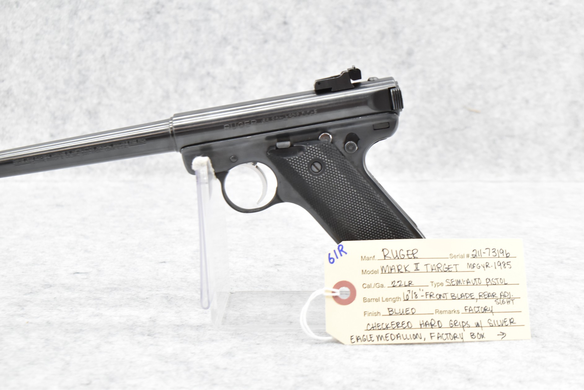 61R. Ruger – Mod. Mark II Target – 22LR Cal. Semi-Auto Pistol – w/6 7/8” Barrel w/Front Blade & Rear Adj. Sights – Blued Finish – w/Factory Checkered Hard Grips w/Silver Eagle Medallion – w/Factory Box, 2 Mags & Manual – Mfg. 1985