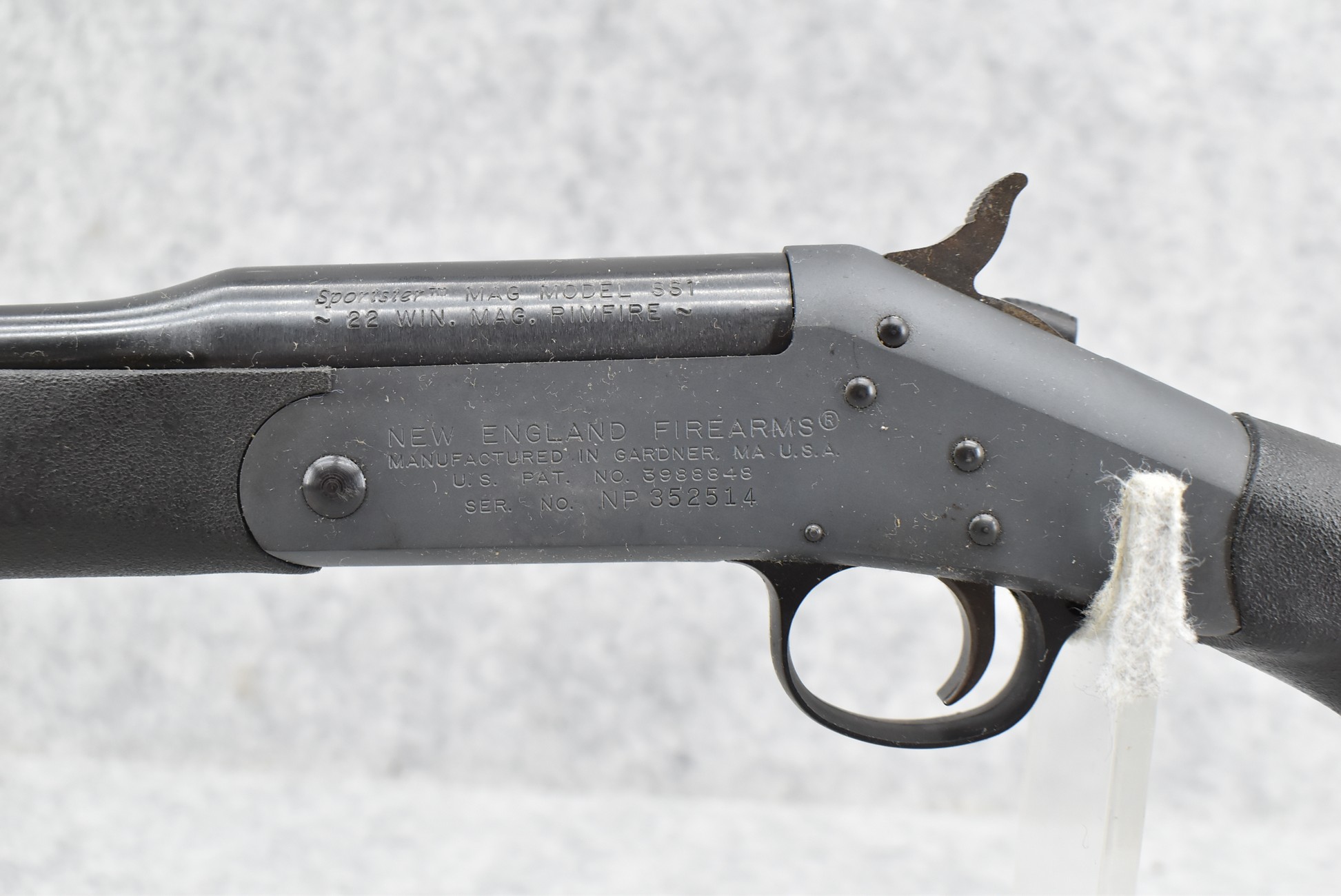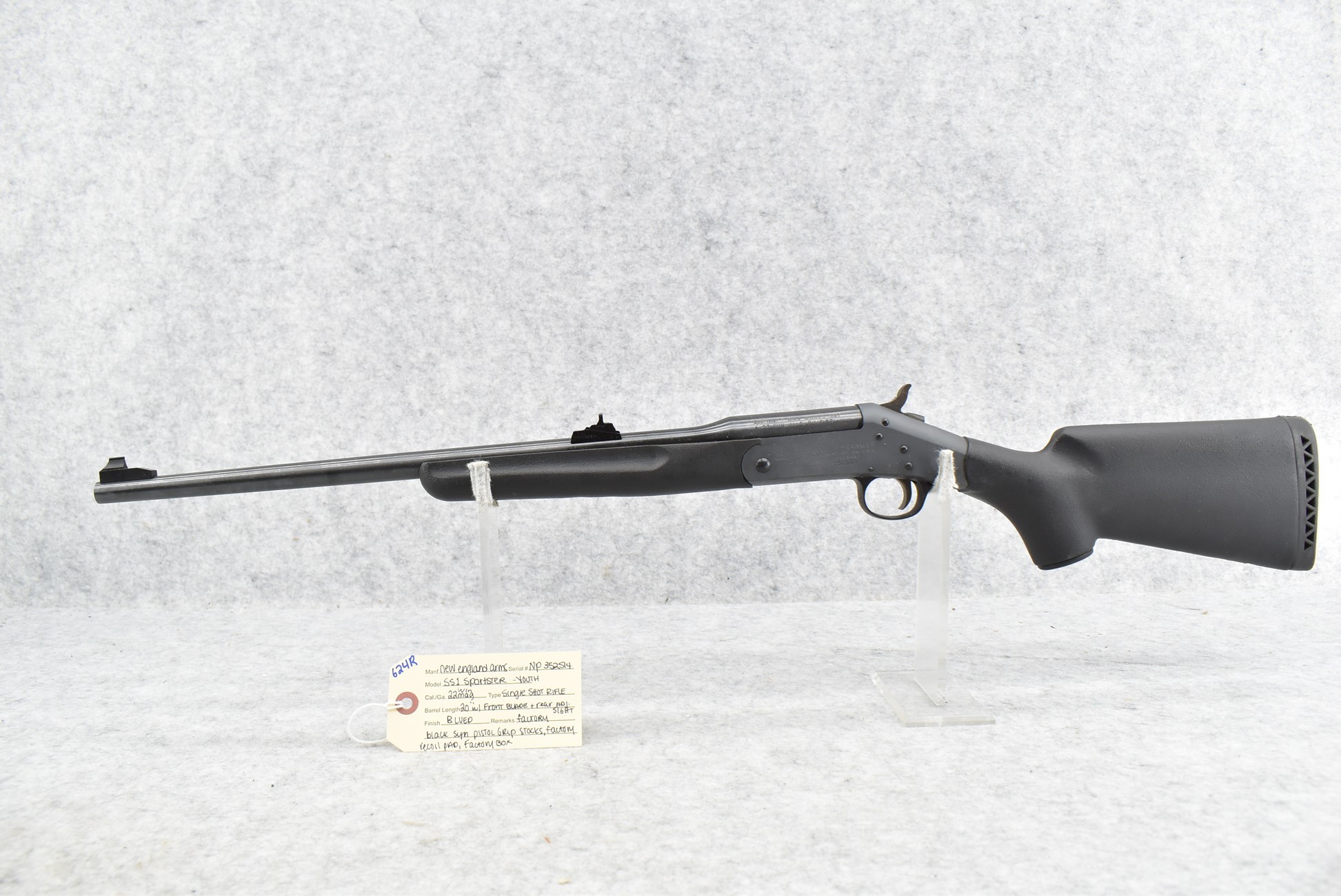 624R.     New England Arms -Mod. SS1 Sportster Youth – 22 Win. Mag Cal. Single Shot Rifle – w/20” Barrel w/Front Blade & Rear Adj. Sights – Blued Finish – w/Factory Black Synthetic Pistol Grip Stocks w/Factory Recoil Pad – w/Factory Box