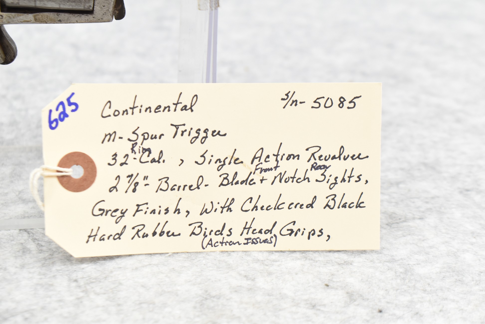 625. Continental – Mod. Spur Trigger – 32 Rim Cal. Single Action Revolver – w/2 7/8” Barrel w/Blade Front and Rear Notch Sights – Grey Finish – w/Checkered Black Hard Rubber Birds Head Grips – Gun has Action Issues