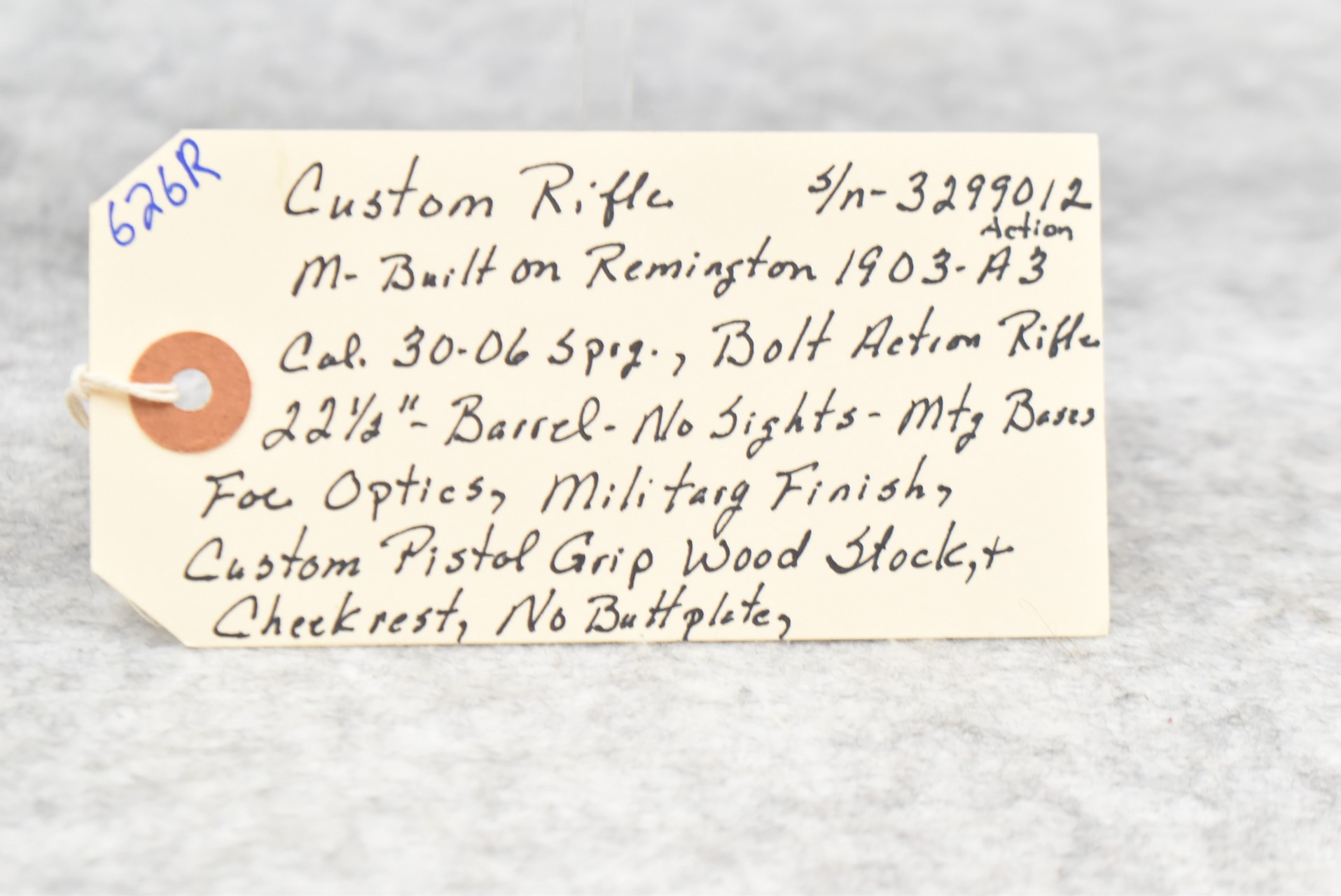 626R. Custom Rifle – Built on Remington Mod. 1903-A3 Action – 30-06 Cal. Bolt Action Rifle – w/22 ½” Barrel (No Sights) – Military Finish – w/Custom Pistol Grip Wood Stock w/Cheek Piece, No Butt Plate – w/Mounting Bases for Optics