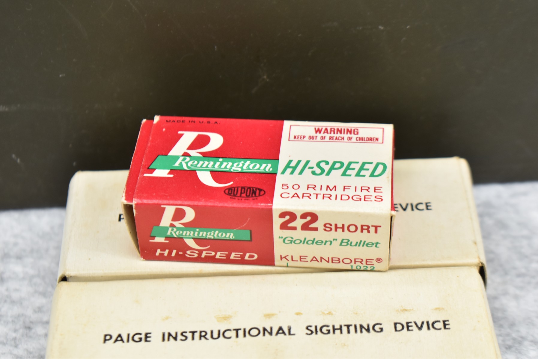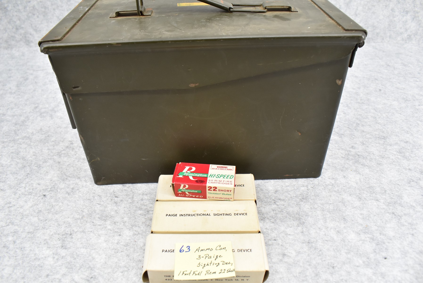 63. Lot Including Metal Ammo Can, 3 Paige Sighting Devices & 1 Remington 22 Short Factory Full Box of Ammo