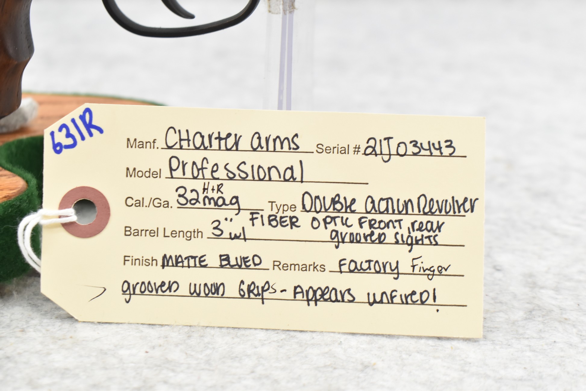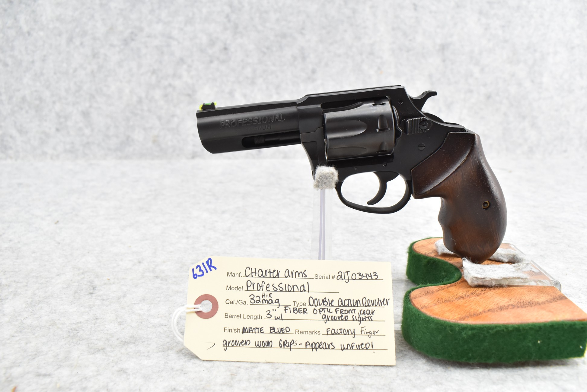 631R. Charter Arms – Mod. Professional – 32 H&R Mag. Cal. Double Action Revolver – w/3” Barrel w/Fiber Optic Front & Rear Grooved Sights – Matte Blued Finish – w/Factory Finger Grooved Wood Grips – Appears Unfired!
