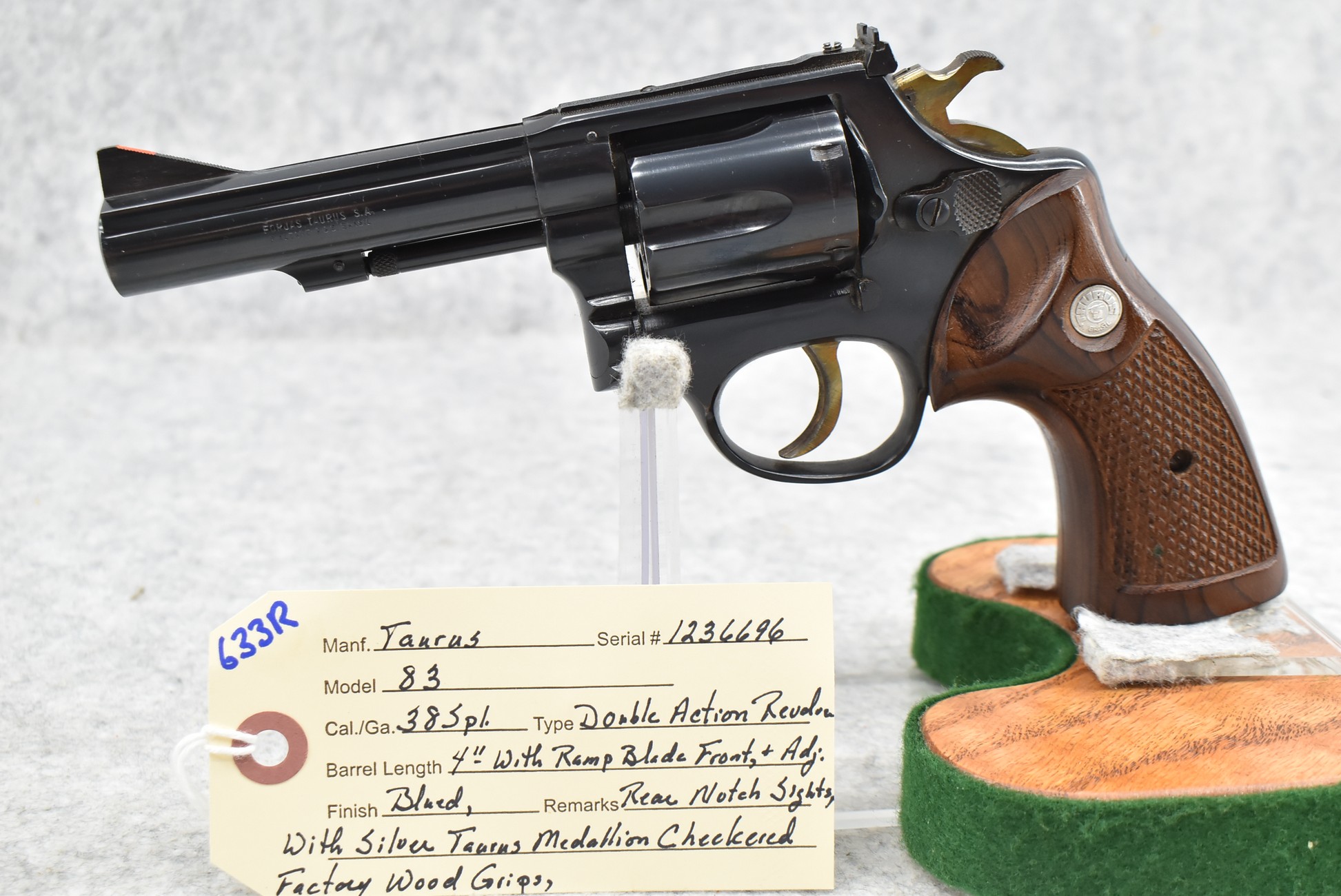 633R. Taurus – Mod. 83 – 38 Spl. Cal. Double Action Revolver – w/4” Barrel w/Ramp Blade Front & Adj. Rear Notch Sights – Blued Finish – w/Silver Taurus Medallion Checkered Factory Wood Grips