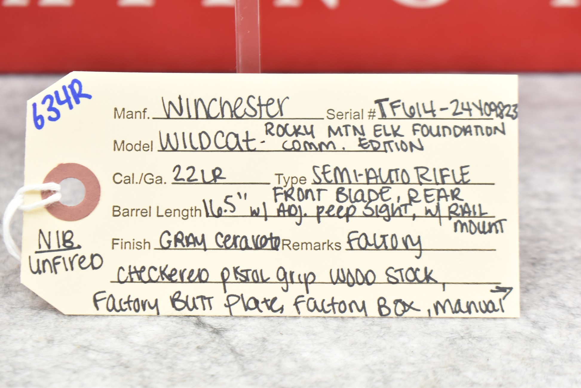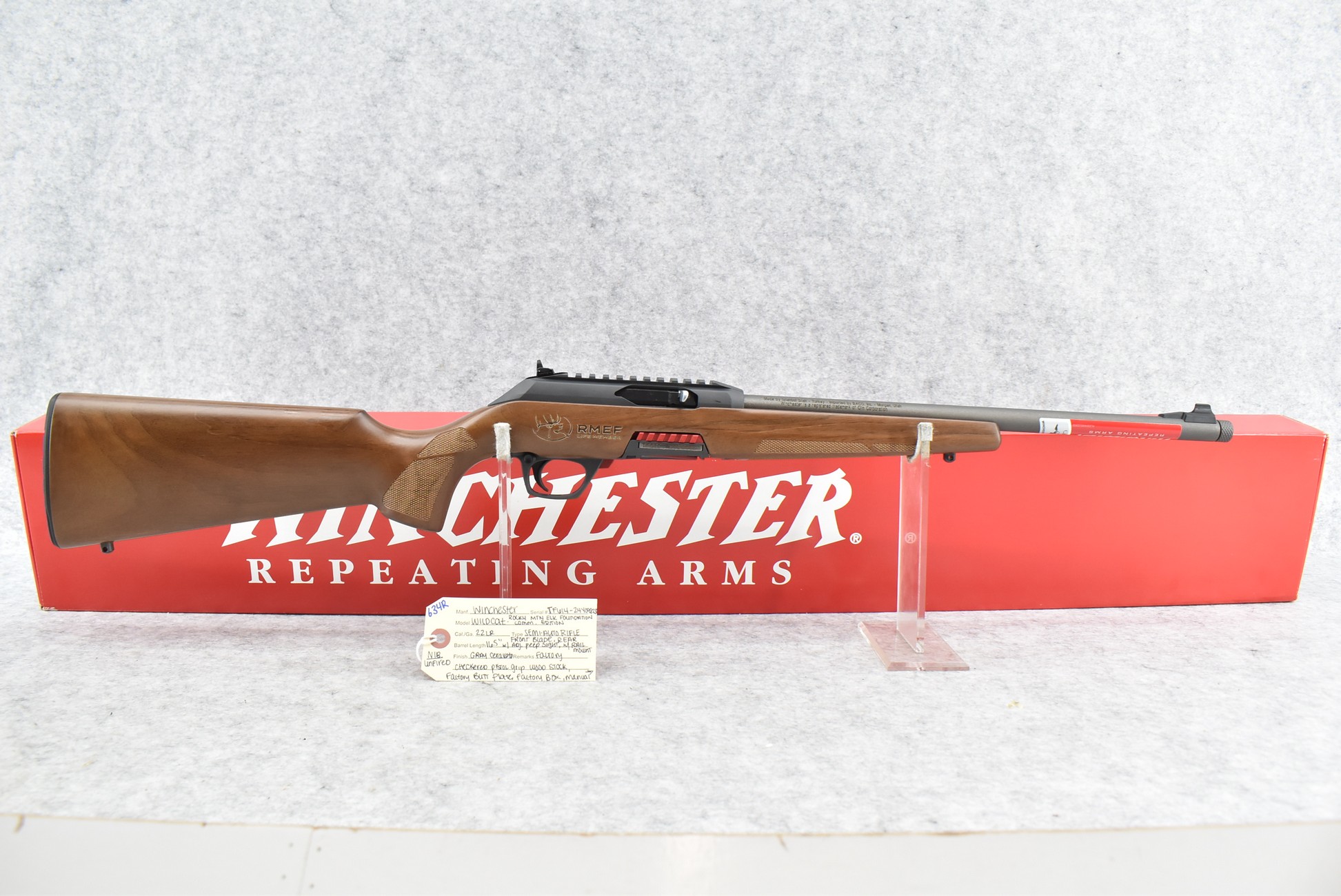 634R. Winchester – Mod. Wildcat (Rocky Mountain Elk Foundation Commemorative Edition) – 22LR Cal. Semi-Auto Rifle – w/16½” Barrel w/Blade Front and Adjustable Rear Peep Sight and Rail Mount – Gray Cerakote Finish – w/Factory Checkered Pistol Grip Wood Stock w/Factory Butt Plate – New in Factory Box w/Manual and Detachable Mag