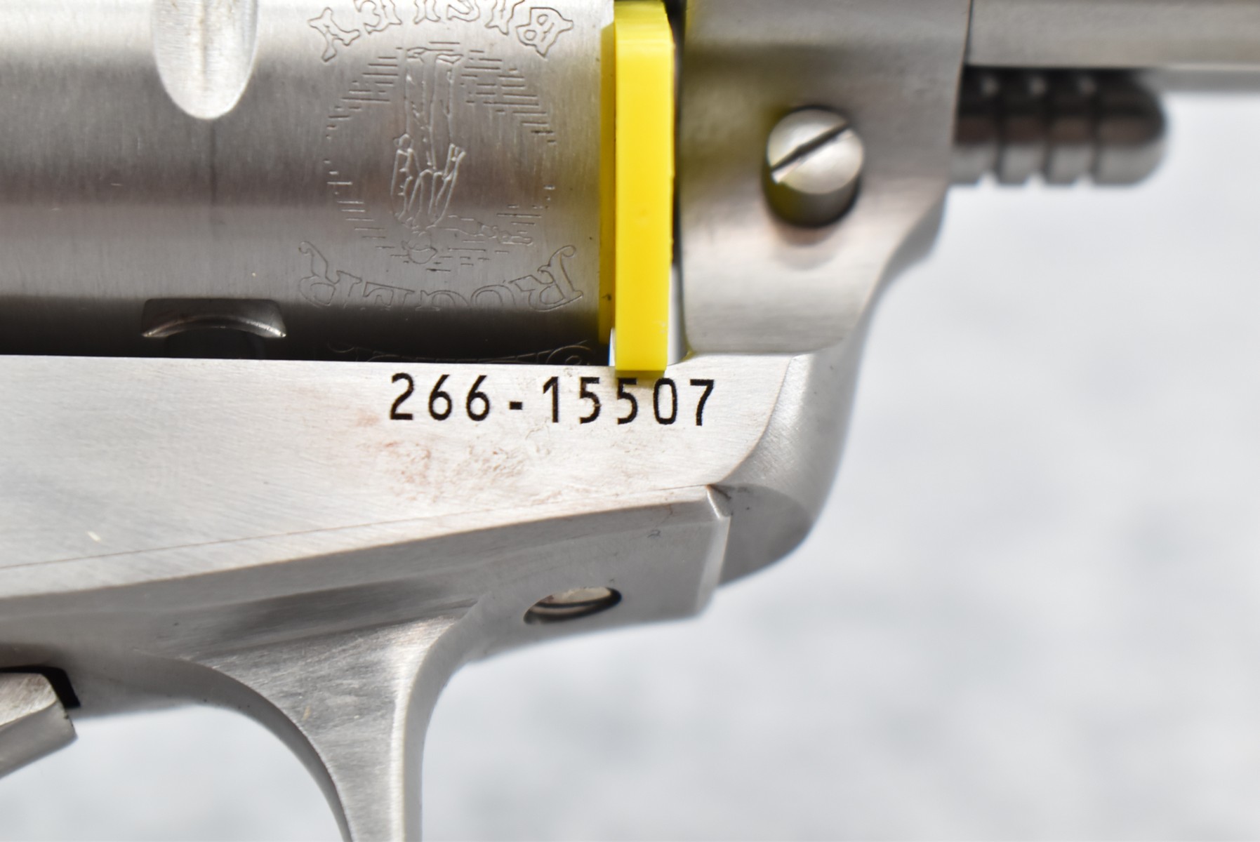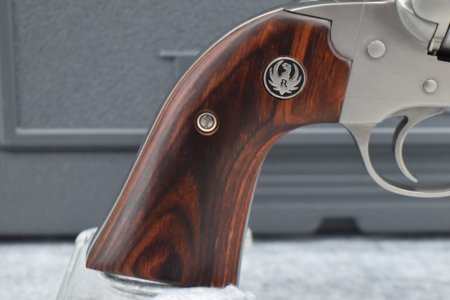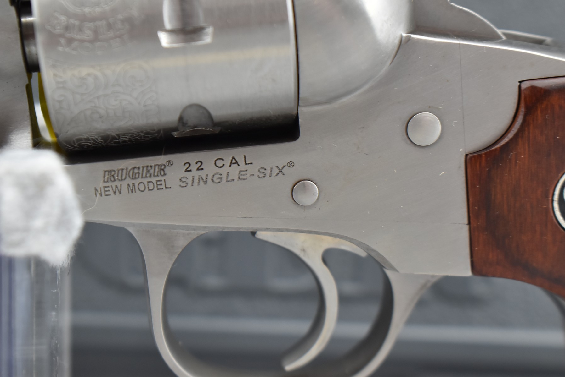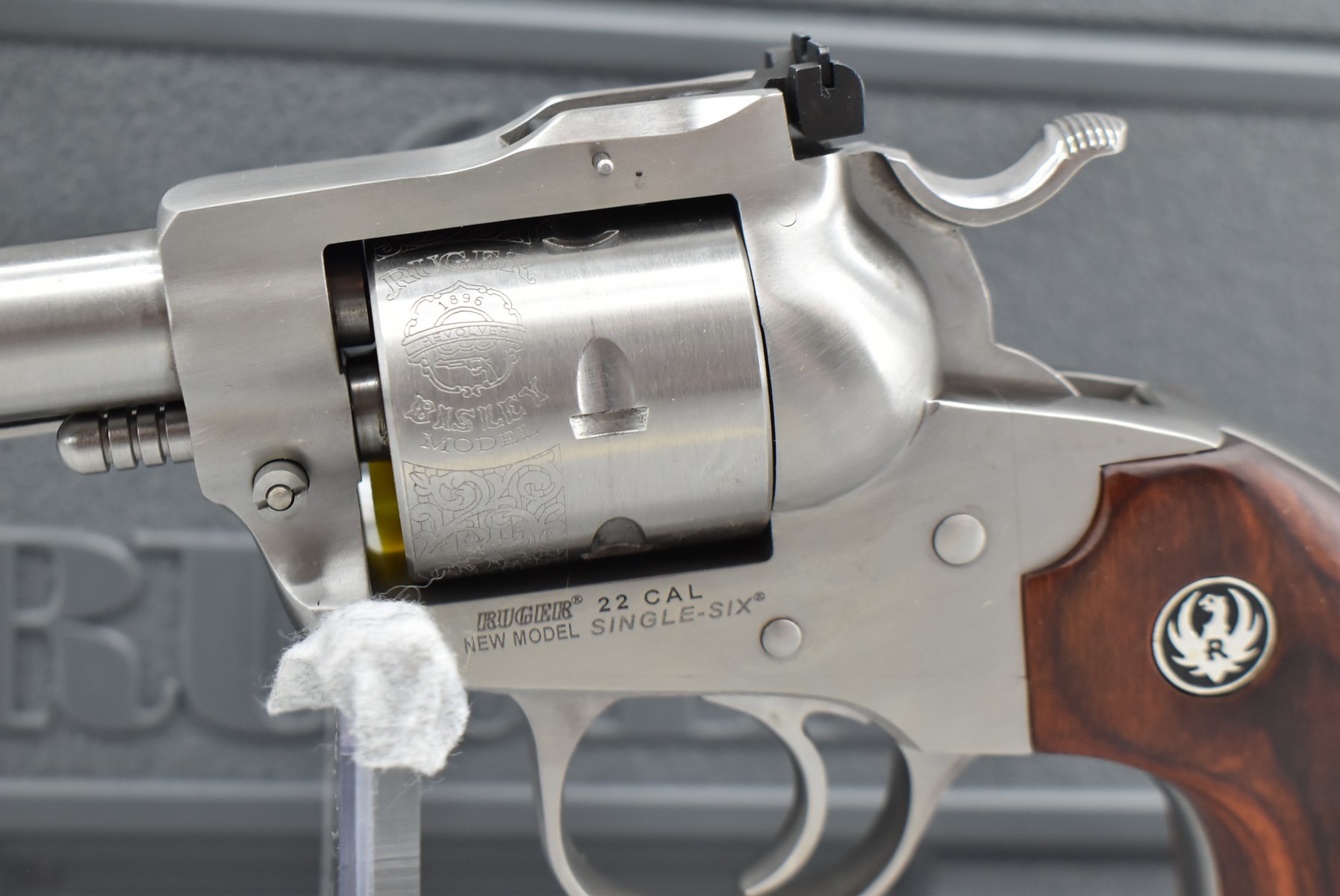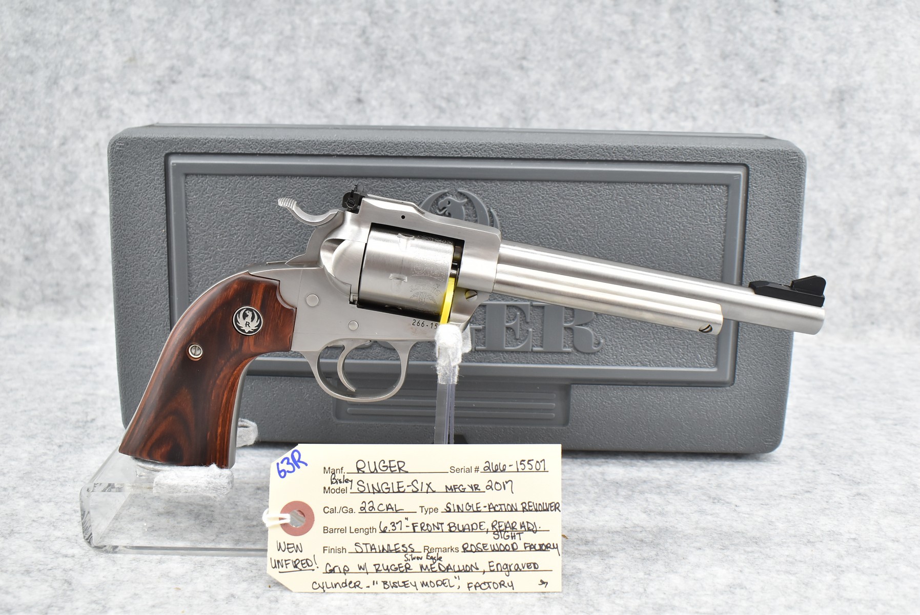63R.       Ruger – Mod. Bisley Single Six – 22 Cal. Single Action Revolver – w/6.37” Barrel w/Front Blade & Rear Adj. Sight – Stainless Finish – w/Engraved Cylinder – w/Rosewood Factory Grip – w/Ruger Silver Eagle Medallion – Mfg. 2017 – New & Unfired w/Factory Hard Case, Manual & Lock