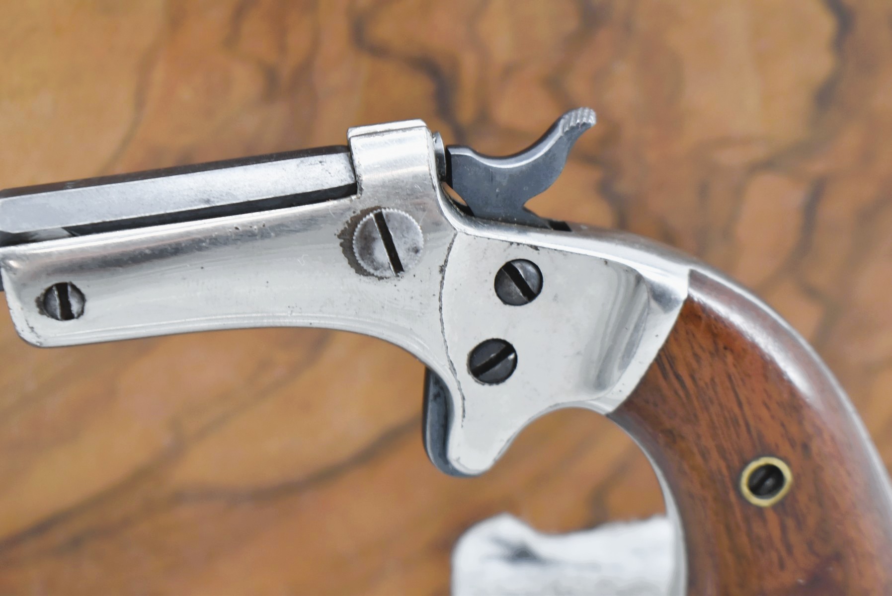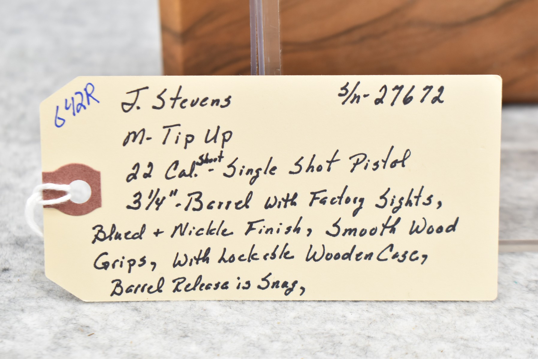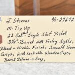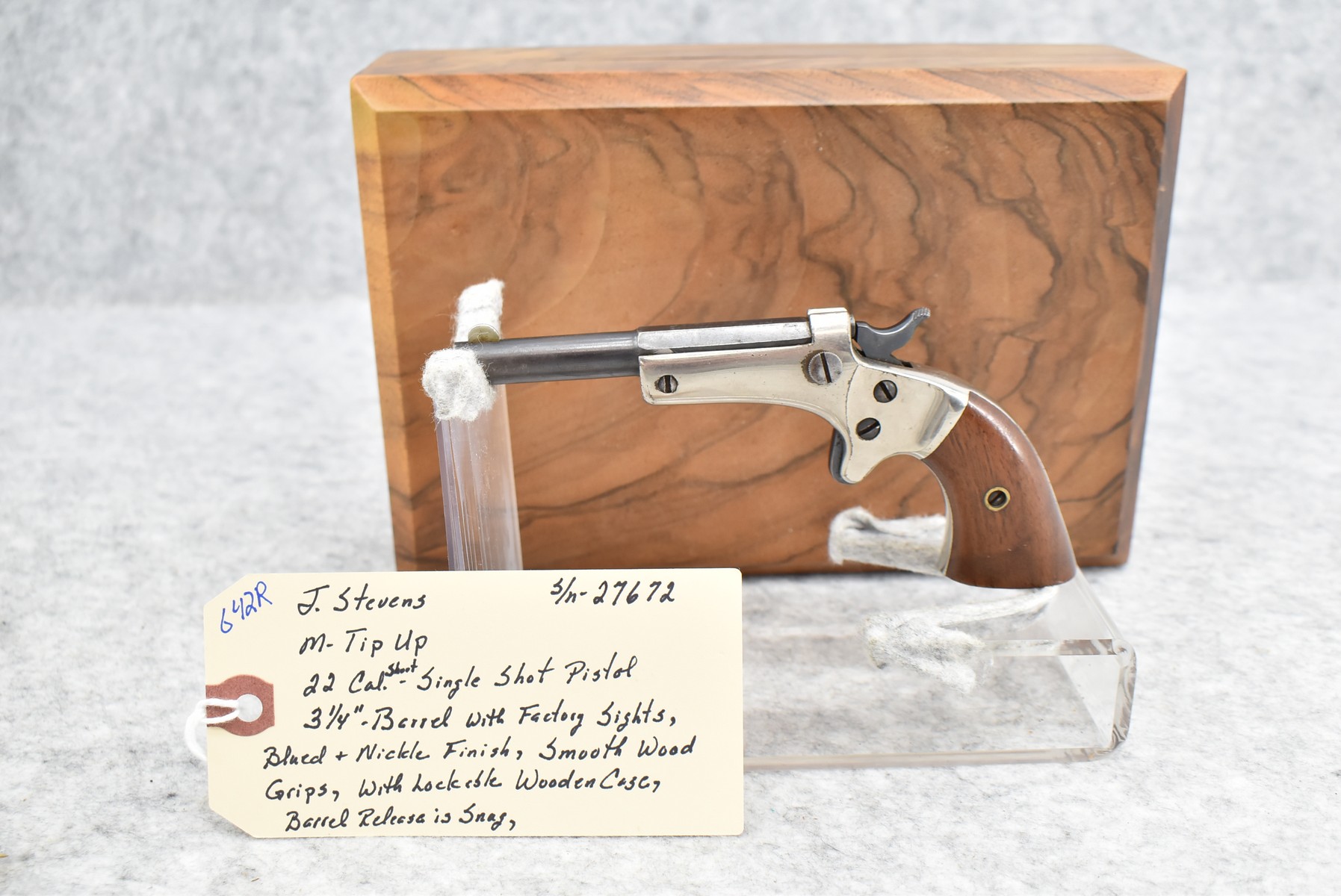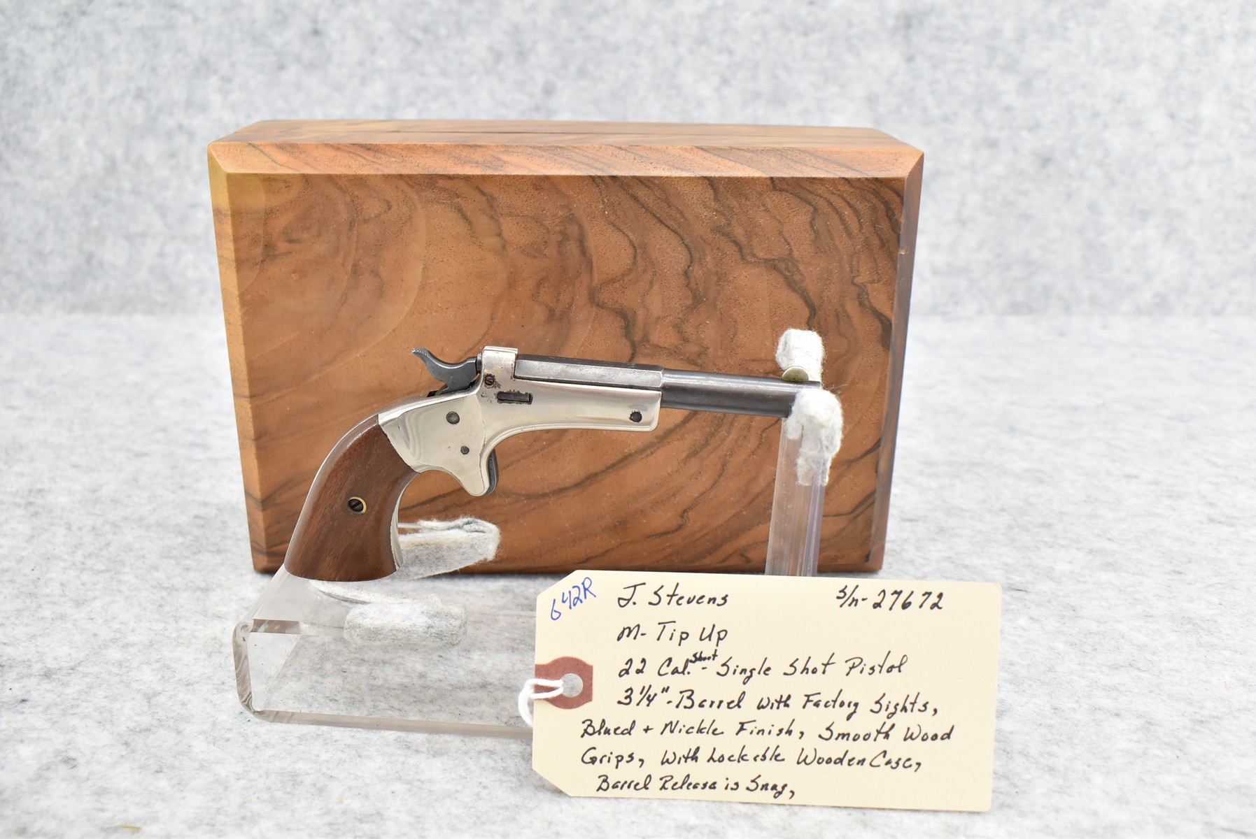 642R. J. Stevens – Mod. Tip UP – 22 Short Cal. Single Shot Pistol – w/3 ¼” Barrel w/Factory Sights – Blued/Nickel Finish – w/Smooth Wood Grips – w/Lockable Wooden Case – Note: Barrel Release is Snug (CANNOT GO TO MARYLAND!)
