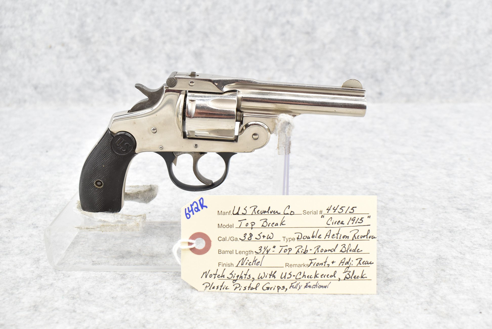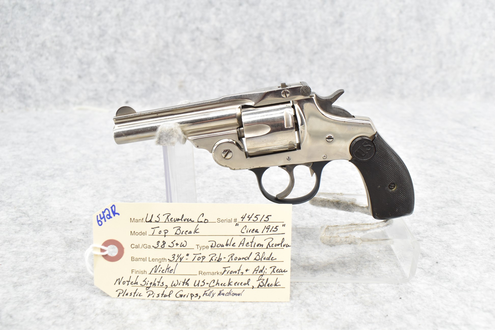 642R. U.S. Revolver Co. – Mod. Top Break – 38 S&W Cal. Double Action Revolver – w/3¼” Tob Rib Barrel w/Round Blade Front and Adjustable Rear Notch Sights – Nickel Finish – w/U.S. Checkered Black Plastic Grips – Circa 1915 – Fully Functional