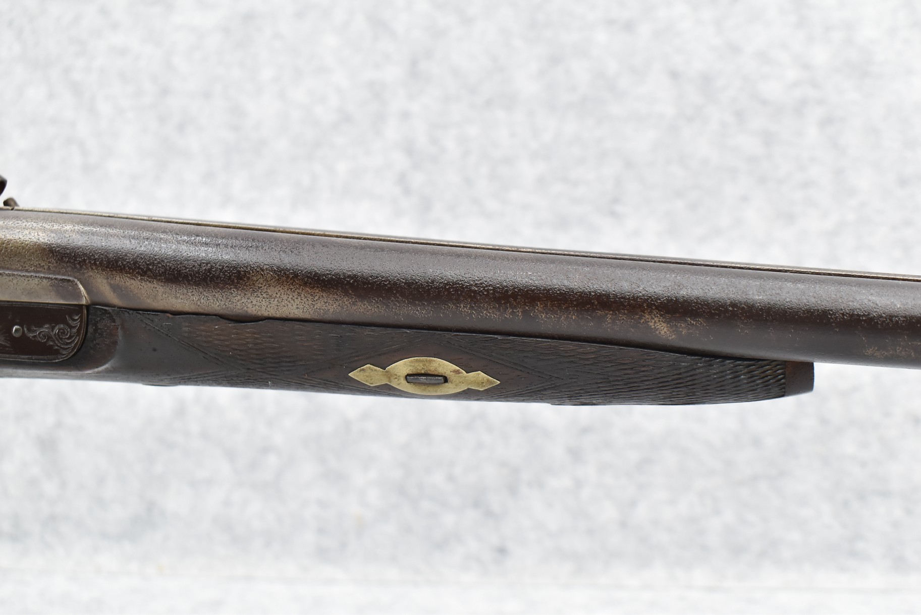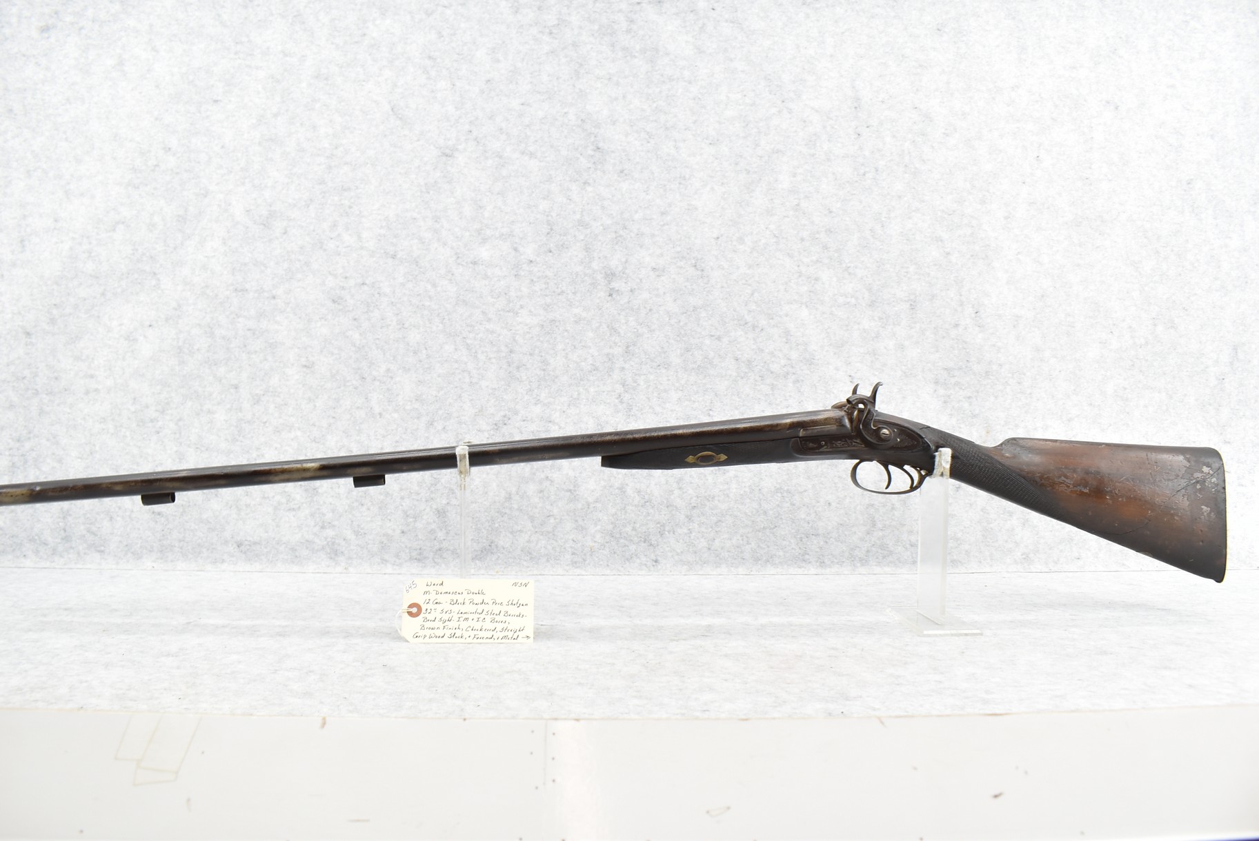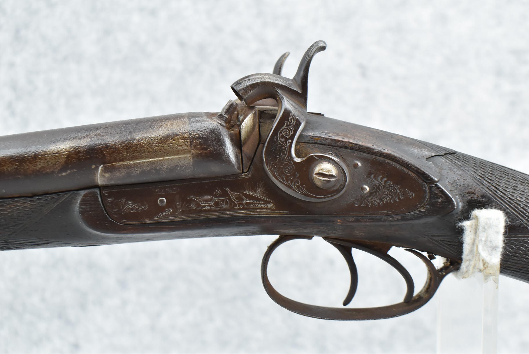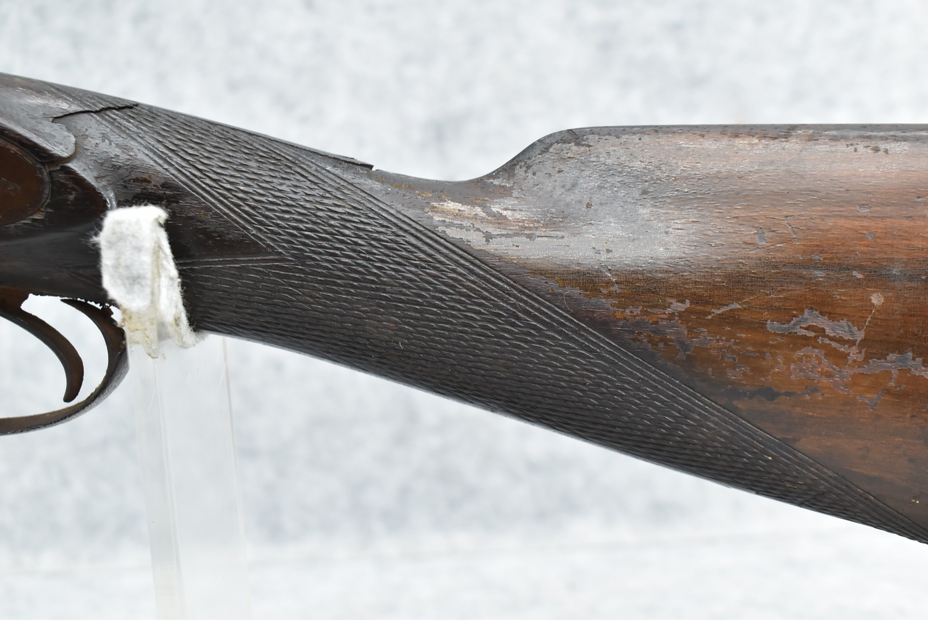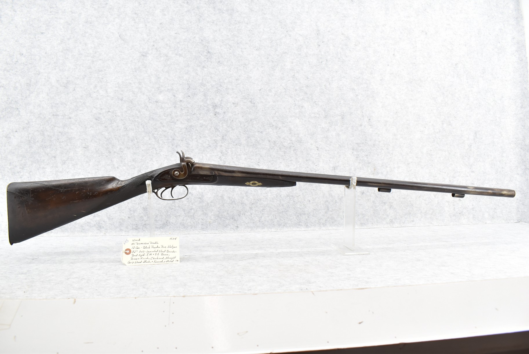 645. Ward – 12ga. Black Powder Percussion Double Barrel Shotgun – w/32” Side By Side Laminated Steel Barrels w/Bead Sight – Brown Finish – w/Checkered Straight Grip Wood Stock and Forend w/Metal Butt Plate – w/Engraved Side Plate w/Wild Fowl Scenes