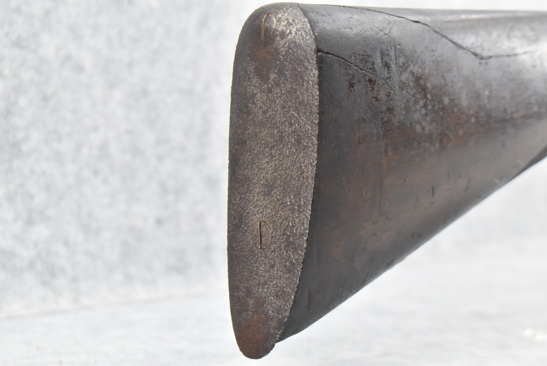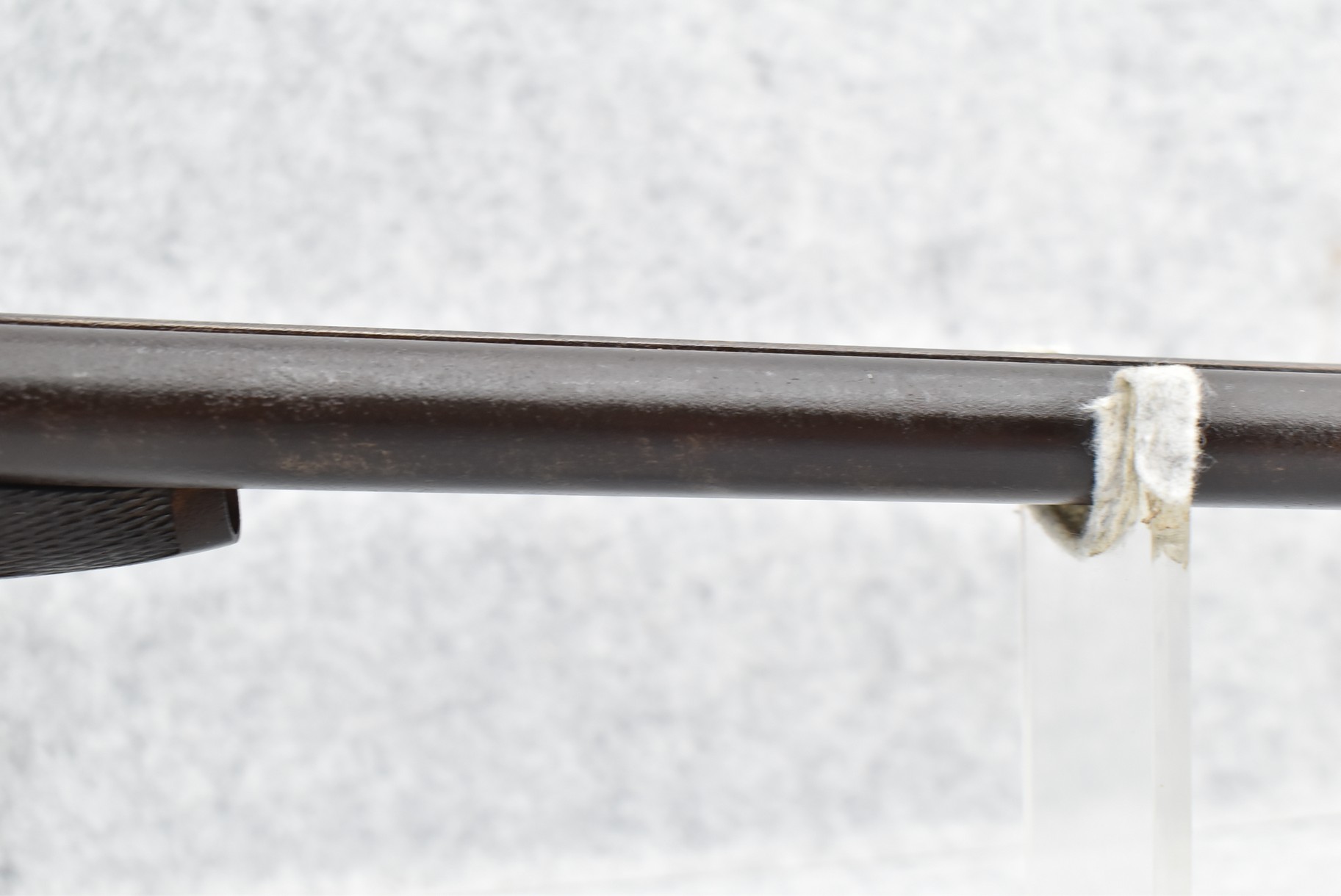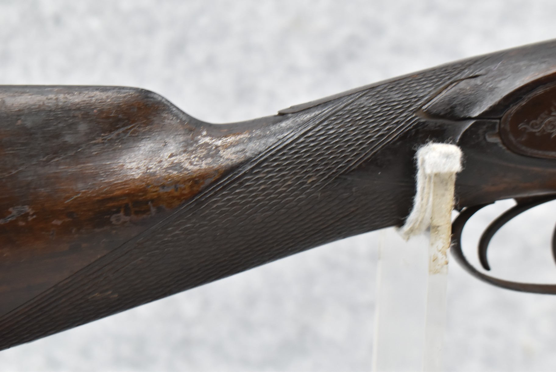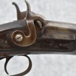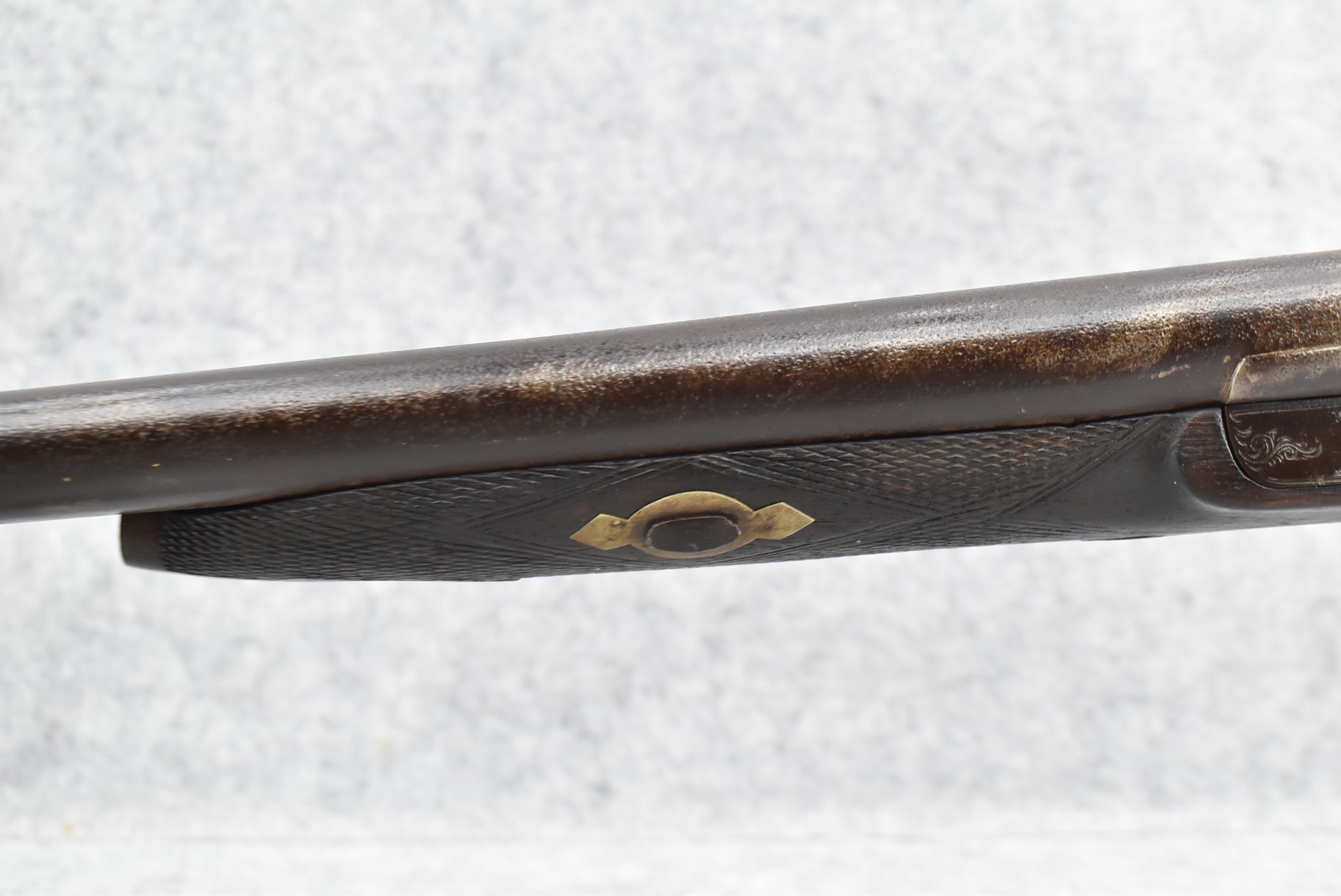 645. Ward – 12ga. Black Powder Percussion Double Barrel Shotgun – w/32” Side By Side Laminated Steel Barrels w/Bead Sight – Brown Finish – w/Checkered Straight Grip Wood Stock and Forend w/Metal Butt Plate – w/Engraved Side Plate w/Wild Fowl Scenes