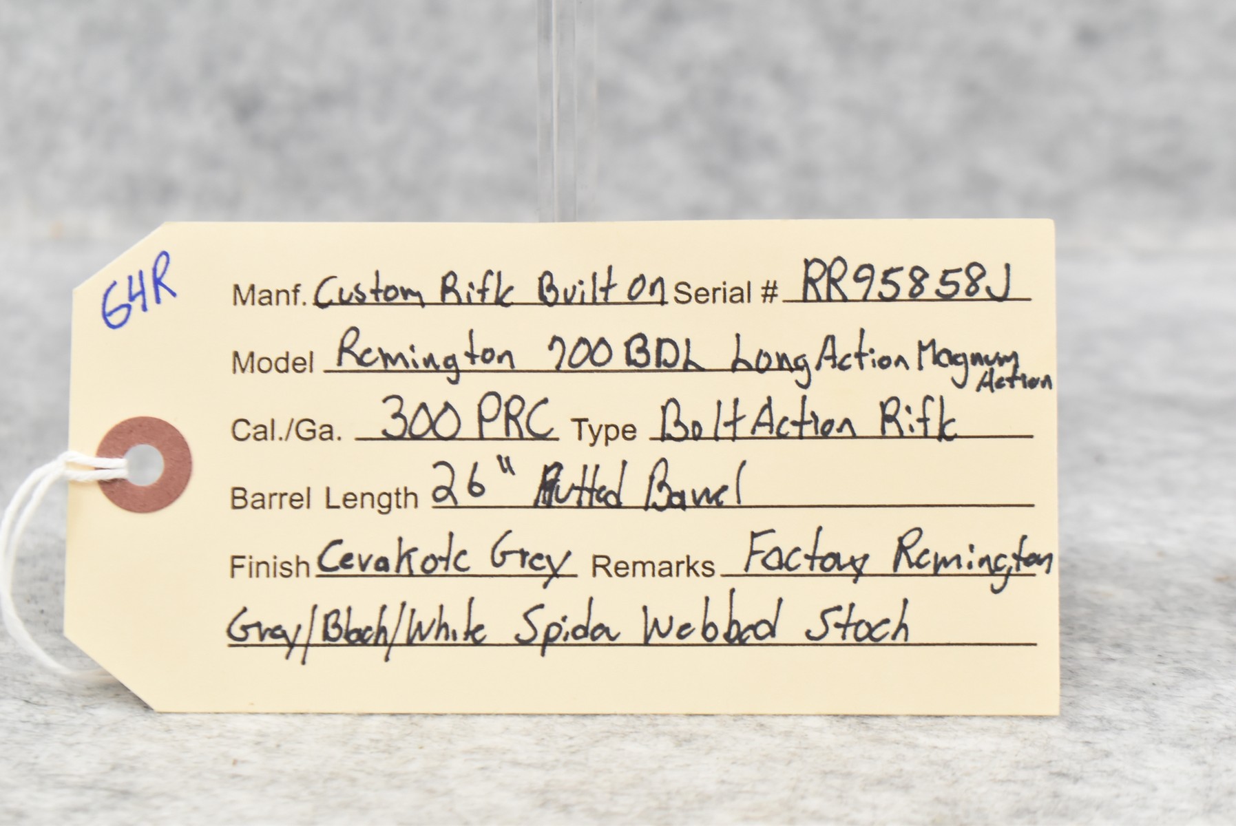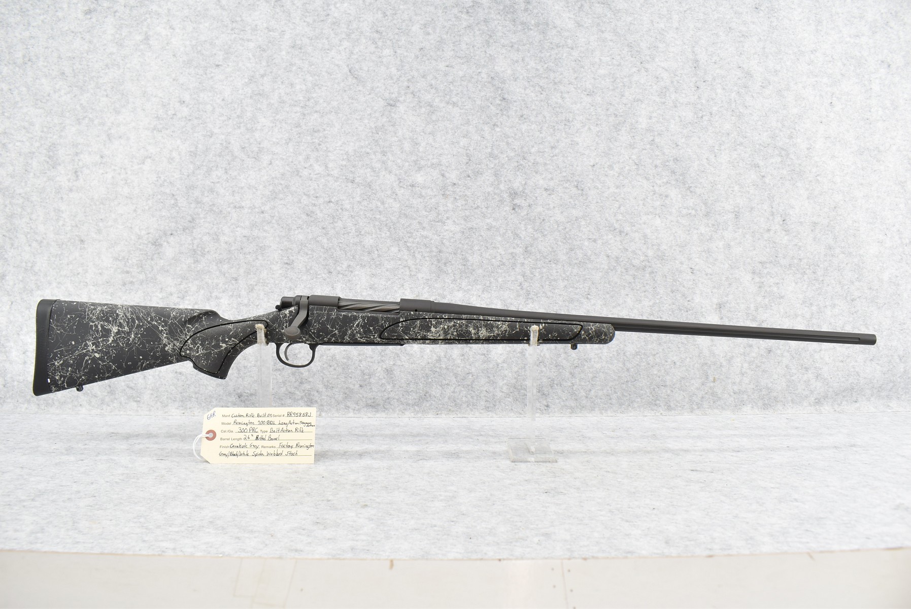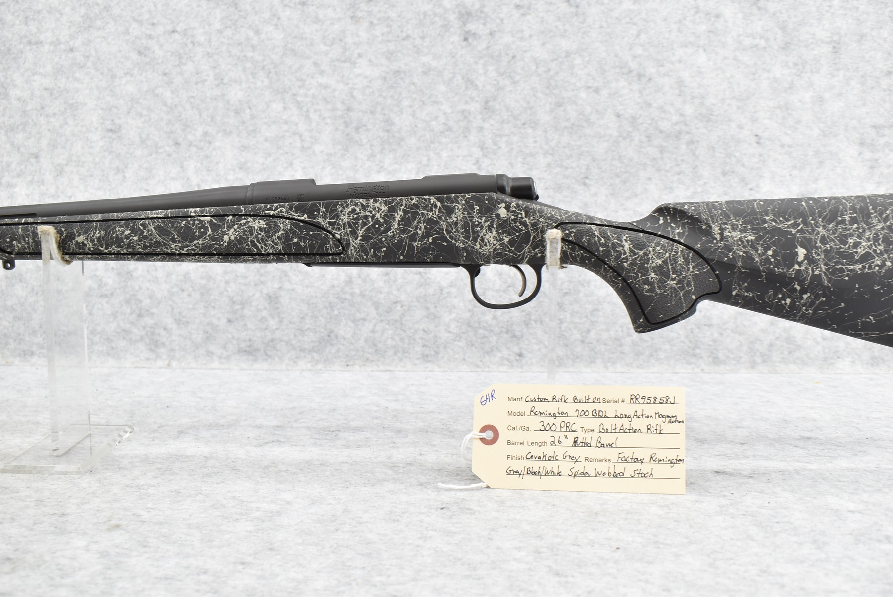 64R. Custom Rifle – Built On Remington 700 BDL Long Action Magnum Action – 300 PRC Cal. Bolt Action Rifle – w/26” Fluted Barrel – Cerakote Grey Finish – w/Factory Remington Grey, Black, and White Spider Webbed Stock – Appears Unfired