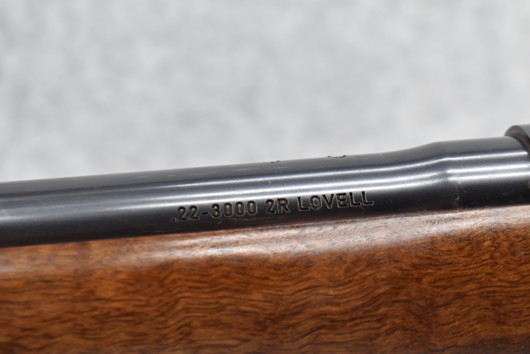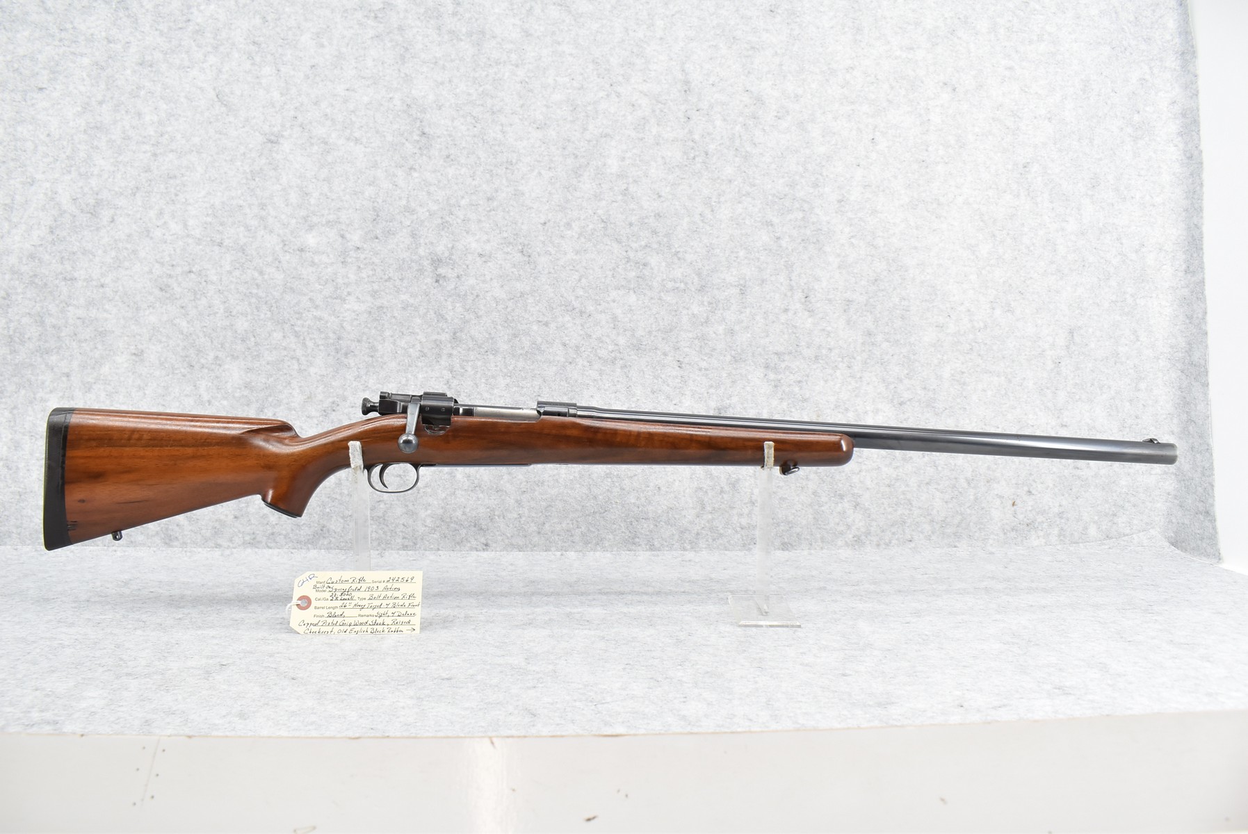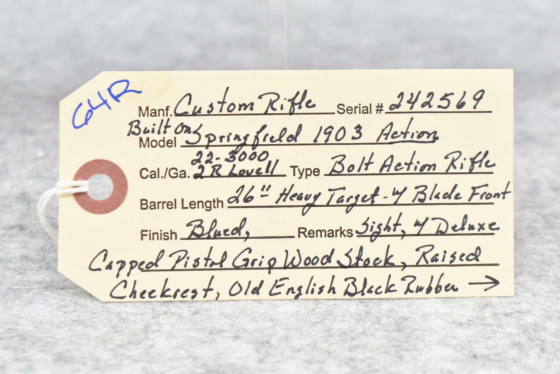 64R. Custom Rifle – Built on Springfield 1903 Action – 22-3000 Lovell Cal. Bolt Action Rifle – w/26” Heavy Target Barrel w/Blade Front Sight – Blued Finish – w/Deluxe Capped Pistol Grip Wood Stock w/Raised Cheek Piece w/Old English Black Rubber Butt Pad