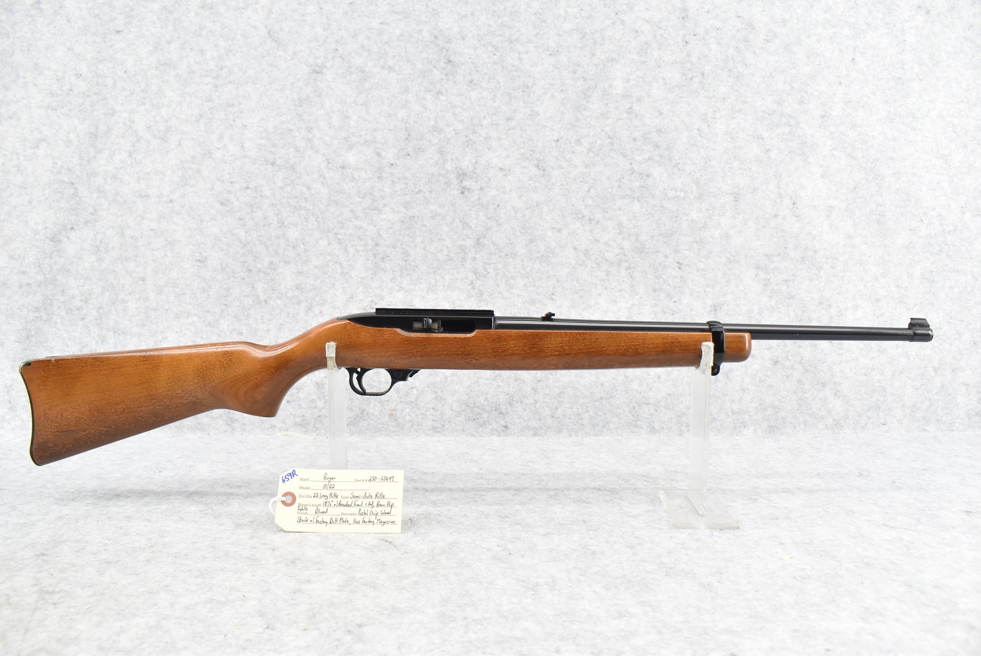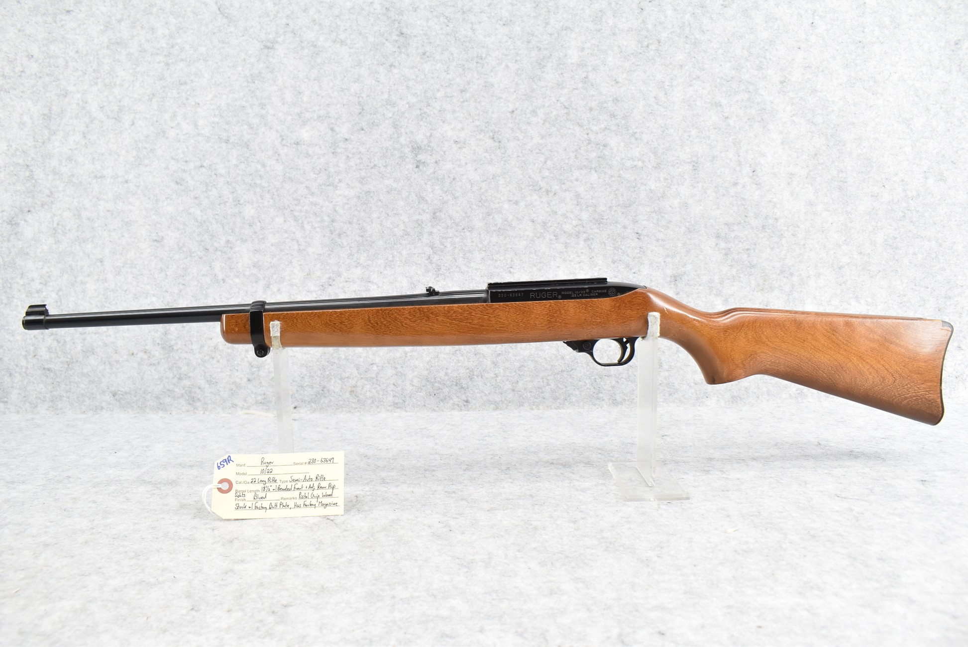 659R. Ruger – Mod. 10/22 – 22LR Cal. Semi-Auto Rifle – w/18½” Barrel w/Beaded Front and Flip Adjustable Rear Sights – Blued Finish – w/Pistol Grip Wood Stock w/Factory Butt Plate – w/Factory Magazine