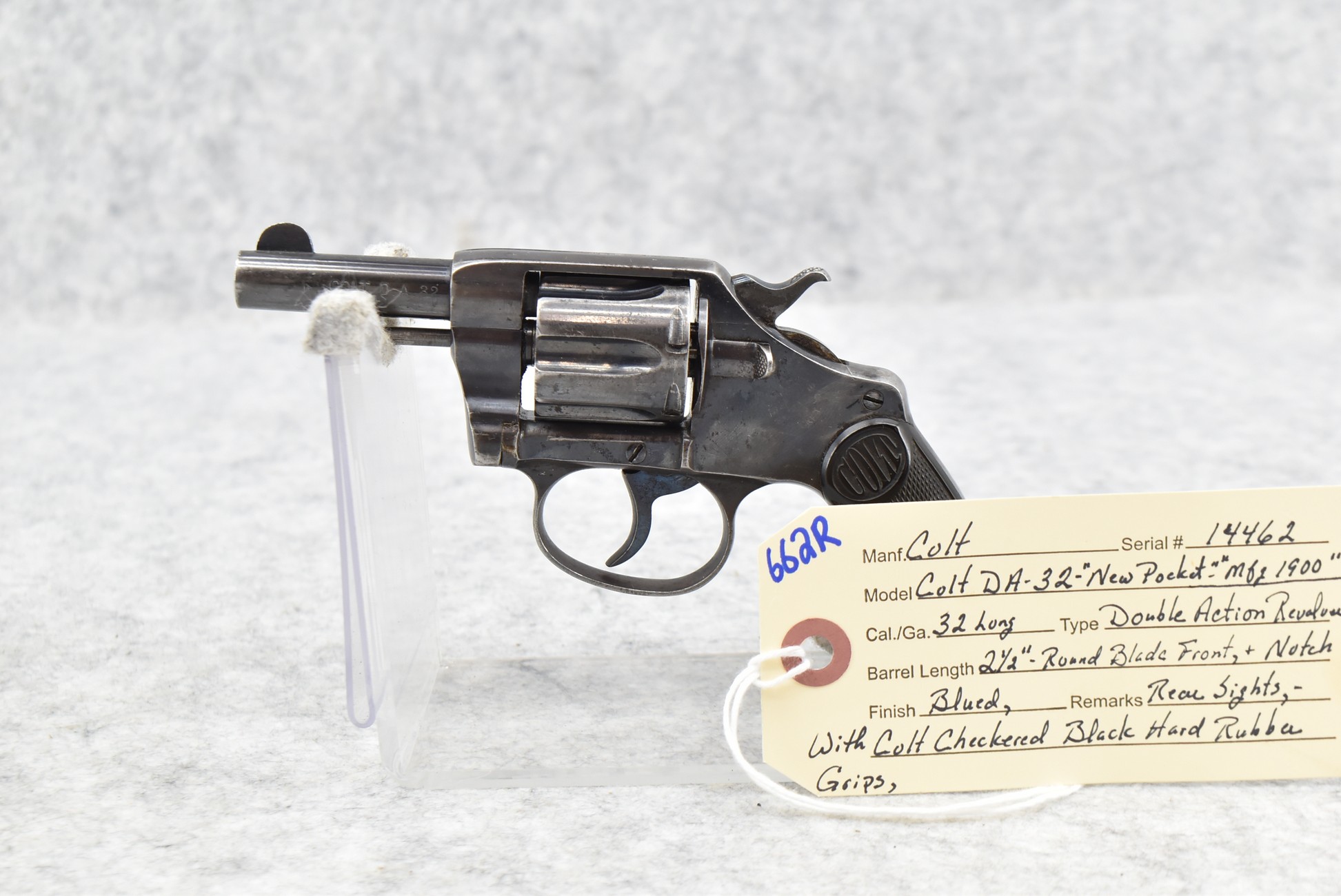 662R. Colt – Colt DA-32 “New Pocket” – 32 Long Cal. Double Action Revolver – w/2½” Barrel w/Round Blade Front and Rear Notch Sights – Blued Finish – w/Colt Checkered Black Hard Rubber Grips – Manufactured 1900