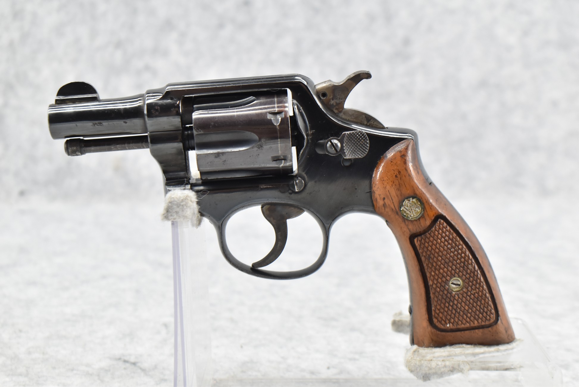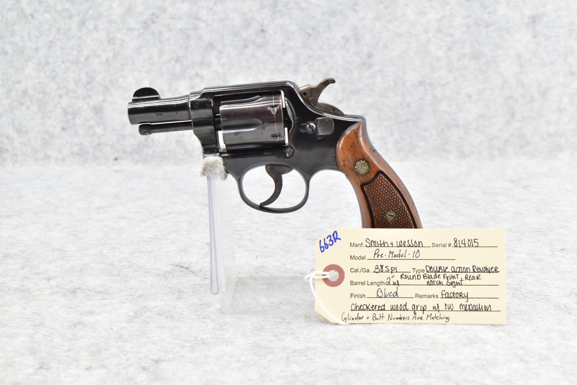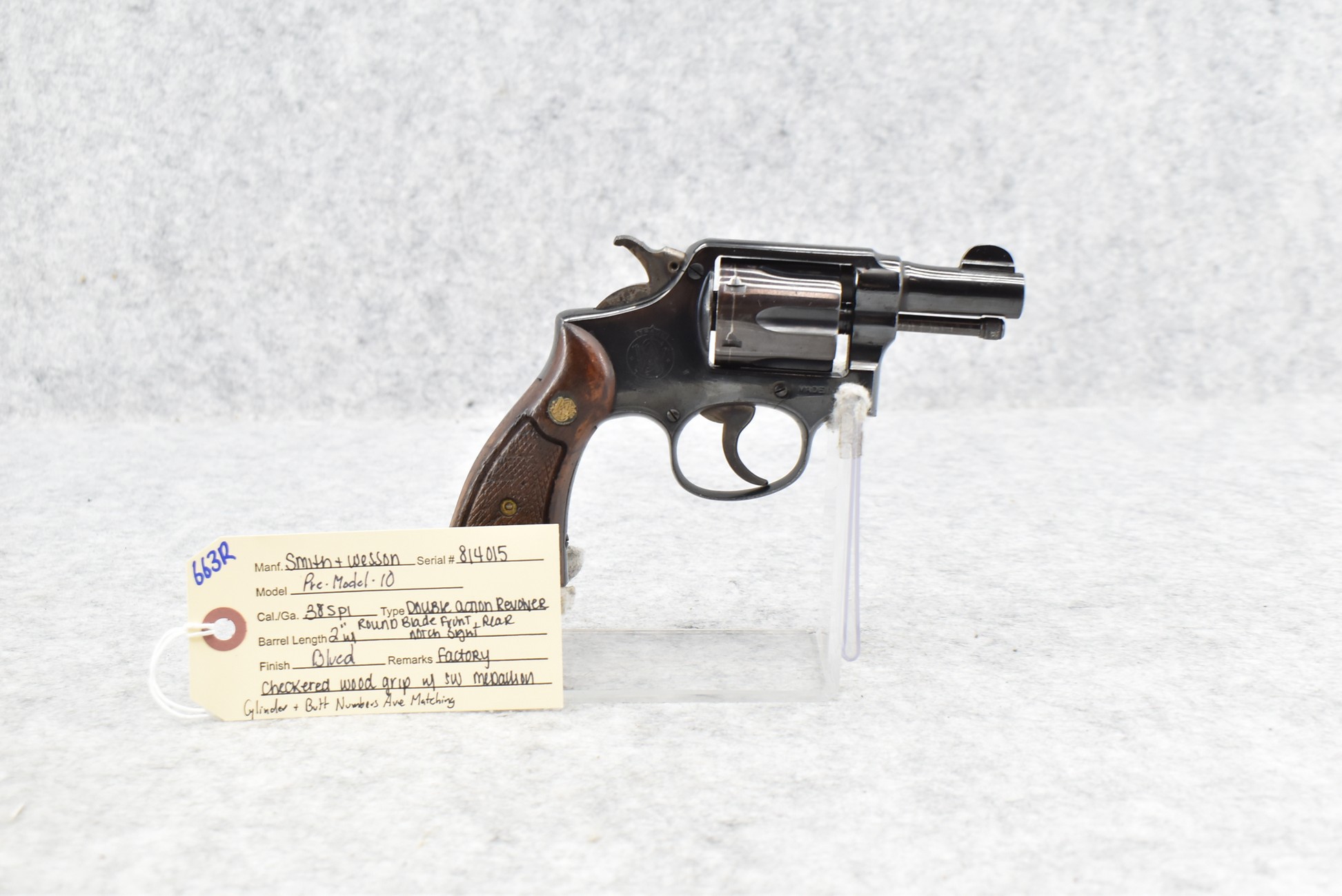663R. Smith & Wesson – Mod. Pre-Model 10 – 38 Spl. Cal. Double Action Revolver – w/2” Barrel w/Round Blade Front and Rear Notch Sights – Blued Finish – w/Factory Checkered Wood Grip w/Smith & Wesson Medallion – Cylinder and Butt Numbers are Matching