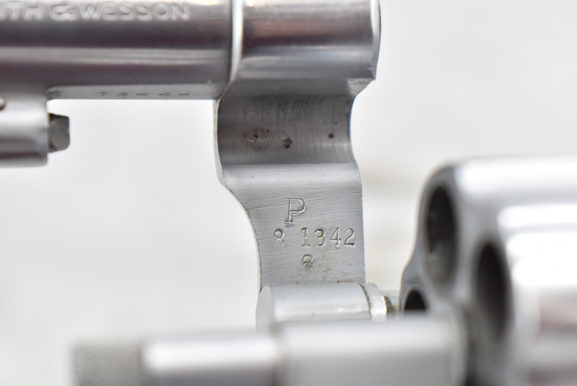 666R. Smith & Wesson – Mod. Pre 36 “Chiefs Special” – 38 Spl. Cal. Double Action Revolver – w/2” Barrel w/Ramp Blade Front and Rear Notch Sights – Stainless Finish – w/Diamond Checkered Wood Grips w/S&W Medallion – 4-Screw – w/Bobbed Hammer – Barrel, Cylinder, and Butt Numbers are All Matching! – Circa 1955