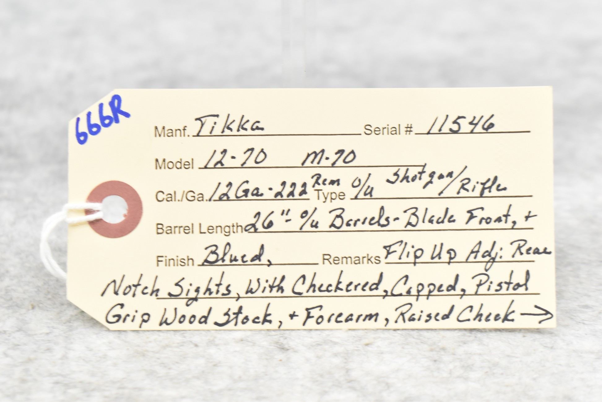 666R. Tikka – Mod. 12-70 – 12ga./222 Rem. Cal. Over-Under Rifle/Shotgun Combo – w/26” Barrels w/Blade Front and Adjustable Flip-Up Rear Notch Sights – Blued Finish – w/Checkered Capped Pistol Grip Wood Stocks w/Raised Cheek Rest and Factory Butt Plate – w/Frame Mounted Barrel Selector – w/Sling Loops