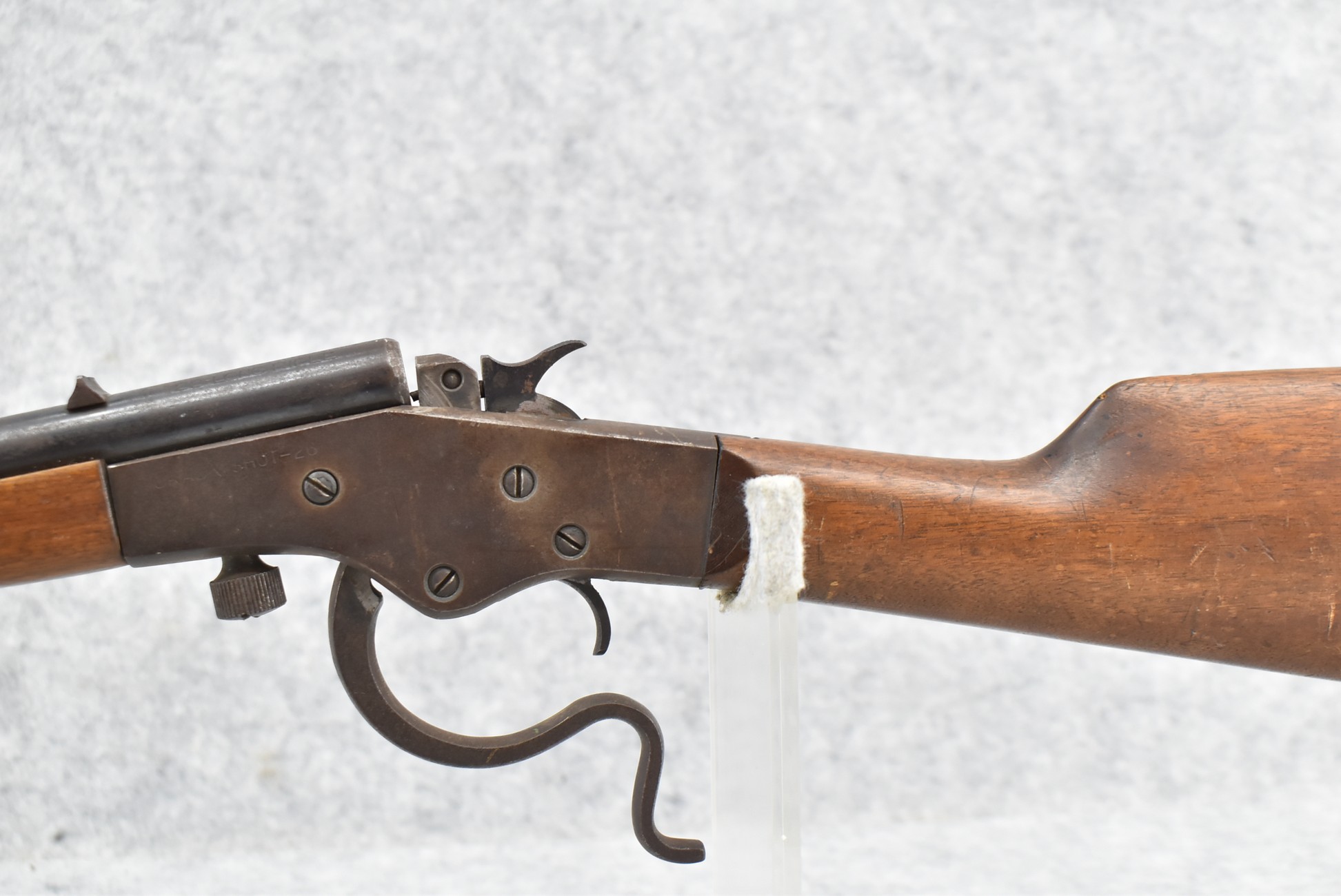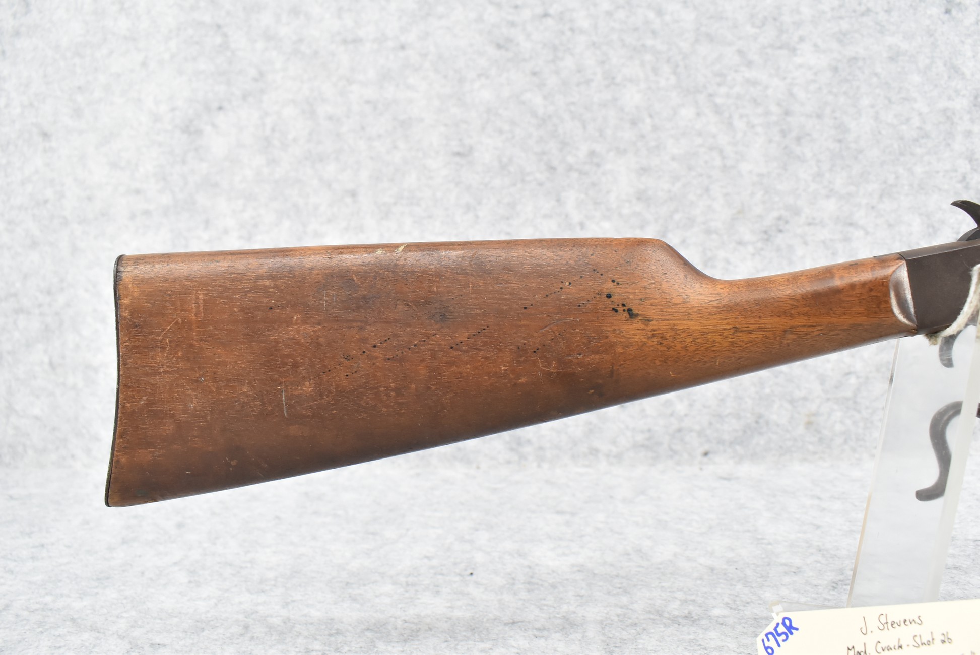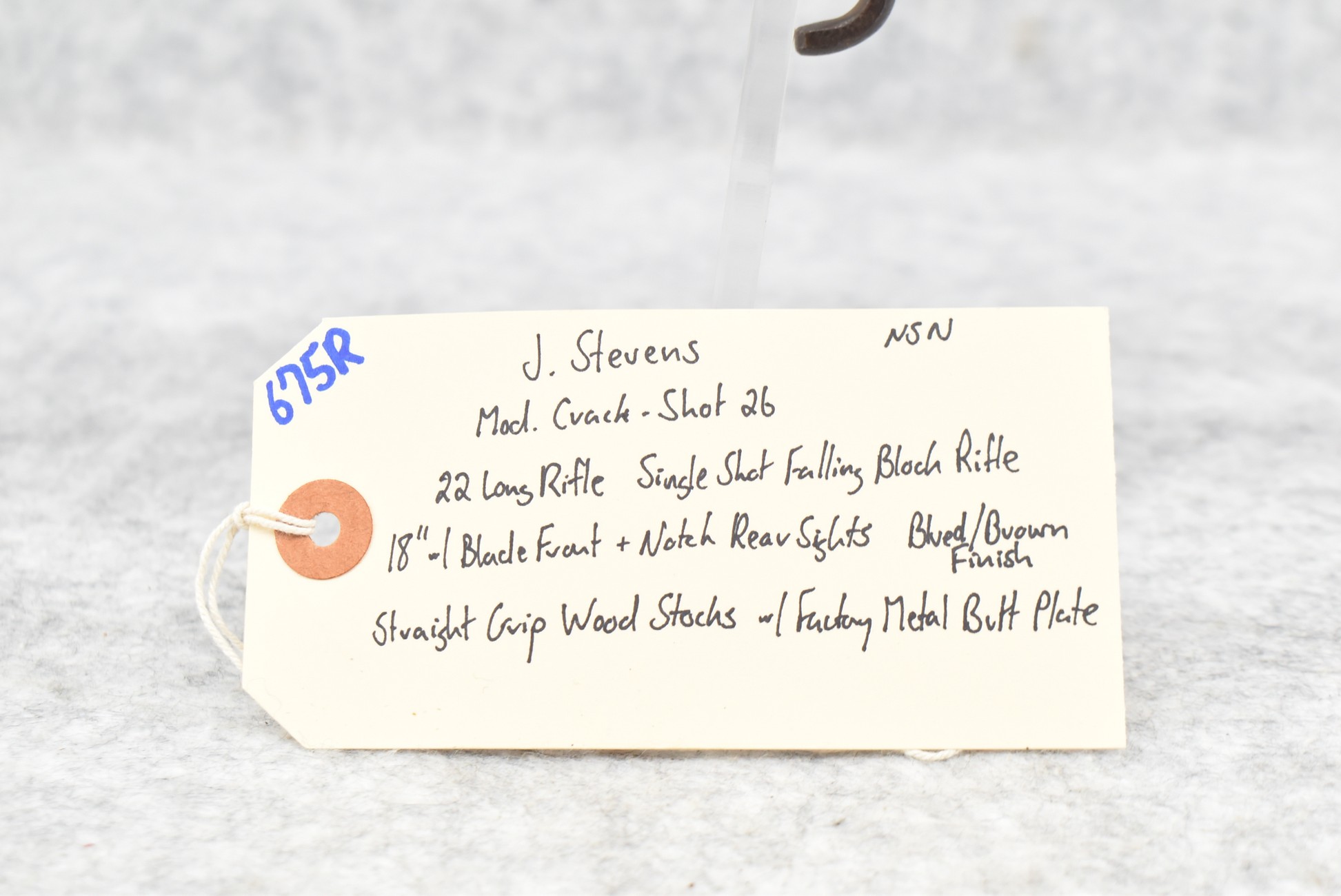 675R. J. Stevens – Mod. Crack Shot 26 – 22 LR Cal. Single Shot Falling Block Rifle – w/18” Barrel w/Blade Front and Rear Notch Sights – Blued/Brown Finish – w/Straight Grip Wood Stocks w/Factory Metal Butt Plate
